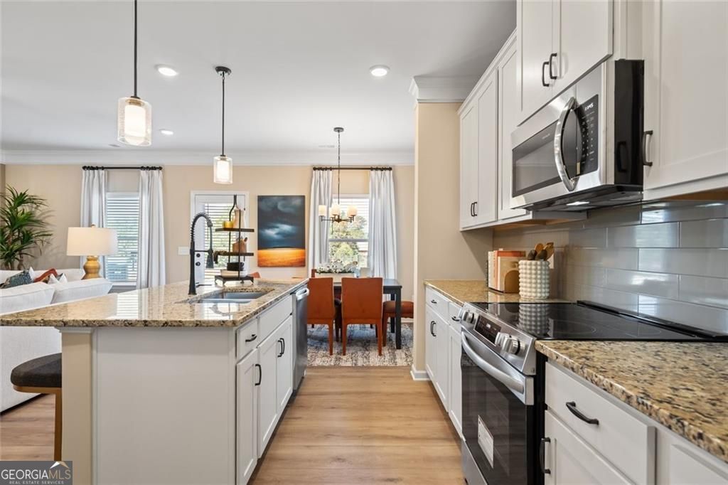 Move in Ready! The Norwood II plan, located in Smith Douglas Homes Sterling at The Villages. This end unit is the very LAST Norwood II in the community! The former model home boasts an open concept living-kitchen-dining combination. Family room with modern linear fireplace. The kitchen has upgraded cabinets with 42" uppers, stainless steel appliances including a smudge proof fridge, pantry, tile backsplash, black interior finishes (lighting and faucets) and granite counters. LVP flooring throughout the main level living area. Tile floors in bathrooms and laundry. Outdoor entertain on the back patio. An open iron rail stairway leads to the upstairs where you will find the primary suite with a substantial closet, double sinks and large tile shower. Two bedrooms, a shared bath, and loft area that makes an ideal work from home station and a convenient laundry room complete this level. Laundry cabinets, washer and dryer included! Both floors have 9ft ceiling heights. Blinds on all windows. Seller incentives with the use of our preferred lender. Photos are of actual home. You will not want to miss this opportunity!!