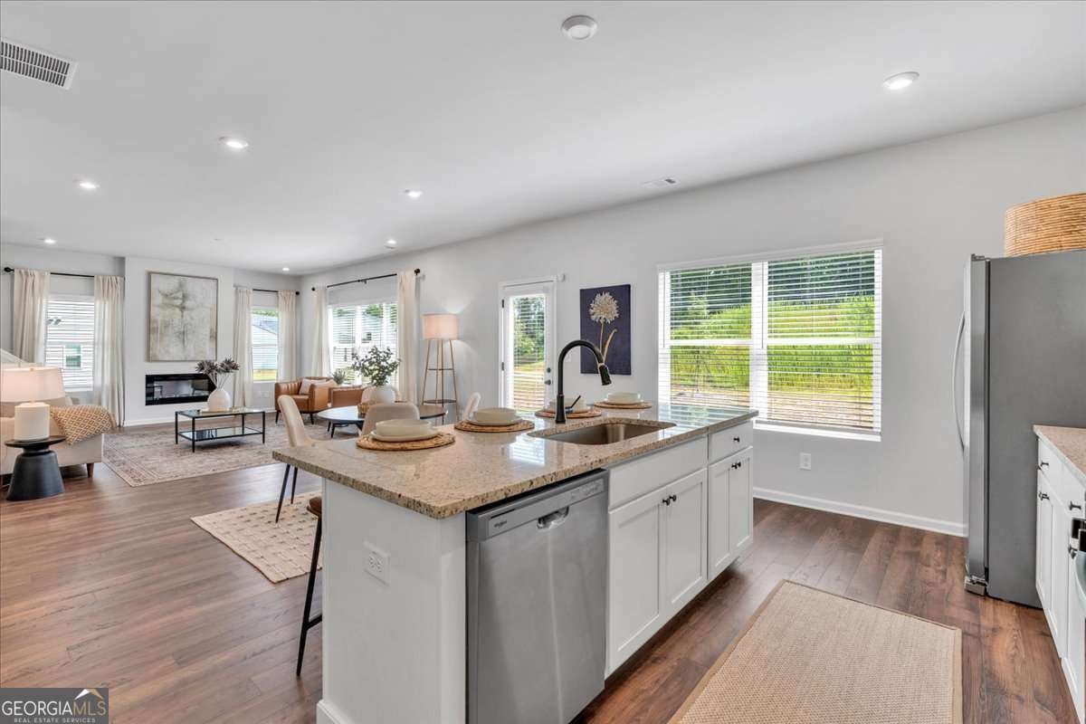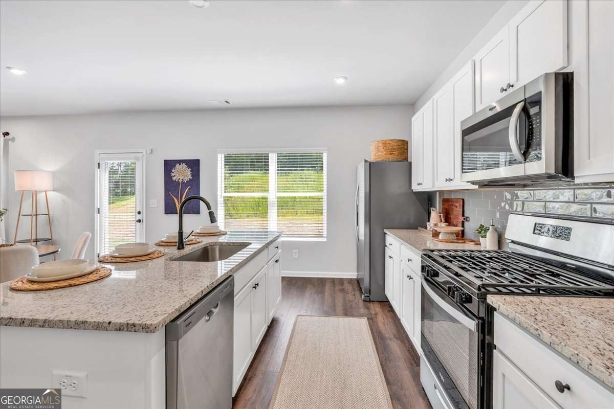 Home for the Holidays! Ready Now: The Aspen BB by Kerley Family Homes is move-in ready and offers 4 bedrooms, 2.5 baths, a private flex/study room, and an upstairs loft. The open-concept main level features a modern linear electric fireplace, spacious kitchen with large island, walk-in pantry, stainless steel appliances, and abundant cabinet space. Enjoy outdoor living with a covered patio and ceiling fan. Upstairs includes a generous owner's suite with walk-in closet, double vanity, and walk-in shower, plus three secondary bedrooms, a full bath, and laundry room with extra storage. Home includes blinds on all windows, washer & dryer, gas range, microwave, dishwasher, and side-by-side refrigerator. Located in a sought-after community with easy access to I-20, Arbor Place Mall, shopping, and dining. Builder's warranty and Pestban system included for added peace of mind.