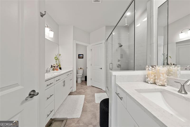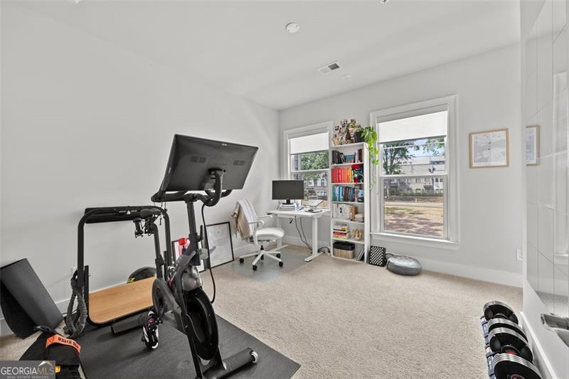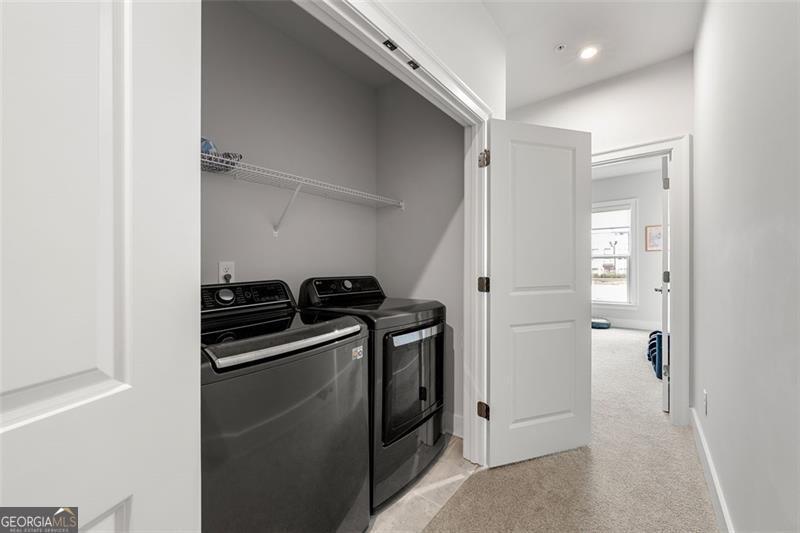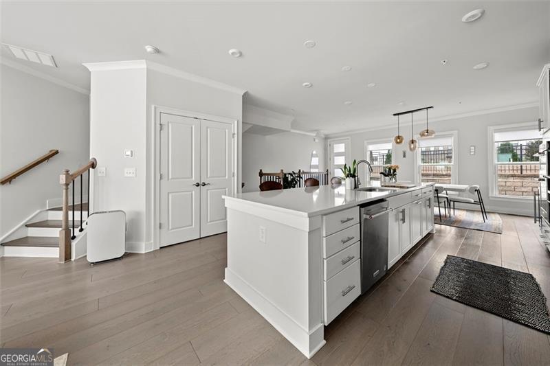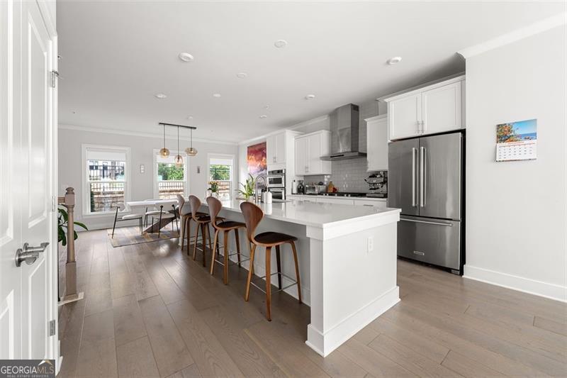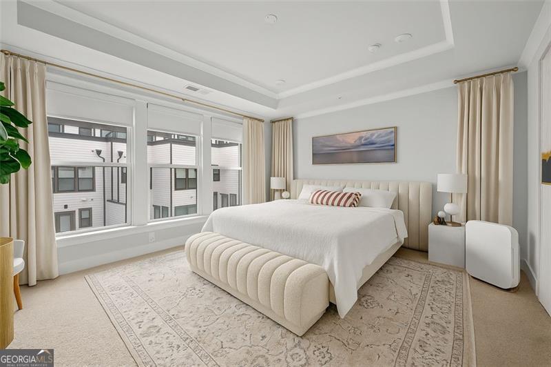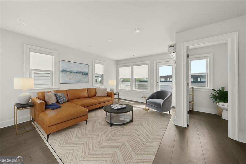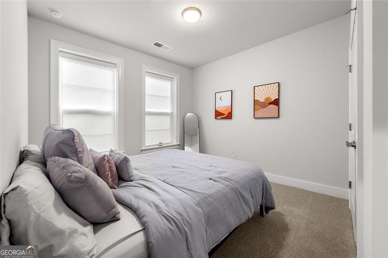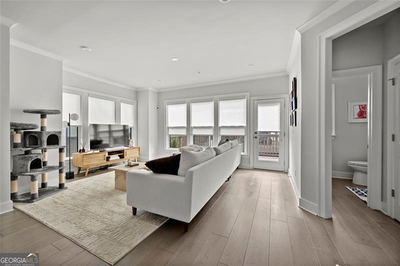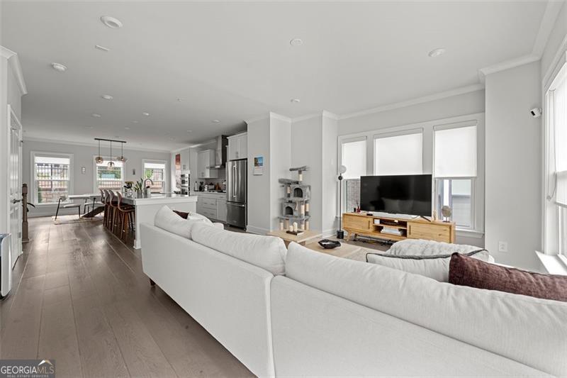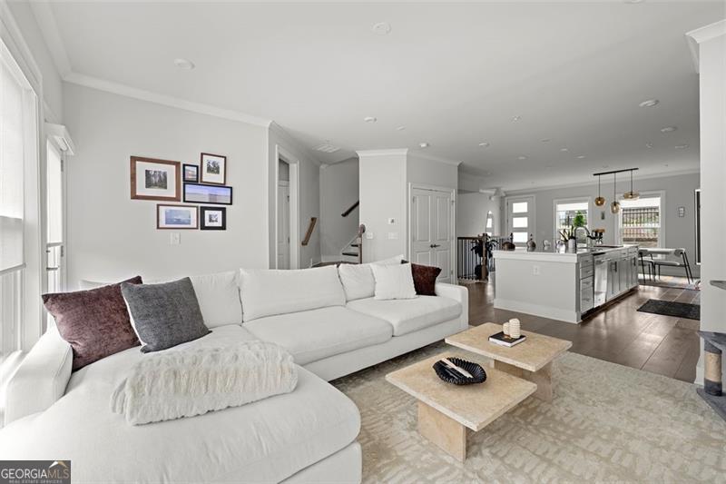 Set on a premium lot within one of Atlanta's most desirable Upper Westside communities, this end-unit townhome offers the perfect balance of upscale style, comfort, and convenience. Its unique position within the neighborhood provides rare park and skyline views, along with a sense of privacy and quiet that makes it feel like a retreat in the middle of it all. Built in 2022, this home feels better than new-lightly lived in, low-maintenance, with most rooms and bathrooms barely used-and includes upgrades throughout that go far beyond standard builder features. The spacious open-concept main level is ideal for gathering and entertaining. The many windows, including a bay window, fill the space with natural light, while the chef's kitchen features a KitchenAid Gourmet stainless steel package with a 36" gas cooktop, chimney hood, built-in oven and microwave, a stunning oversized quartz island, LED under-cabinet lighting, and modern soft-close cabinetry. Throughout the home, you'll find upgraded gray engineered wood floors, oak tread stairs with painted risers, iron balusters, and modern cabinetry, lighting and hardware. Additional highlights include sleek LEVOLOR roller shades on all windows, crown molding at the entry, and a smart security system with app-based control. Upstairs, the primary suite offers plenty of space with high style finishes such as tray ceiling, crown molding and two walk-in closets, and a spa-style bath featuring quartz countertops, a waterfall shower with Jolie filter, and floor-to-ceiling tile for a relaxing escape. Each secondary bedroom includes full privacy with its own full bathroom, perfect for guests, family, or a home office. On the top floor, a multifunctional loft space opens to a rooftop deck with garden lighting, a great spot to relax or host and take in the community and skyline views. With a two-car garage with electric car charger, like-new condition without the punch list, and a prime location directly across from the park and near the resort-style pool, this home stands out as one of the most desirable offerings in Upper West Midtown. Just minutes from The Path, The Works, Westside Park, and Westside Provisions District, this is the ideal blend of modern sophistication, privacy, and lifestyle.