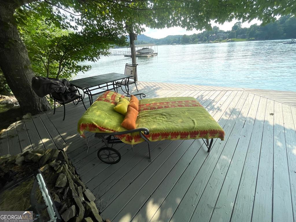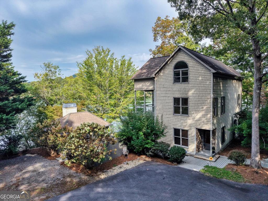 Located on the dead end of Leisure Lane in Hiawassee GA, this stunning lakefront retreat sits on the edge of Lake Chatuge with year round deep water access. This 3-bedroom, 3.5-bath home features an open kitchen and living room design, A stack stone gas fireplace anchors the space, complemented by abundant natural light. Every room in this well appointed home has views of the lake below. The spacious primary suite has a porch overlooking the lake below and is a perfect spot for unwinding after a soak in the garden tub. Enjoy three levels with private bedroom porches, sunroom sitting areas, and breathtaking mountain views of unspoiled TVA lands. The private setting is surrounded by mature hardwood trees and native mountain foliage. The deep water lot includes an easy acess covered dock with a swim platform and party deck. A lakeside sitting area is the ultimate napping spot. The large deck with covered outdoor fireplace, 1/2 bath, and storage area is ideal for family gatherings. A perfect blend of luxury and nature.