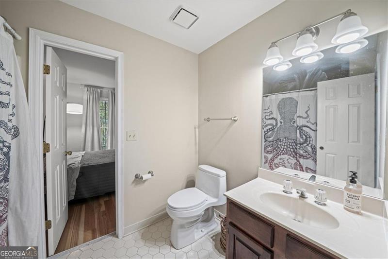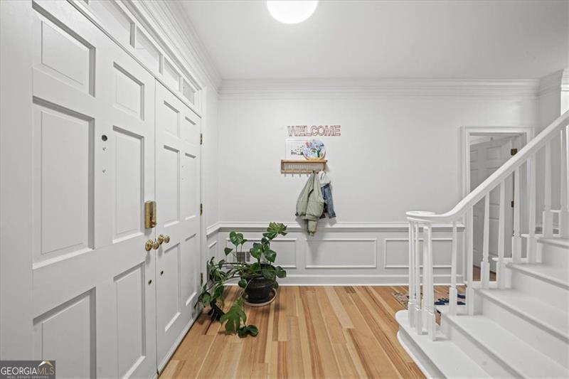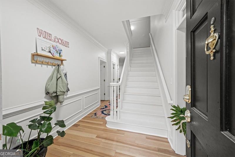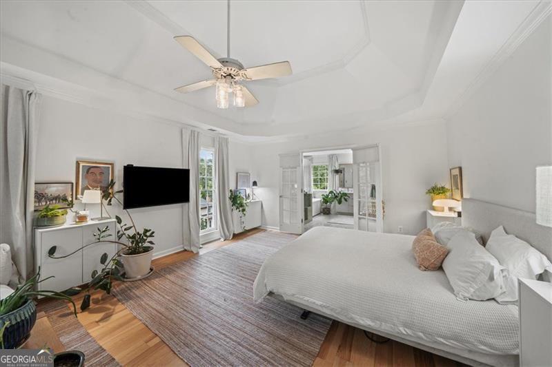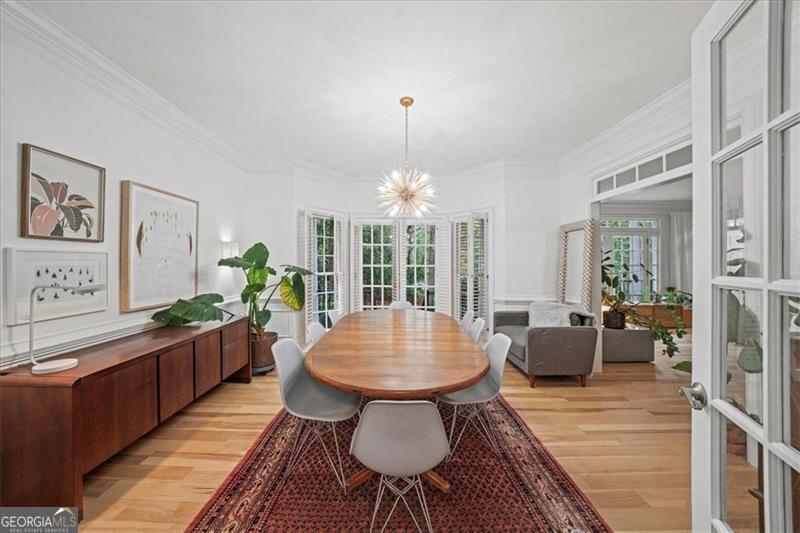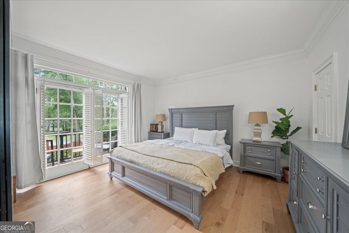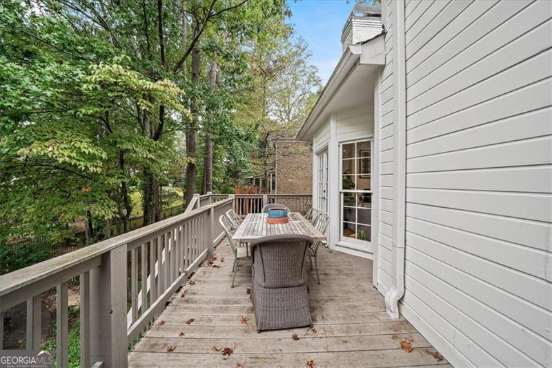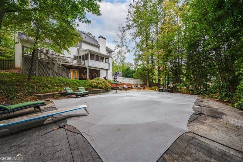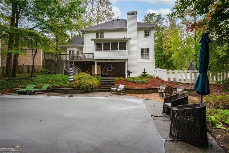 Beautifully updated East Cobb gem in the sought-after Pope High district! This three-sided brick traditional sits on a large, wooded lot and features elegant wrought-iron railings, french doors, and a welcoming double-door entry. Inside, you'll find hickory hardwood floors throughout, intricate molding and wainscoting, and abundant natural light. The renovated kitchen boasts modern cabinetry, sleek countertops, and stainless-steel appliances, open to a fireside keeping room. A main-level bedroom with en suite bath adds flexibility for guests or office space. Upstairs offers two spacious secondary bedrooms, an updated laundry room, and a stunning primary suite with tray ceilings, a spa-like bath, and a custom walk-in closet. The resort-style backyard is a true showstopper with a screened porch, expansive deck, stone patio, and private pool surrounded by mature landscaping. The finished basement, side-entry garage, and ample storage complete this impressive home. Low HOA with optional nearby swim/tennis memberships and a prime location minutes to top schools, Whole Foods, Trader Joe's, Home Depot, and dining-this one truly has it all!