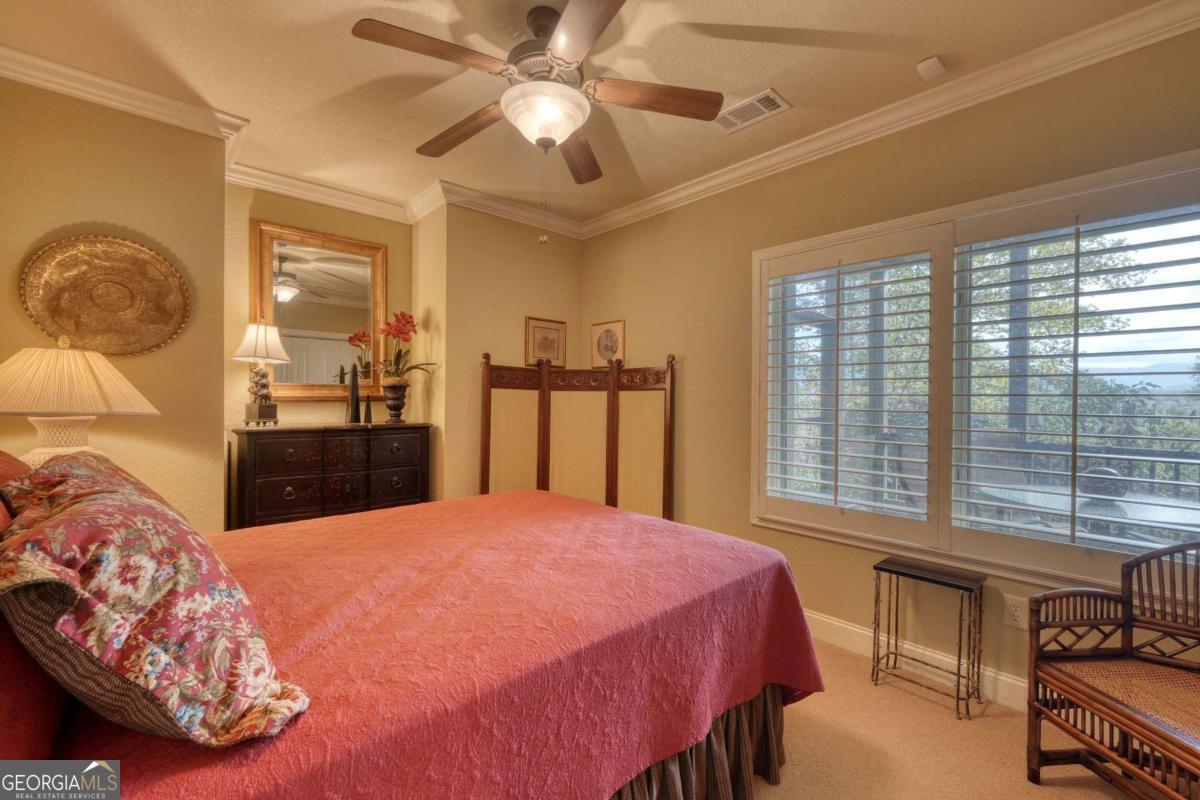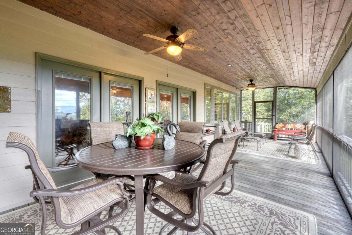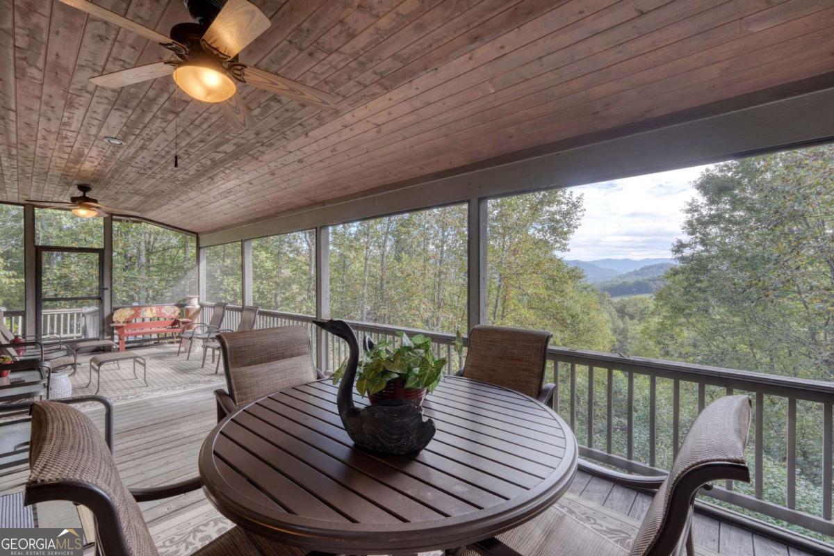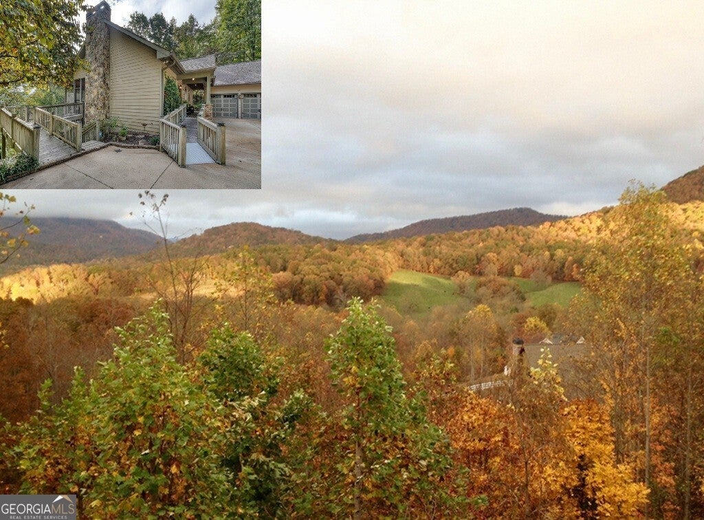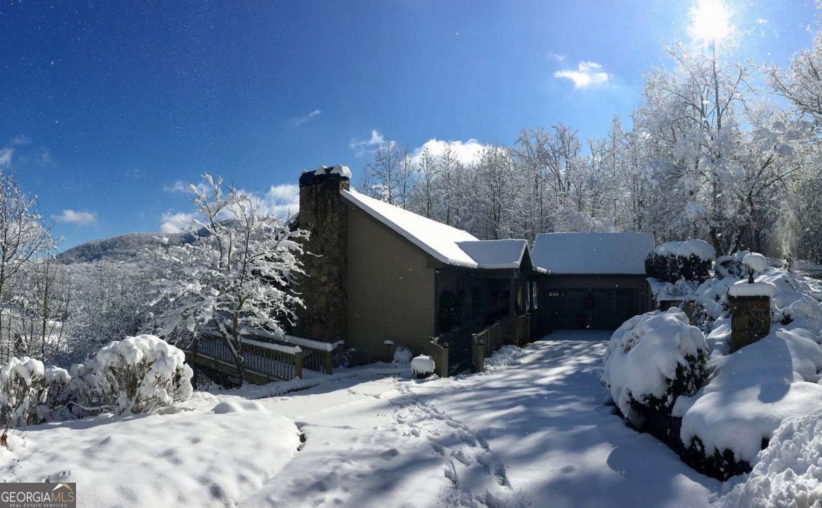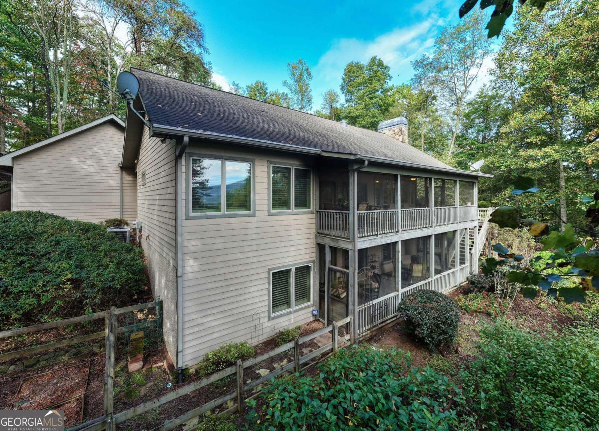 Nestled in the serene mountains of North Carolina, this meticulously maintained traditional home offers wheelchair-accessible, main-level living and captivating mountain sunrises. Move-in ready and thoughtfully designed to blend comfort and accessibility with timeless architectural charm including plantation shutters throughout and a time-saving central vac system. The main level features a spacious master suite with luxurious heated tile floors, towel warmer and roll-in shower, and the conveniently located laundry and powder room. The stunning kitchen boasts solid surface counters, ample cherry cabinetry, and a welcoming breakfast bar. Flowing into the dining room adorned with a cozy fireplace and built-in china cabinet - the space opens to an inviting family room. Abundant windows and glass doors frame the fabulous vista and lead to the upper screened porch, ideal for entertaining or relaxing and enjoying the fresh mountain air. Descend to the terrace level for two generous guest bedrooms, a full bathroom with heated tile floors and towel warmer, a versatile office/bonus room, and roomy family area. This level accesses the lower covered screened porch, which opens to a fenced area on one side and a charming sitting garden on the other. The beautifully landscaped grounds burst with color year-round, featuring roses, peonies, hydrangeas, and more, creating a vibrant outdoor sanctuary. Ample storage abounds in the attached two-car garage with workshop, including access to an unfinished attic via the roadside doorway. Hard-wired for an ADT monitoring system. Enjoy peaceful seclusion, but just 10 minutes from Hayesville and Hiawassee this retreat offers easy access to shopping, dining, and all the joys of mountain living-hiking trails, boating and kayaking on Lake Chatuge, antique shops, wineries and vineyards and so much more!