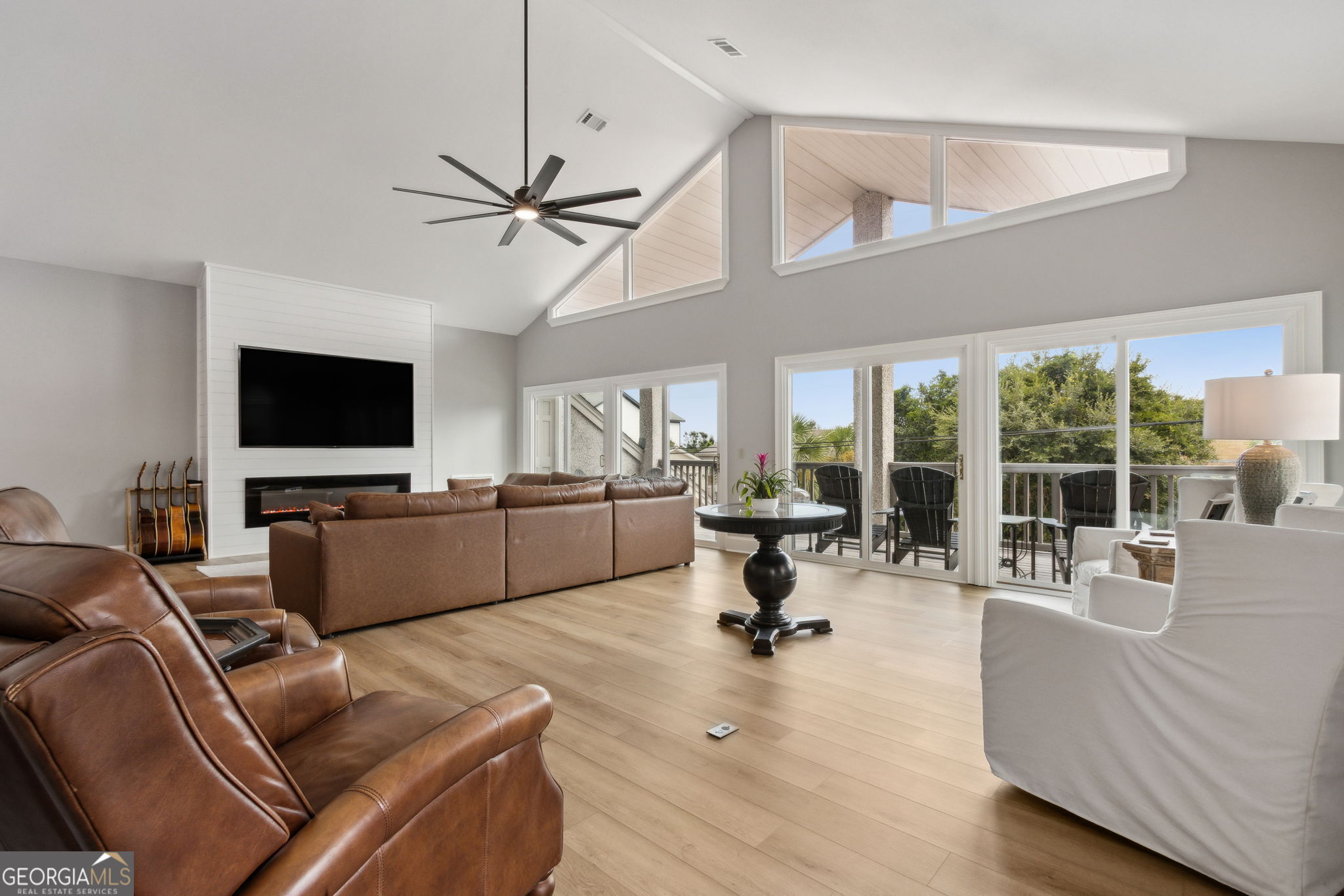 Just steps from the shoreline, this beautifully remodeled turnkey Jekyll Island retreat offers the best of coastal living. This fully furnished home provides effortless beach access and ocean views, making it an ideal primary residence, vacation home, or investment property. The open floor plan features 3 bedrooms and 3.5 bathrooms. The lower level includes two spacious guest suites, a remodeled kitchen, and an inviting living and dining area with a fireplace. Outdoor living is elevated with a private patio, outdoor shower, and lush landscaped backyard. Upstairs, accessible by both interior and exterior staircases, is a sun-filled living space with soaring ceilings, a second fireplace, wet bar, and an 85" TV. Sliding doors lead to a covered deck with expansive ocean views and direct beach access. Additional spaces include a large laundry/office flex room and another room off the carport that can be used as a fourth bedroom, owner's storage, or a guest suite. This home was fully remodeled in 2024 and comes fully furnished, including housewares. Enjoy modern coastal living with thoughtful details throughout. Opportunities to own a property of this caliber on Jekyll Island are rare.