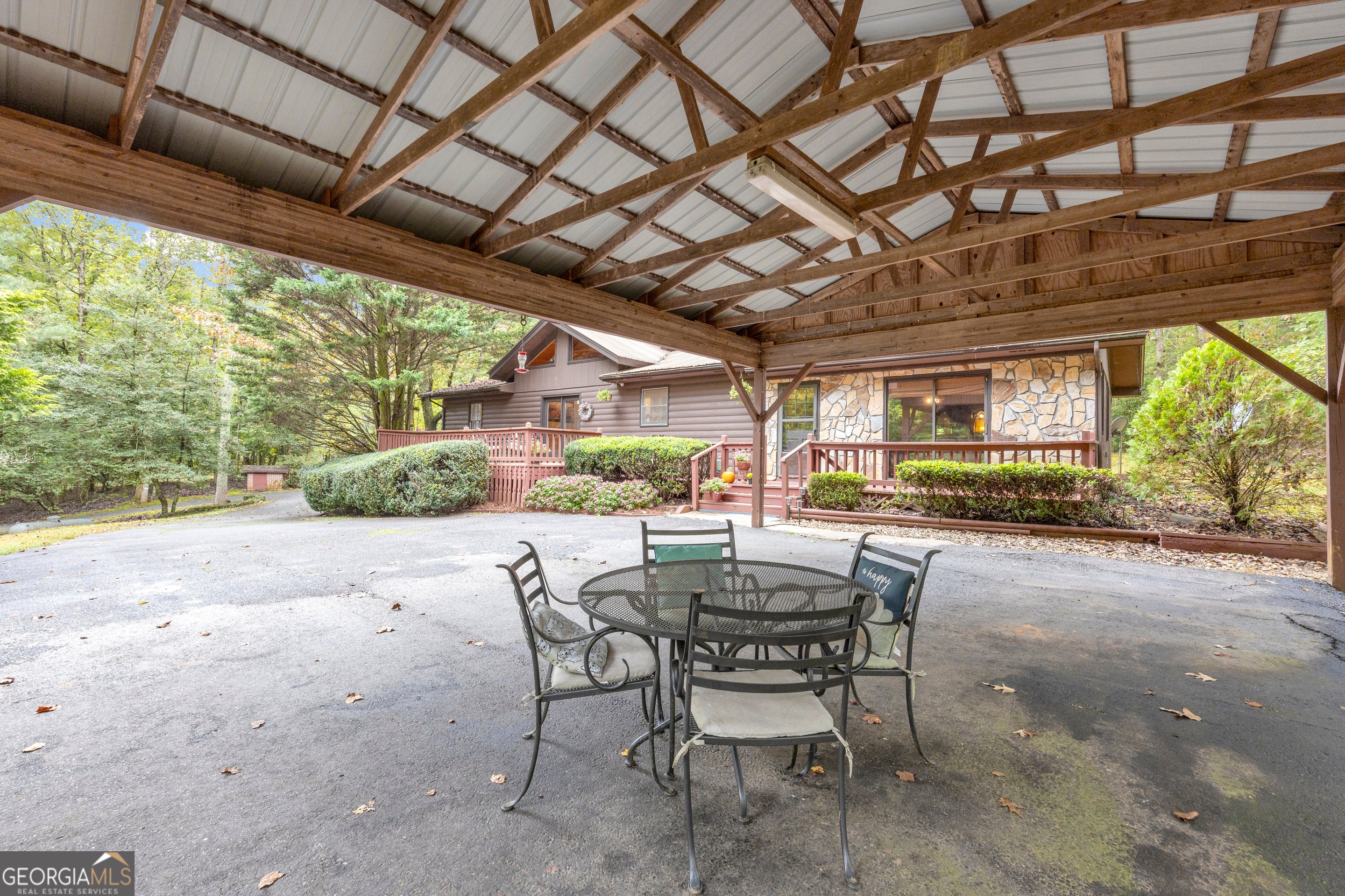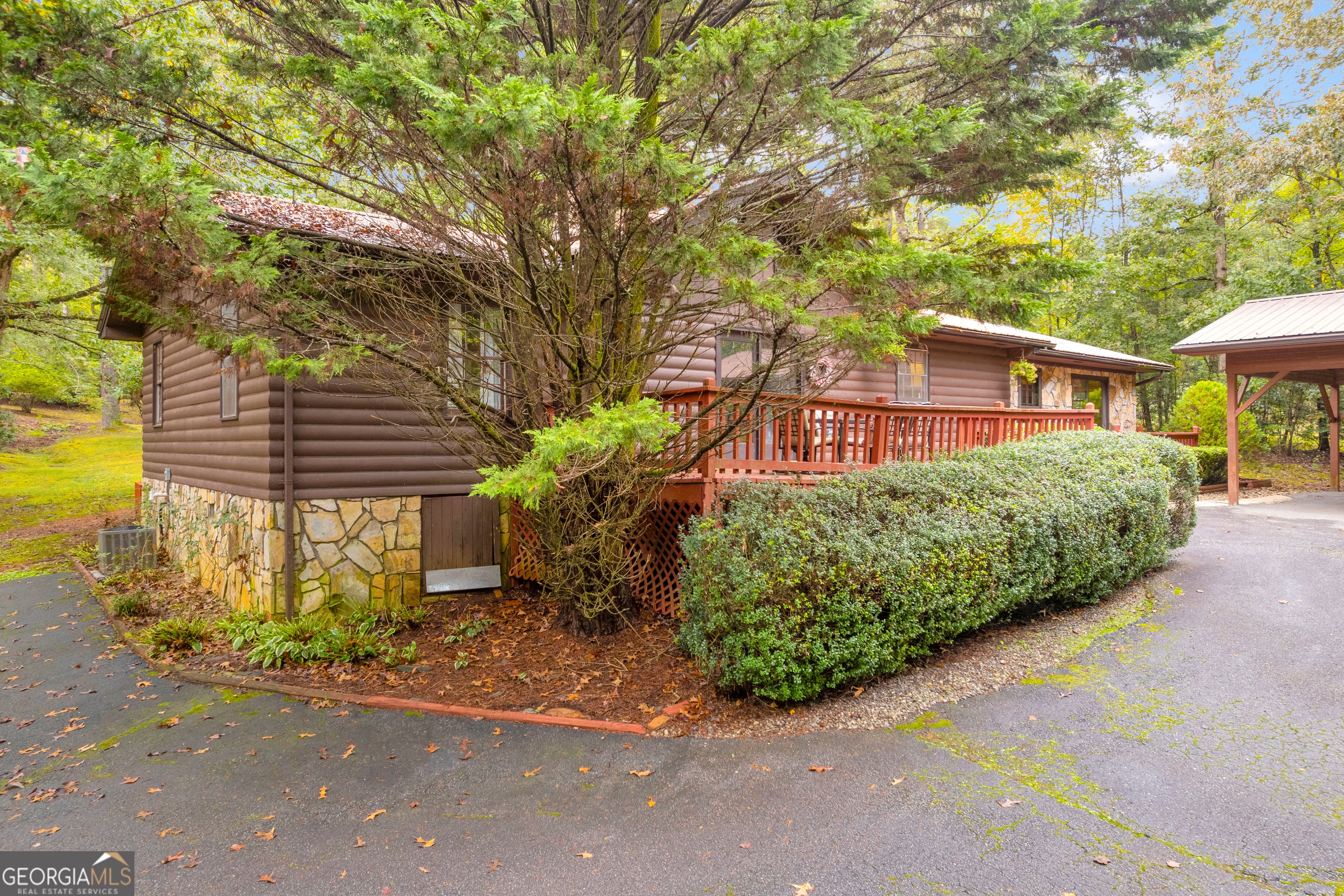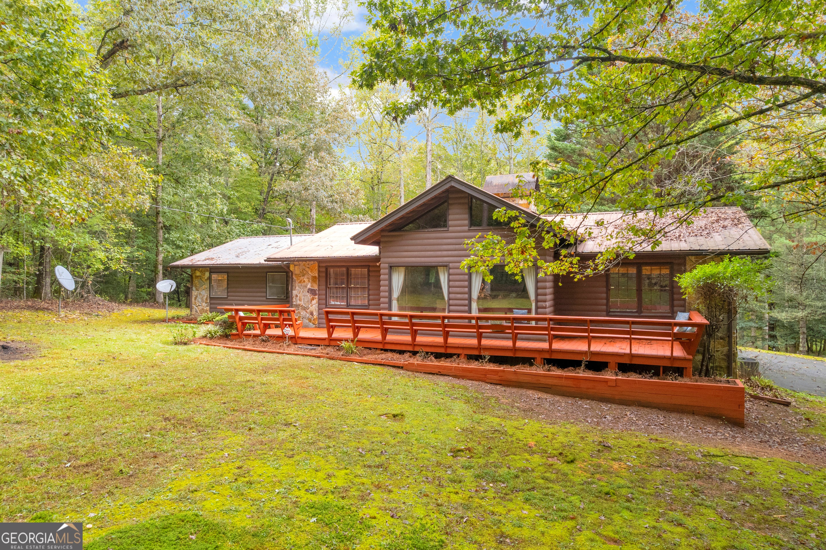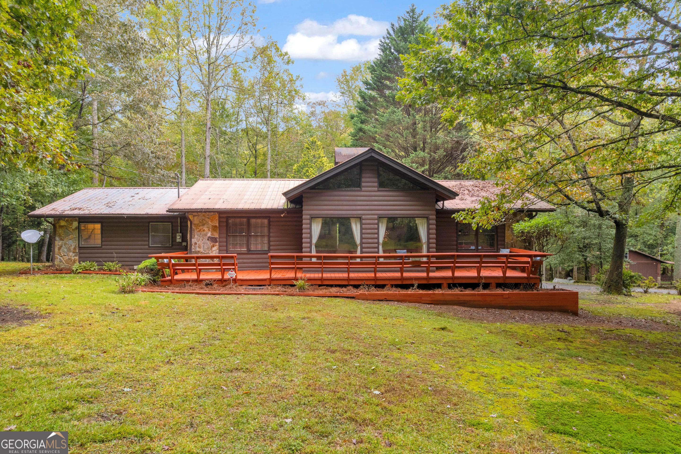 CREEKFRONT Cabin on 3.99 Acres! The perfect blend of privacy, charm, and mountain living! This one-level, log-sided cabin with a metal roof offers an inviting retreat whether you're looking for a full-time home or a weekend getaway. The setting is truly special-a beautiful, wooded lot with easy access to the playful creek, where you'll find a fun "party porch" right at the water's edge, ideal for relaxing or entertaining with friends. Inside, the four-sided stone fireplace serves as the stunning focal point of the spacious living and dining area, accented by exposed wood beams and warm wood floors. The kitchen features tasteful finishes, and there's also a large separate family room providing plenty of space for gatherings. Outside, you'll love the oversized 3+ car carport, which can easily double as an additional covered entertaining space. The detached garage/workshop offers extra storage and room for hobbies, plus there's a tool shed and additional carport for even more convenience. This property includes two adjoining lots-keep both for added privacy, or build another cabin, sell one, or even gift a lot to family. A rare find-creekfront living, privacy, and versatility all in one beautiful mountain property!