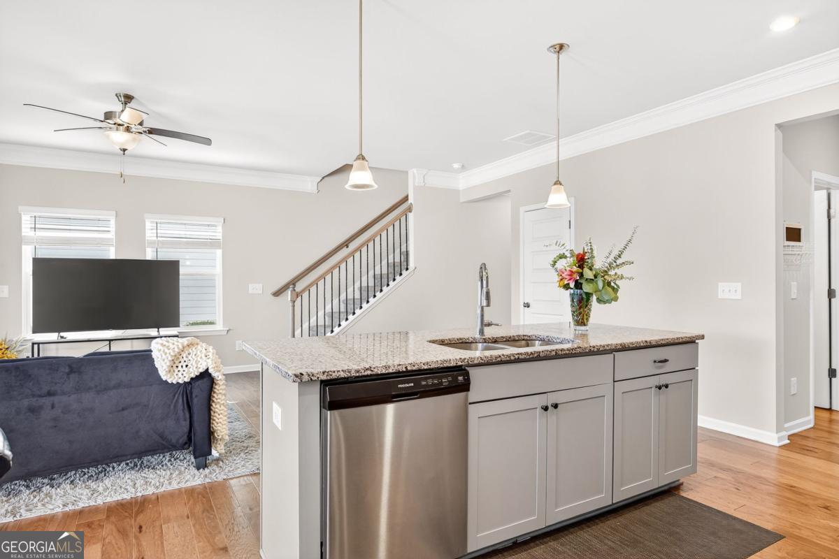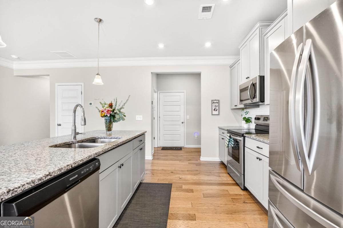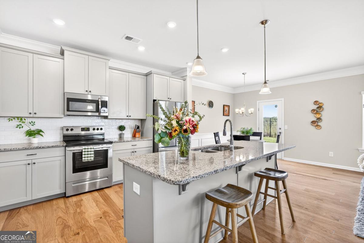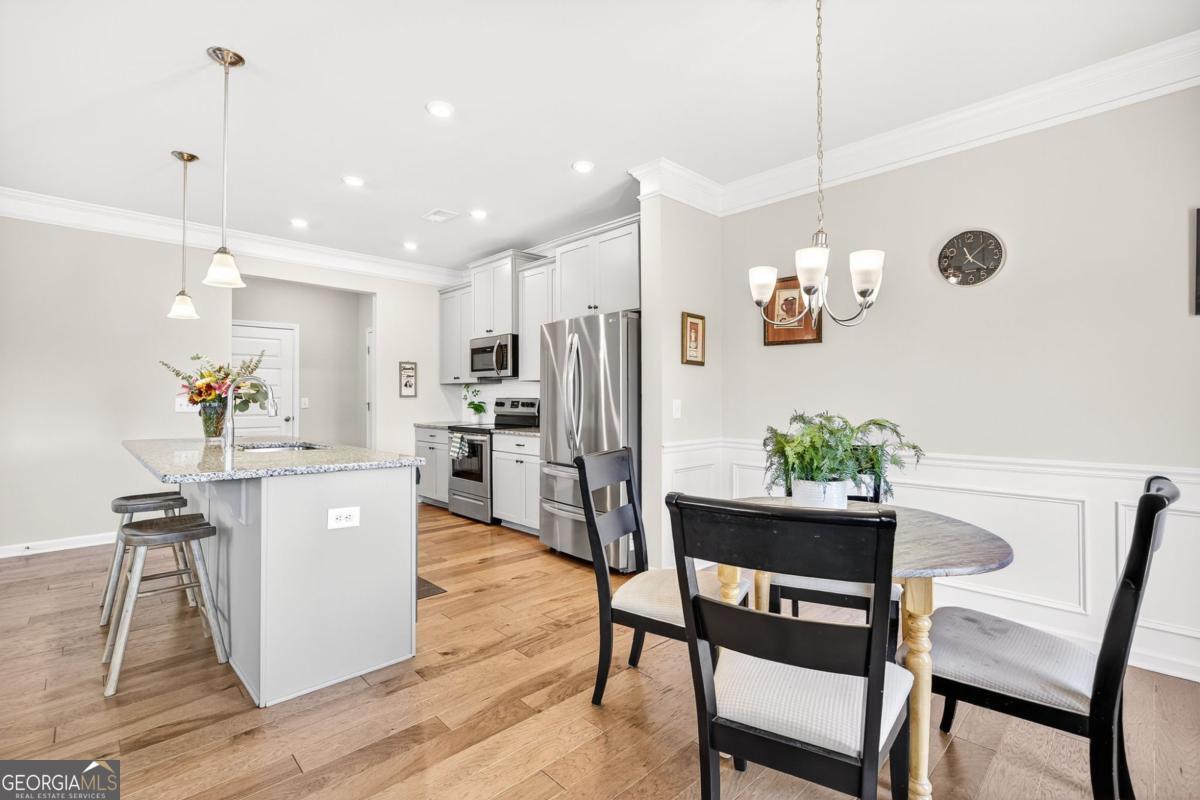 133 Madison Bend- a beautiful townhome in a prime Woodstock location. Welcome to this stunning 5-year-old townhome, perfectly situated just half a mile from Downtown Woodstock, walking distance to the Village Shoppes of East Cherokee, and minutes from local schools and I-575 for an easy commute. Step inside to find an inviting open floor plan featuring 5" hardwood floors, a spacious kitchen with granite countertops, a large island, recessed lighting, and a walk-in pantry. The family room boasts oversized windows, crown molding, and a cozy fireplace, filling the space with natural light. Upstairs, the luxurious master suite includes tray ceilings, a spacious walk-in closet, and a spa-like bathroom with dual vanities, a walk-in shower, and private water closet. Two additional bedrooms share a full bath, and a central upstairs walk-in laundry room adds convenience. Outside, enjoy a level backyard with HOA-maintained landscaping-perfect for low-maintenance living. This home combines modern finishes, an unbeatable location, and move-in ready style. Don't miss your chance to live close to everything Woodstock has to offer!