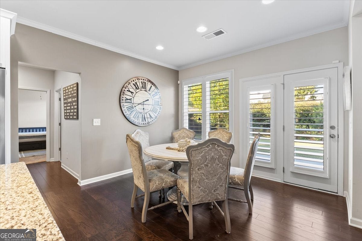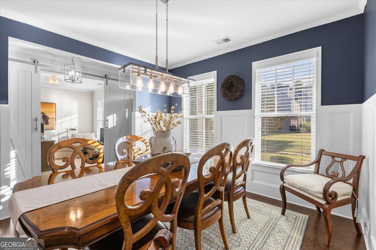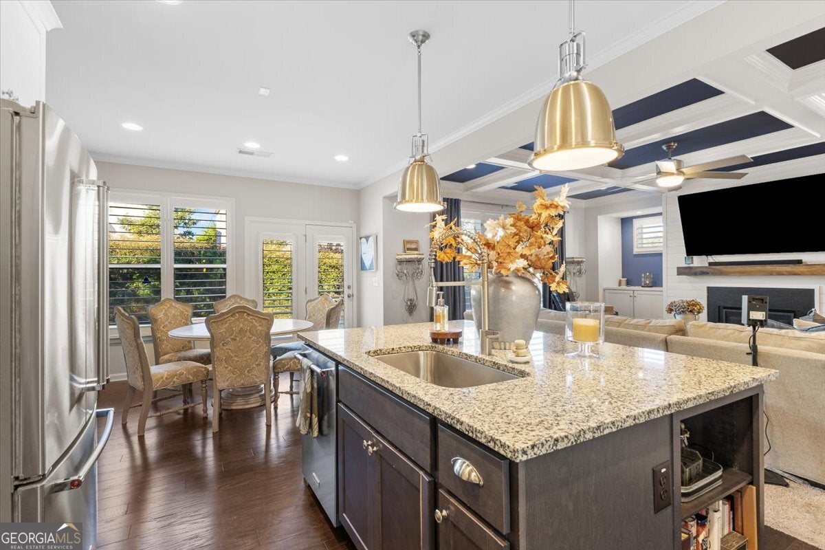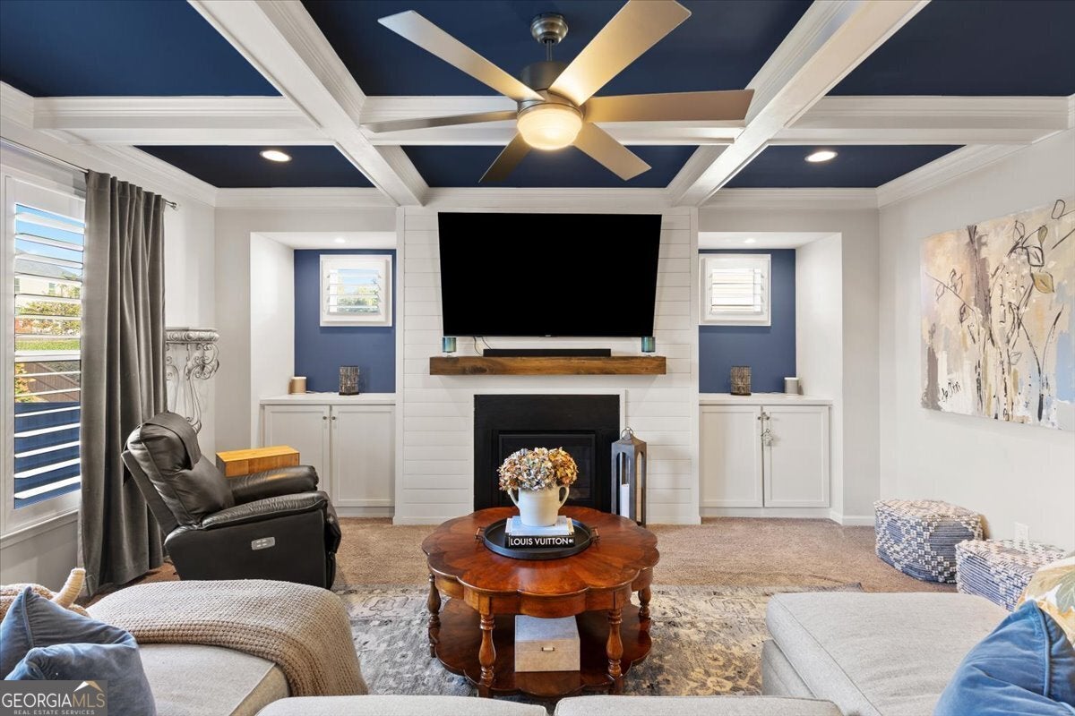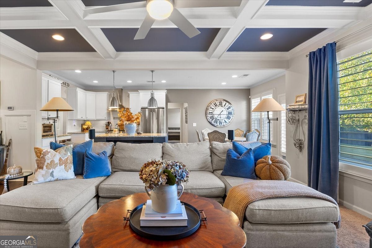 Perfectly positioned in the heart of Buford, this traditional two-story home blends timeless charm, modern comforts, and an unbeatable location. Enjoy close proximity to TOP-RATED SCHOOLS, as well as endless options for shopping, dining, and year-round entertainment. The home's brick front, distinct dormers, and covered rocking chair porch with classic columns create desirable curb appeal. Step through the NEW STEEL FRONT DOOR into an inviting foyer flanked by a formal sitting room or home office and a dining room with craftsman-style trim. A BUTLER'S PANTRY with beverage cooler connects the dining room to the open-concept great room, featuring a floor-to-ceiling ship-lap fireplace with custom built-ins, coffered ceiling, and ample space for entertaining. The eat-in kitchen is both stylish and functional with a center island and breakfast bar, HIGH-END APPLIANCES, stainless range hood, pot filler, subway tile backsplash, granite countertops, and a comfortable dining nook. Updated lighting throughout the main level adds warmth and character to every space. Off the garage, the mudroom serves as a practical drop zone for daily living. A MAIN LEVEL BEDROOM and full bath with a ship-lap accent wall offer an inviting space for guests or multi-generational living. Upstairs, a spacious landing leads to the OVERSIZED PRIMARY SUITE, highlighted by a tray ceiling, double vanity, walk-in shower with two shower heads, garden tub, and dual closets. Two additional bedrooms, a full bath, and a convenient upstairs laundry room provide comfort and convenience. The BONUS ROOM, currently serving as a media room, comes complete with custom lighting and a FULL MEDIA SYSTEM for movie nights or game days. Additional features include barn doors, plantation shutters, hardwood flooring, and new soft-close toilets in all bathrooms for thoughtful touches that elevate the home's overall design and livability. Step outside to a spacious EXTENDED PATIO overlooking the LEVEL BACKYARD, ready to be customized into an outdoor area you love. Whether you envision a cozy fire pit, lounge area, or space to dine under the stars, this property offers the perfect layout for enjoying every season. Spend weekends at Bogan Park, on nearby golf courses, or take a short drive to Lake Lanier for boating, fishing, and outdoor adventures. The community amenities enhance your lifestyle with an Olympic-style pool featuring a shallow area for little swimmers, tennis and pickleball courts, and an outdoor fireplace, perfect for relaxing or gathering with neighbors.