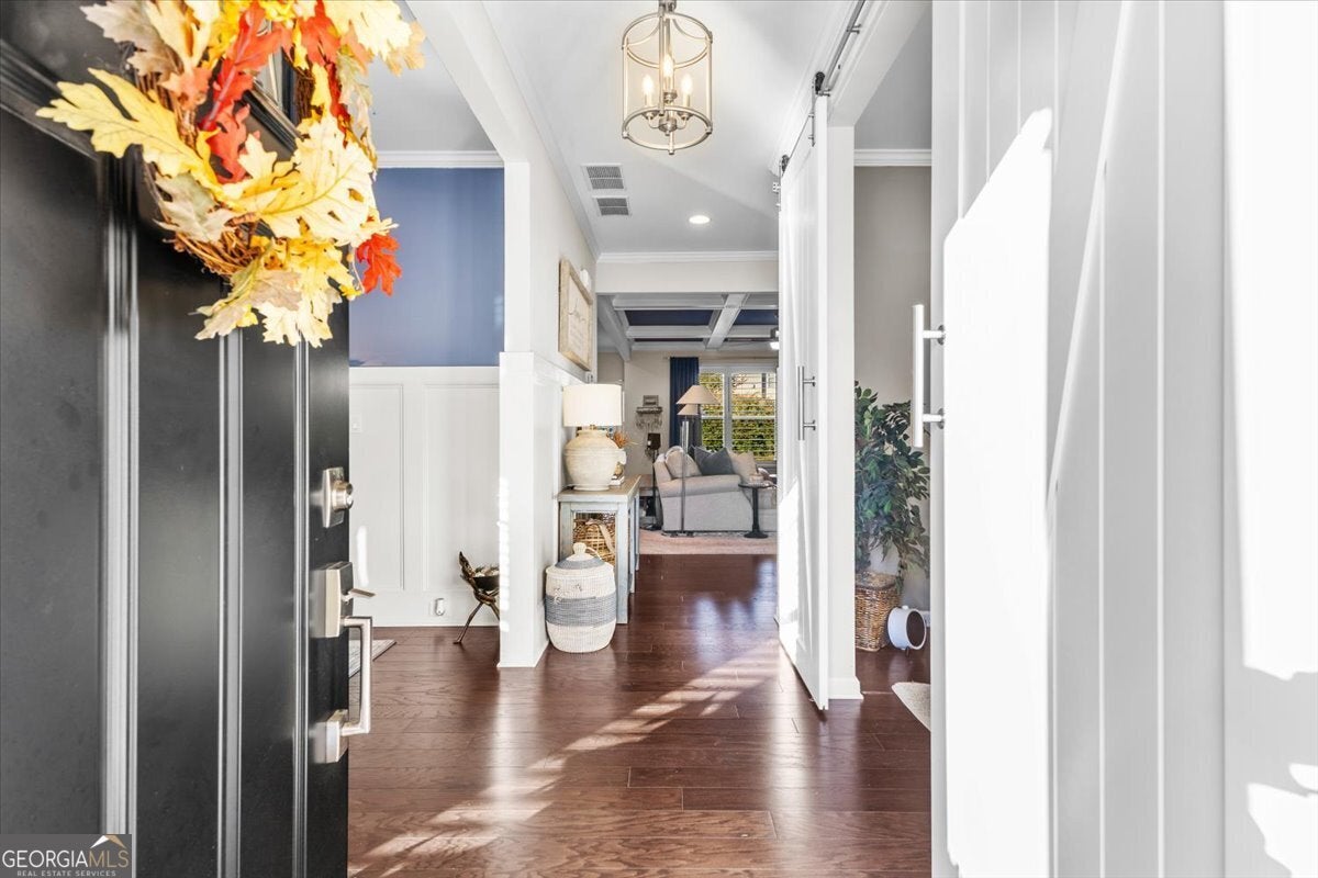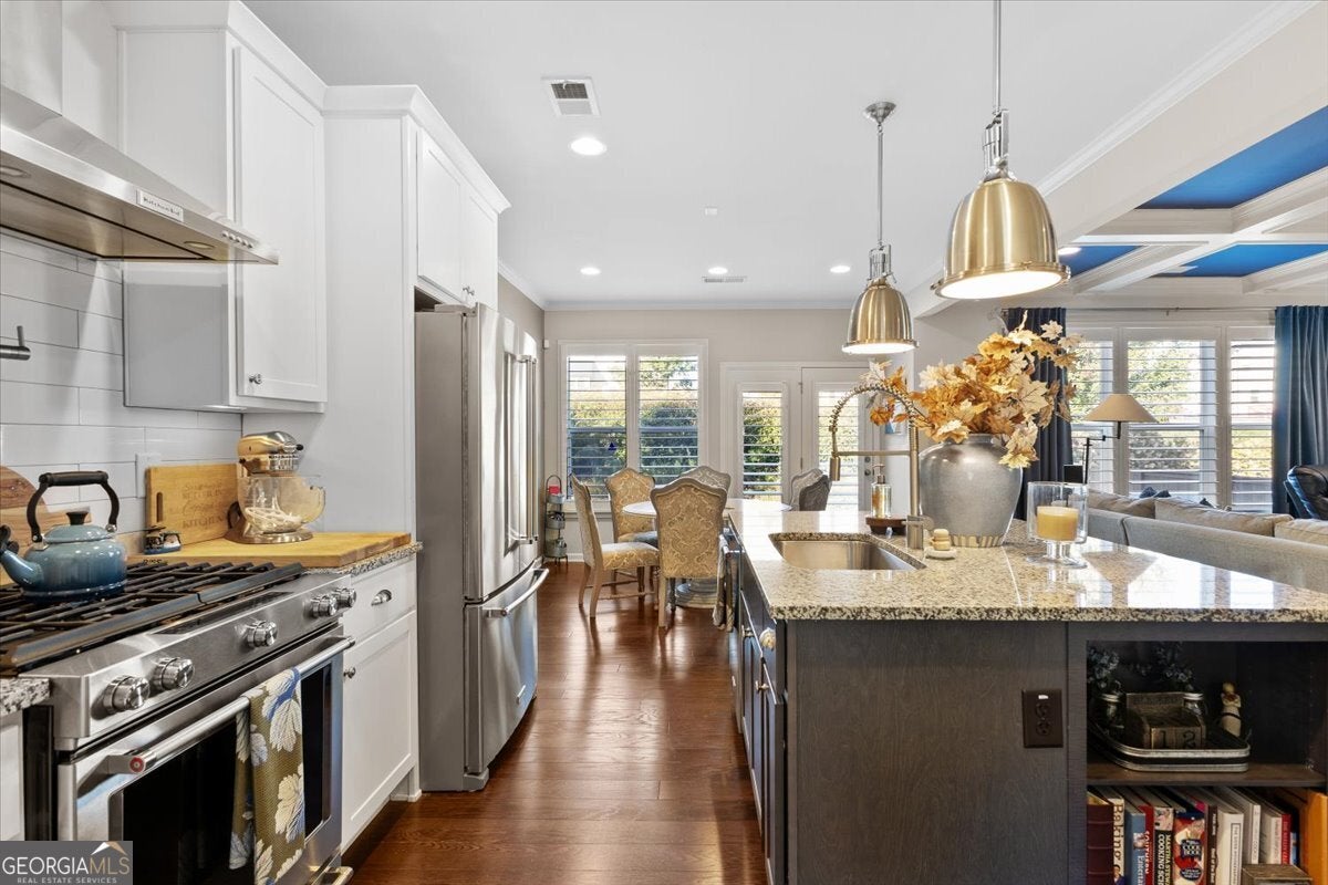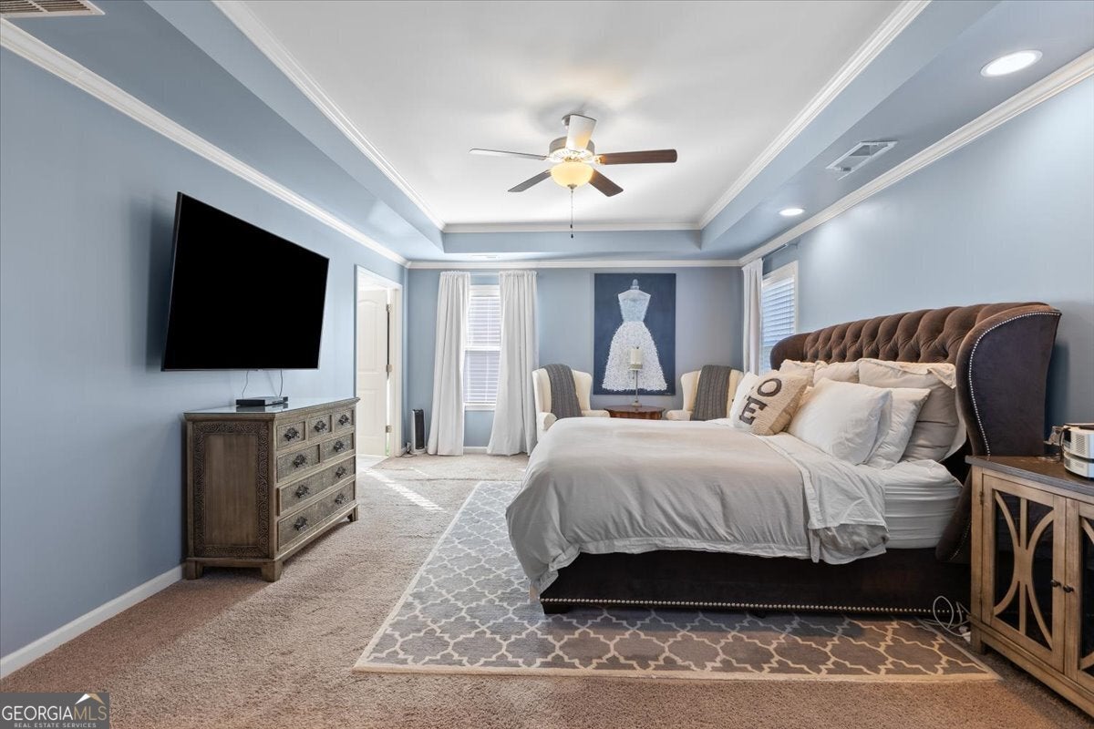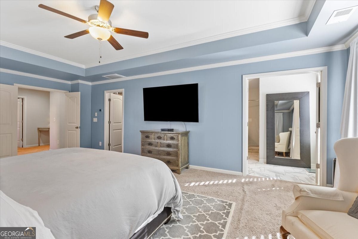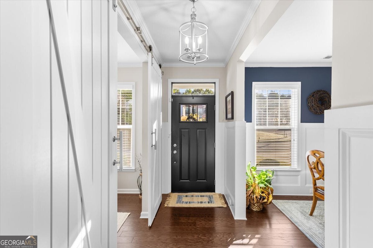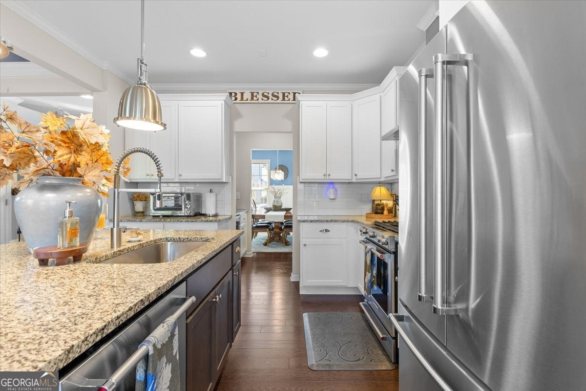 Perfectly positioned in the heart of Buford, this traditional two-story home blends timeless charm, modern comforts, and an unbeatable location. Enjoy close proximity to TOP-RATED SCHOOLS, as well as endless options for shopping, dining, and year-round entertainment. The home's brick front, distinct dormers, and covered rocking chair porch with classic columns create desirable curb appeal. Step through the NEW STEEL FRONT DOOR into an inviting foyer flanked by a formal sitting room or home office and a dining room with craftsman-style trim. A BUTLER'S PANTRY with beverage cooler connects the dining room to the open-concept great room, featuring a floor-to-ceiling ship-lap fireplace with custom built-ins, coffered ceiling, and ample space for entertaining. The eat-in kitchen is both stylish and functional with a center island and breakfast bar, HIGH-END APPLIANCES, stainless range hood, pot filler, subway tile backsplash, granite countertops, and a comfortable dining nook. Updated lighting throughout the main level adds warmth and character to every space. Off the garage, the mudroom serves as a practical drop zone for daily living. A MAIN LEVEL BEDROOM and full bath with a ship-lap accent wall offer an inviting space for guests or multi-generational living. Upstairs, a spacious landing leads to the OVERSIZED PRIMARY SUITE, highlighted by a tray ceiling, double vanity, walk-in shower with two shower heads, garden tub, and dual closets. Two additional bedrooms, a full bath, and a convenient upstairs laundry room provide comfort and convenience. The BONUS ROOM, currently serving as a media room, comes complete with custom lighting and a FULL MEDIA SYSTEM for movie nights or game days. Additional features include barn doors, plantation shutters, hardwood flooring, and new soft-close toilets in all bathrooms for thoughtful touches that elevate the home's overall design and livability. Step outside to a spacious EXTENDED PATIO overlooking the LEVEL BACKYARD, ready to be customized into an outdoor area you love. Whether you envision a cozy fire pit, lounge area, or space to dine under the stars, this property offers the perfect layout for enjoying every season. Spend weekends at Bogan Park, on nearby golf courses, or take a short drive to Lake Lanier for boating, fishing, and outdoor adventures. The community amenities enhance your lifestyle with an Olympic-style pool featuring a shallow area for little swimmers, tennis and pickleball courts, and an outdoor fireplace, perfect for relaxing or gathering with neighbors.