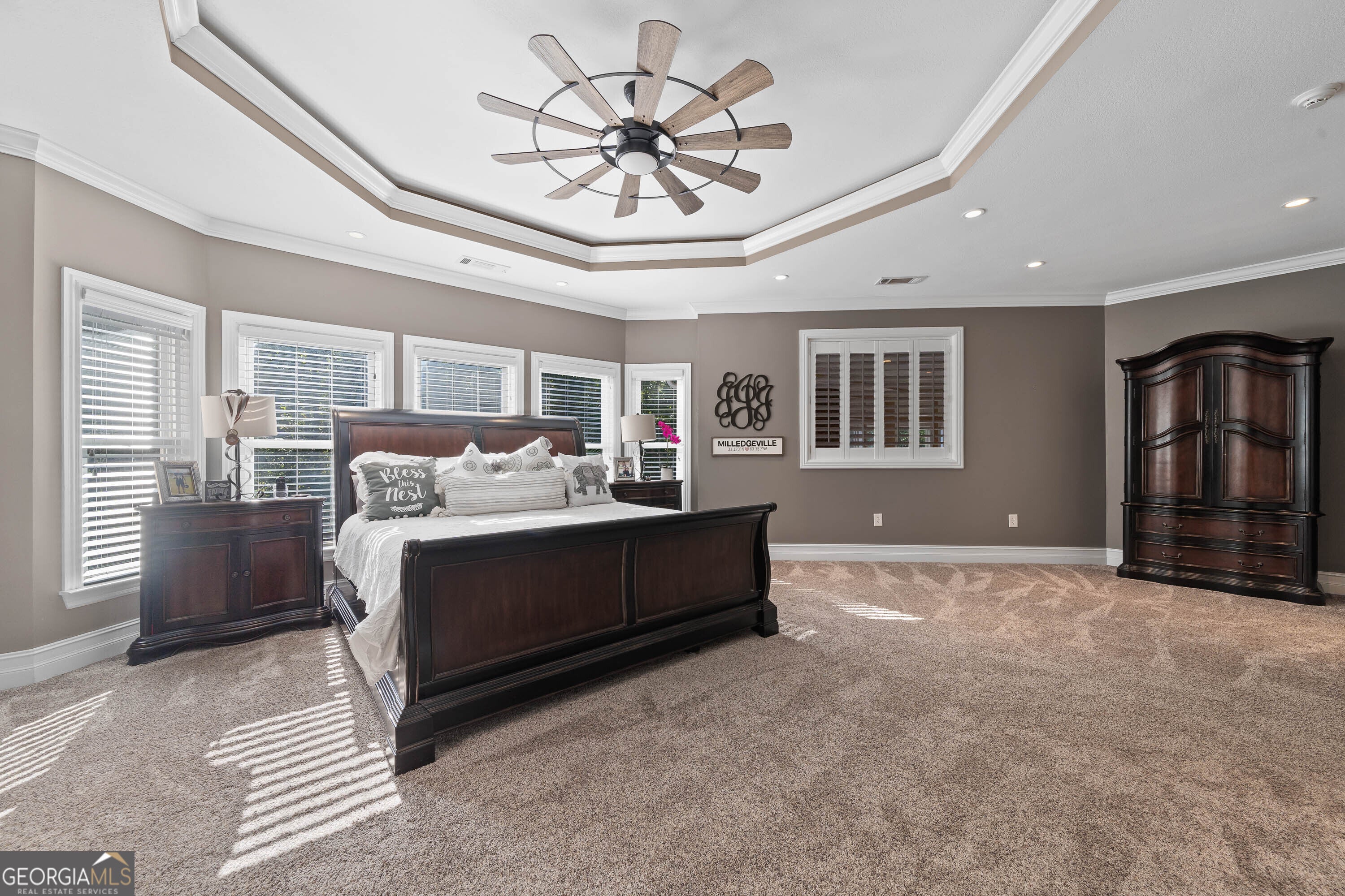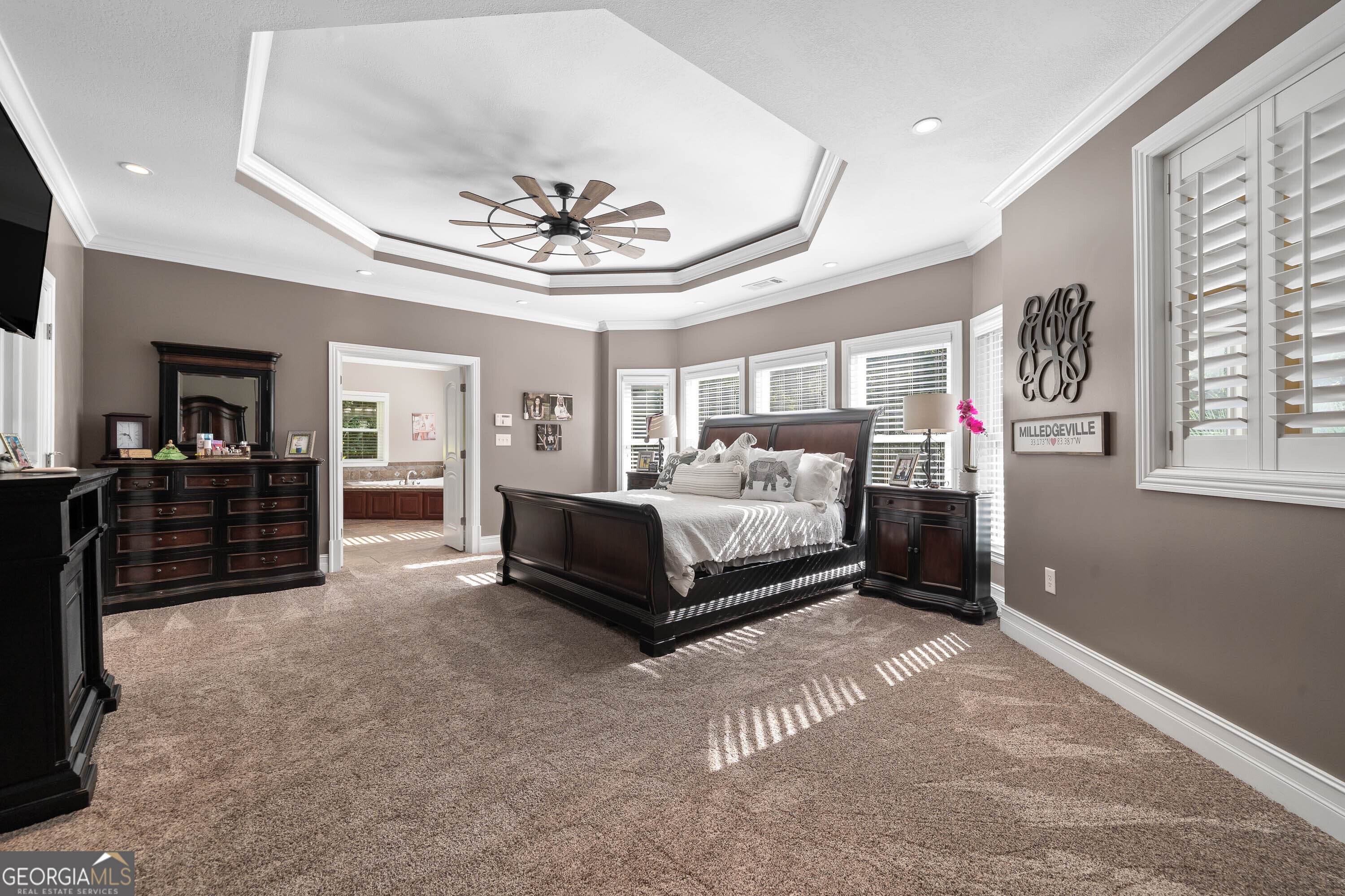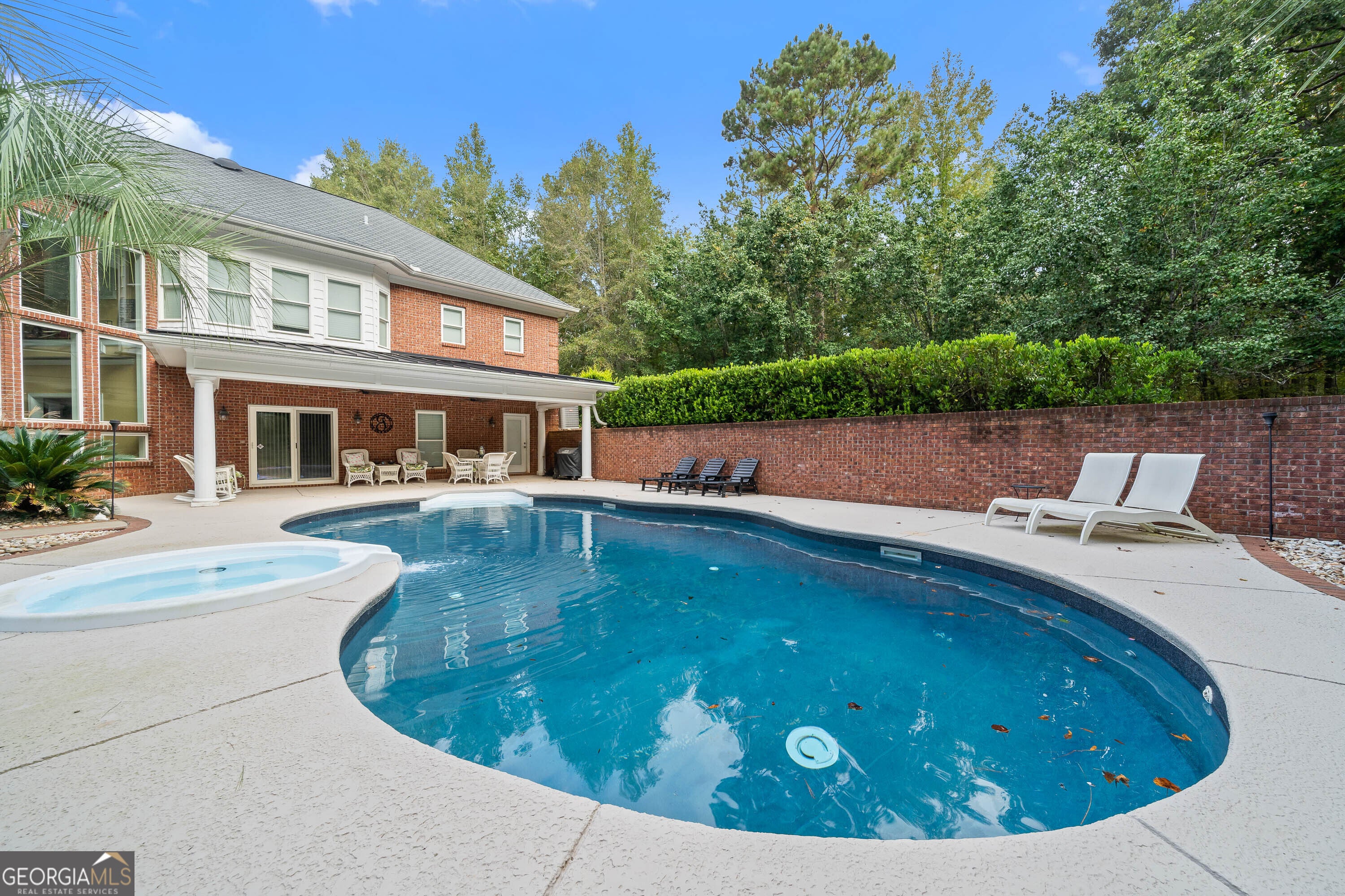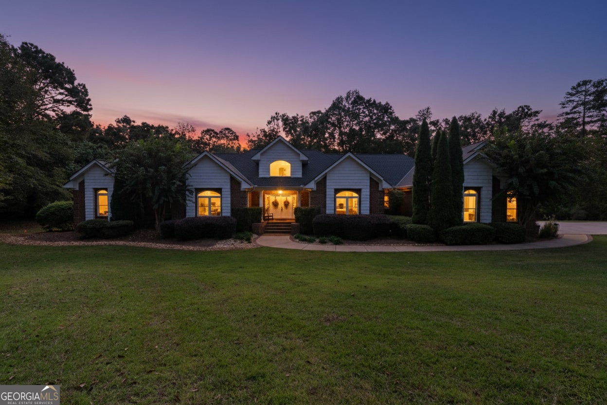 Discover this stunning custom-built home nestled on over 10-1/2 acres in Baldwin County, Georgia. A true masterpiece, this residence boasts numerous extras and sprawling outdoor space perfect for relaxing and entertaining. As you walk through the front doors, you're welcomed into a grand foyer featuring a comfortable sitting room and a powder room for guests - the perfect introduction to the home's inviting and functional layout. The gourmet kitchen features elegant tiled flooring, beautiful two-year-old granite countertops and backsplash, cherry custom cabinets, an eat-in island with a cooktop and raised bar, all stainless steel appliances, a double oven, and a walk-in pantry. Adjacent to the kitchen is a bright breakfast room and a formal dining room, ideal for family meals and entertaining guests. The hearth room with a brick wood-burning fireplace is perfect for intimate gatherings. Step outside from the hearth room onto a covered balcony overlooking the lush landscaped backyard and inviting in-ground swimming pool with in-ground hot tub, surrounded by cool decking for a perfect outdoor oasis. The home also offers gorgeous custom trim throughout and a spacious, thoughtful floor plan. The primary suite boasts trey ceilings, a custom tile shower, a three-person Jacuzzi, and his-and-hers closets. The residence features three new hot water heaters, all two years old, ensuring ample hot water for the entire home. Additional amenities include an attached three-car garage and a separate two-car detached garage, both with abundant attic storage. Downstairs, you'll find gorgeous tiled flooring, a bar overlooking a keeping area and second fireplace, a recreation/game room with trayed ceiling. There's also a large hobby or trophy room that could serve as an additional bedroom, one bedroom, a full bathroom, a climate-controlled walk-in gun safe room and an additional large flex room with a large walk-in closet. An additional half bath, conveniently accessible from the pool area, enhances outdoor convenience. This home also provides three climate-controlled storage rooms, offering an abundance of storage throughout. Security is a priority with a comprehensive security system, providing peace of mind. The meticulously landscaped and impeccably maintained exterior complements this exceptional property, combining comfort, luxury, and privacy in Baldwin County.