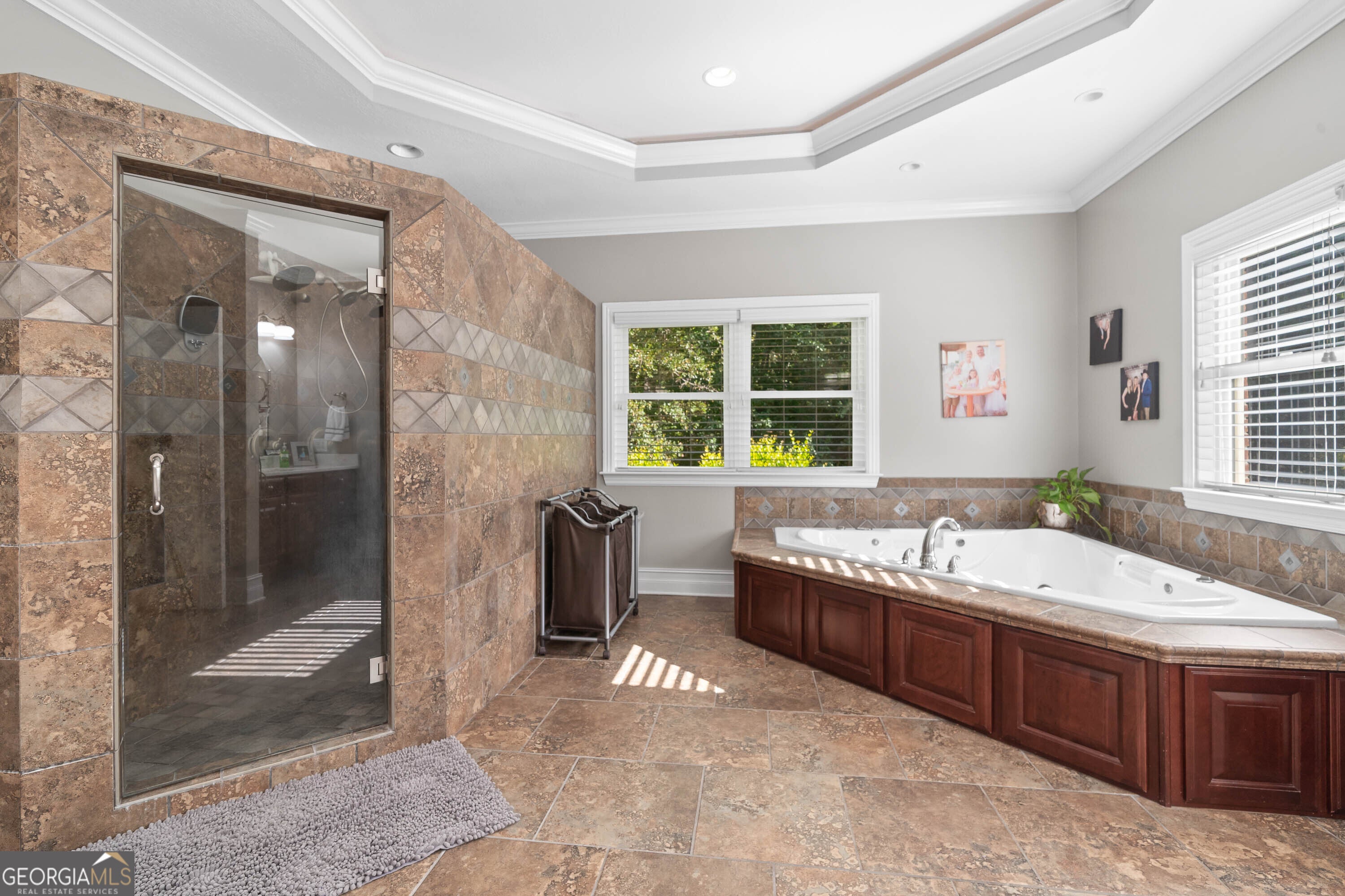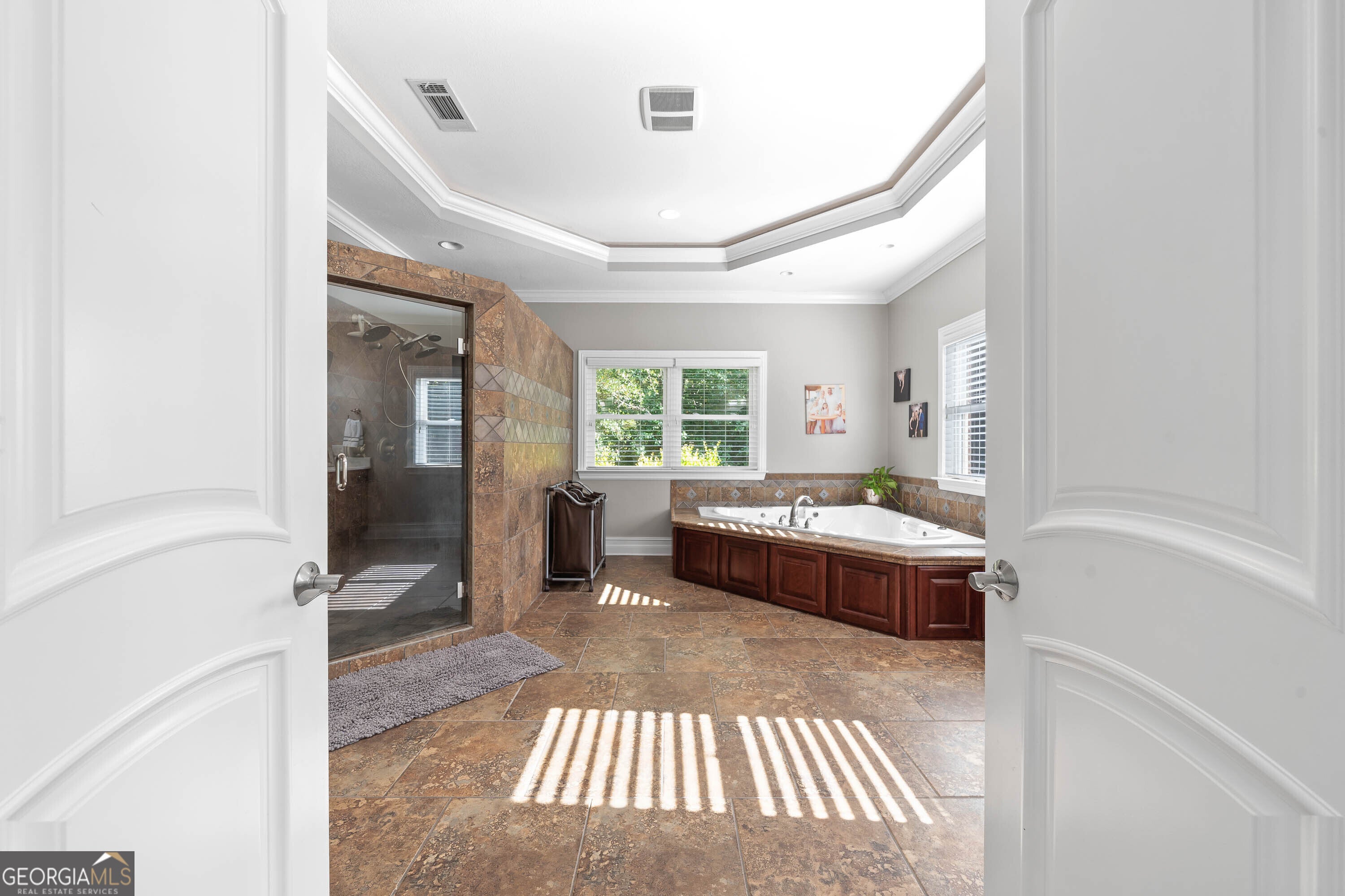 - Interior FeaturesDouble Vanity, High Ceilings, Master On Main Level, Rear Stairs, Roommate Plan, Separate Shower, Soaking Tub, Tile Bath, Tray Ceiling(s), Walk-In Closet(s), Wet Bar, Whirlpool Bath