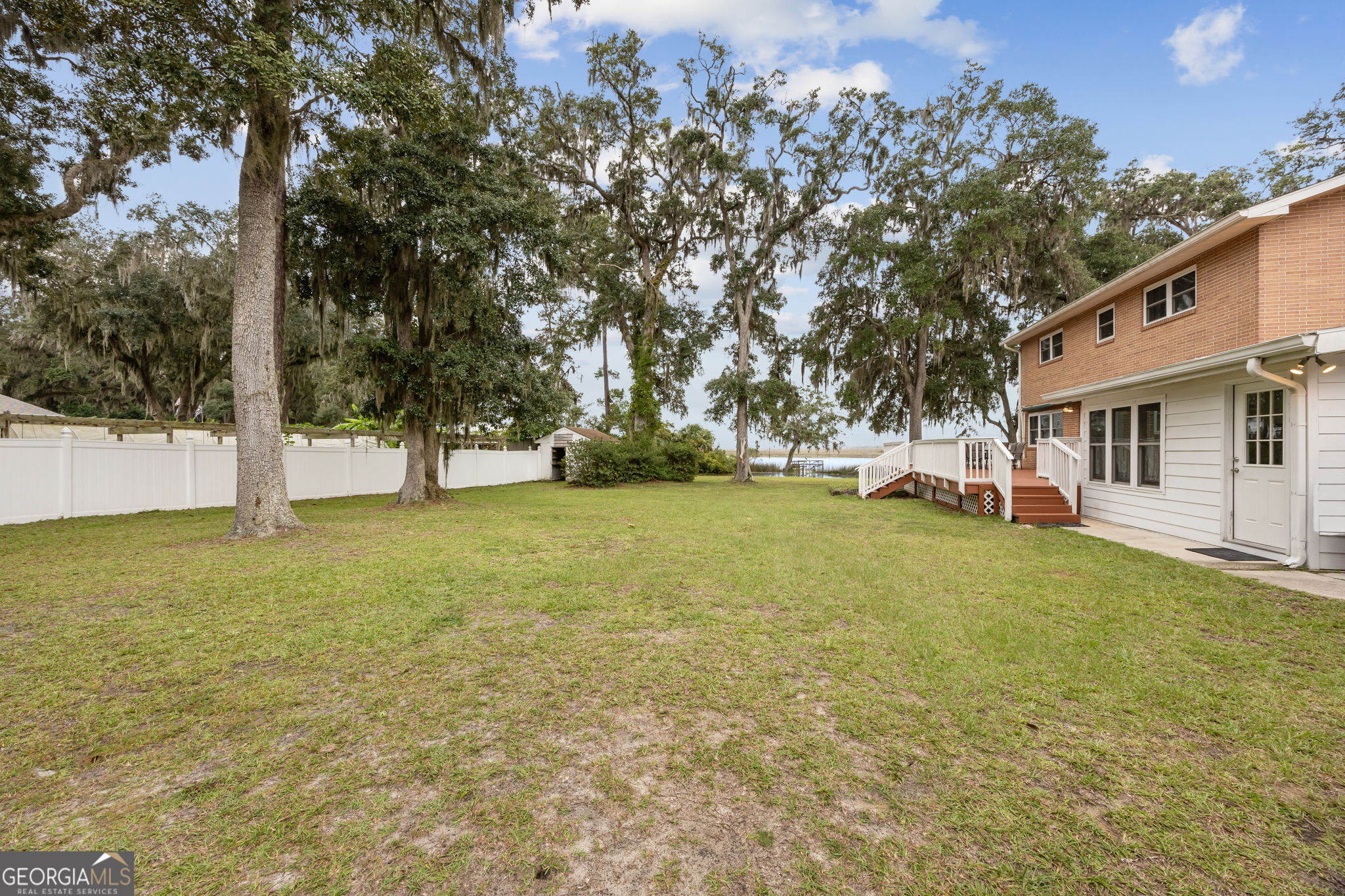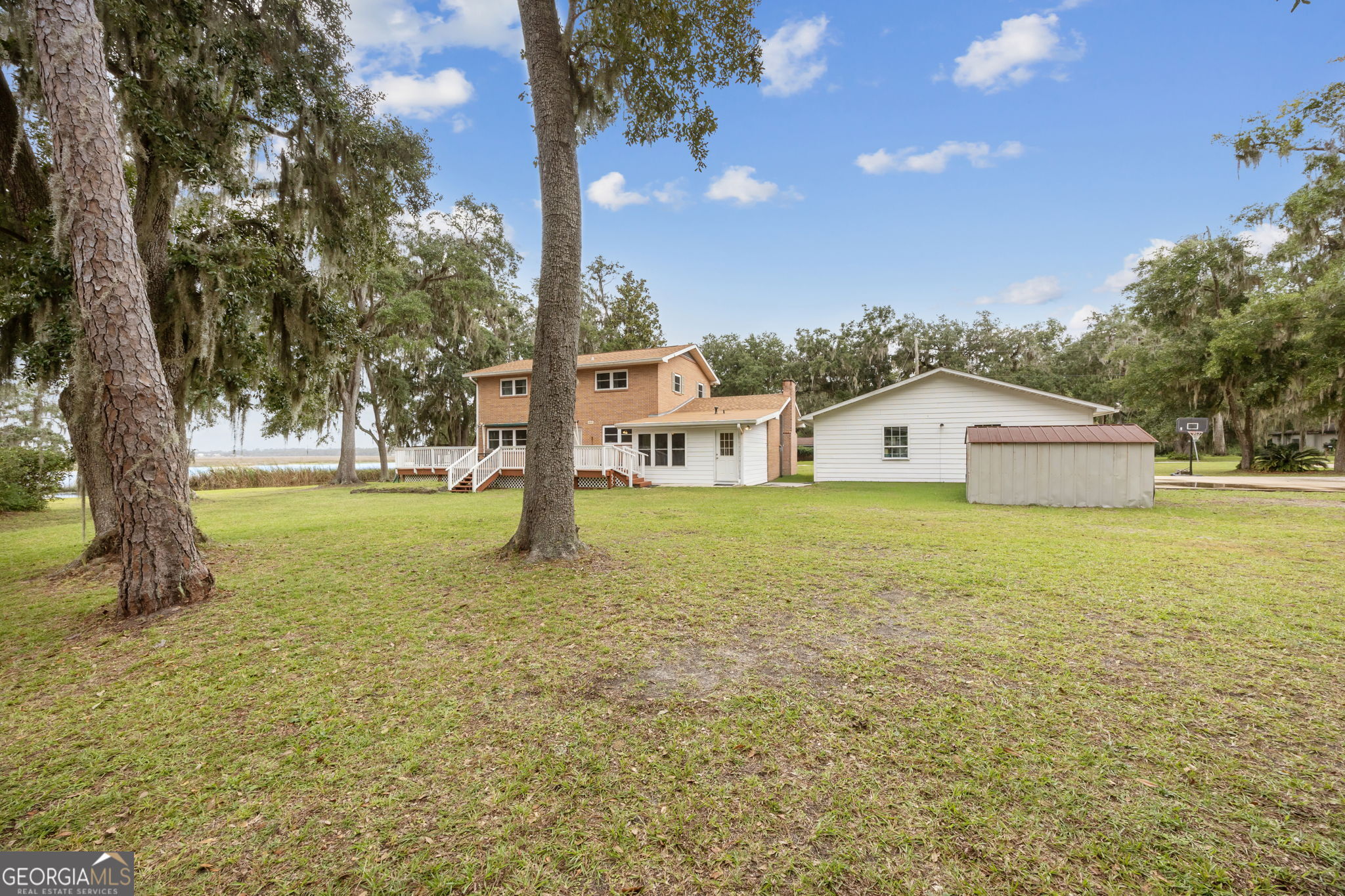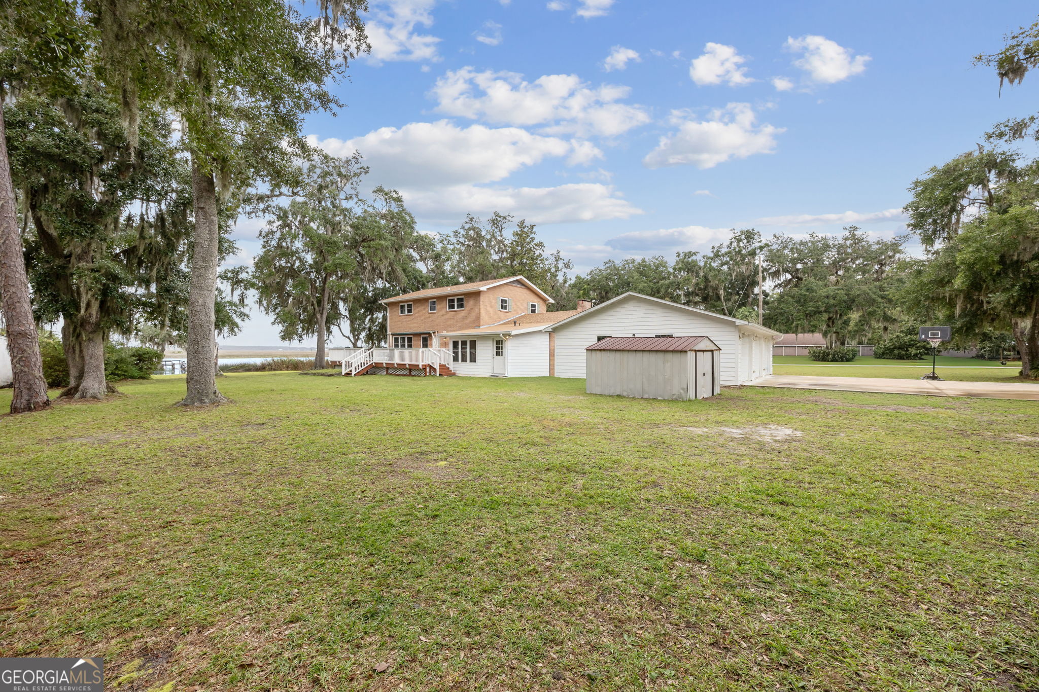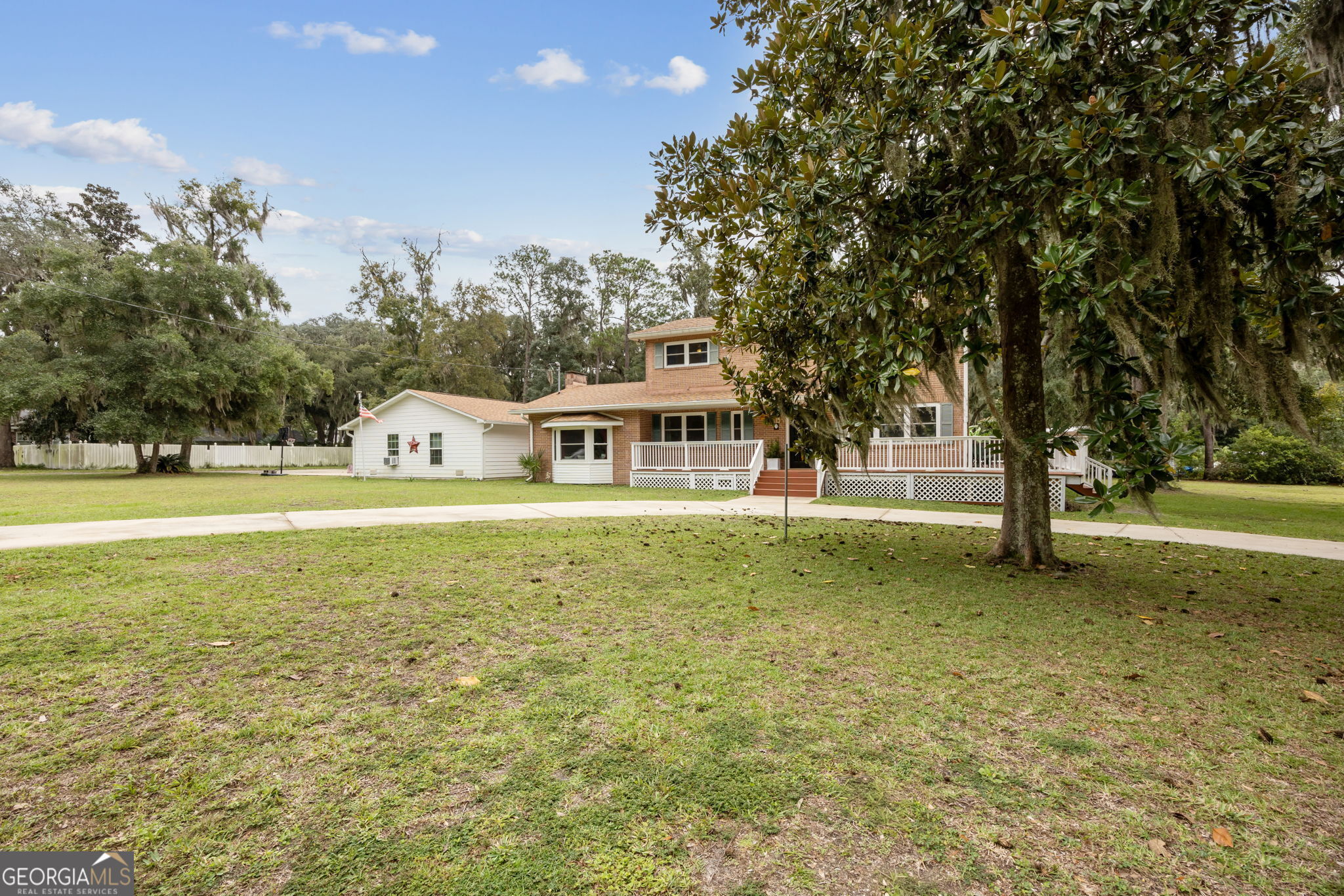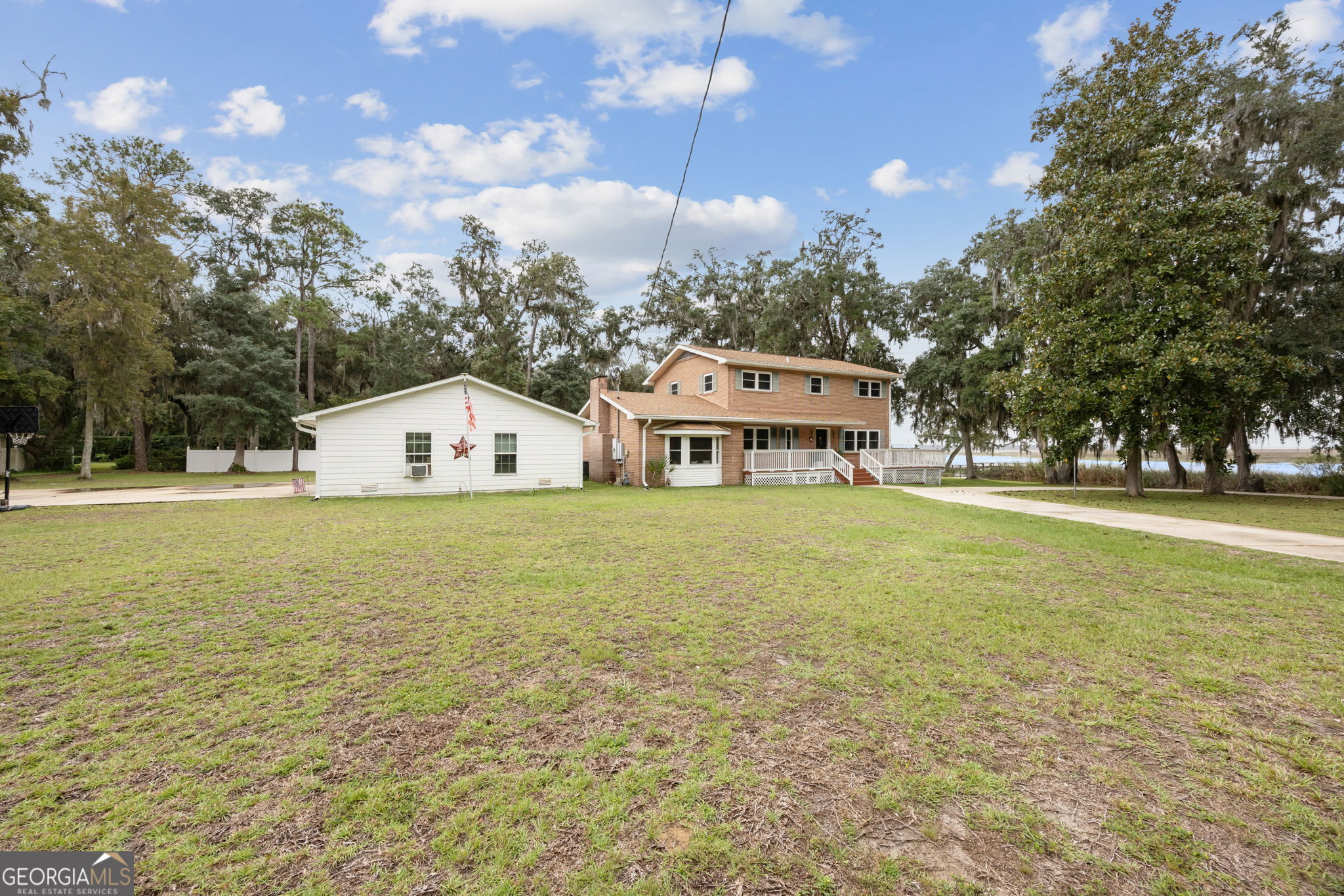 This property presents a unique opportunity to be in downtown St. Marys, on the water, have almost an acre of land and drive your golf cart to shopping, restaurants and the waterfront. The sunset views from the wraparound deck and the dock are beautiful year round. This all brick constructed home has a wrap around porch on three sides, a recently remodeled kitchen, a 10 x 12 laundry room, original hardwood floors, den with a wood burning fireplace, eat in kitchen, powder room, spacious dining room and living room with a dynamite view. Upstairs, there's the primary suite, three guest bedrooms and a bath room. Alpha foundation has a transferrable life guarantee on the complete foundation. In addition, there is a newer concrete circular driveway detached oversize 3 car garage can store your cars, golf cart, boat and anything else you might need. We left room in the price for you to make this your waterfront oasis. Call to see this opportunity before it's gone.