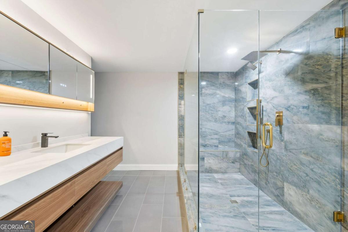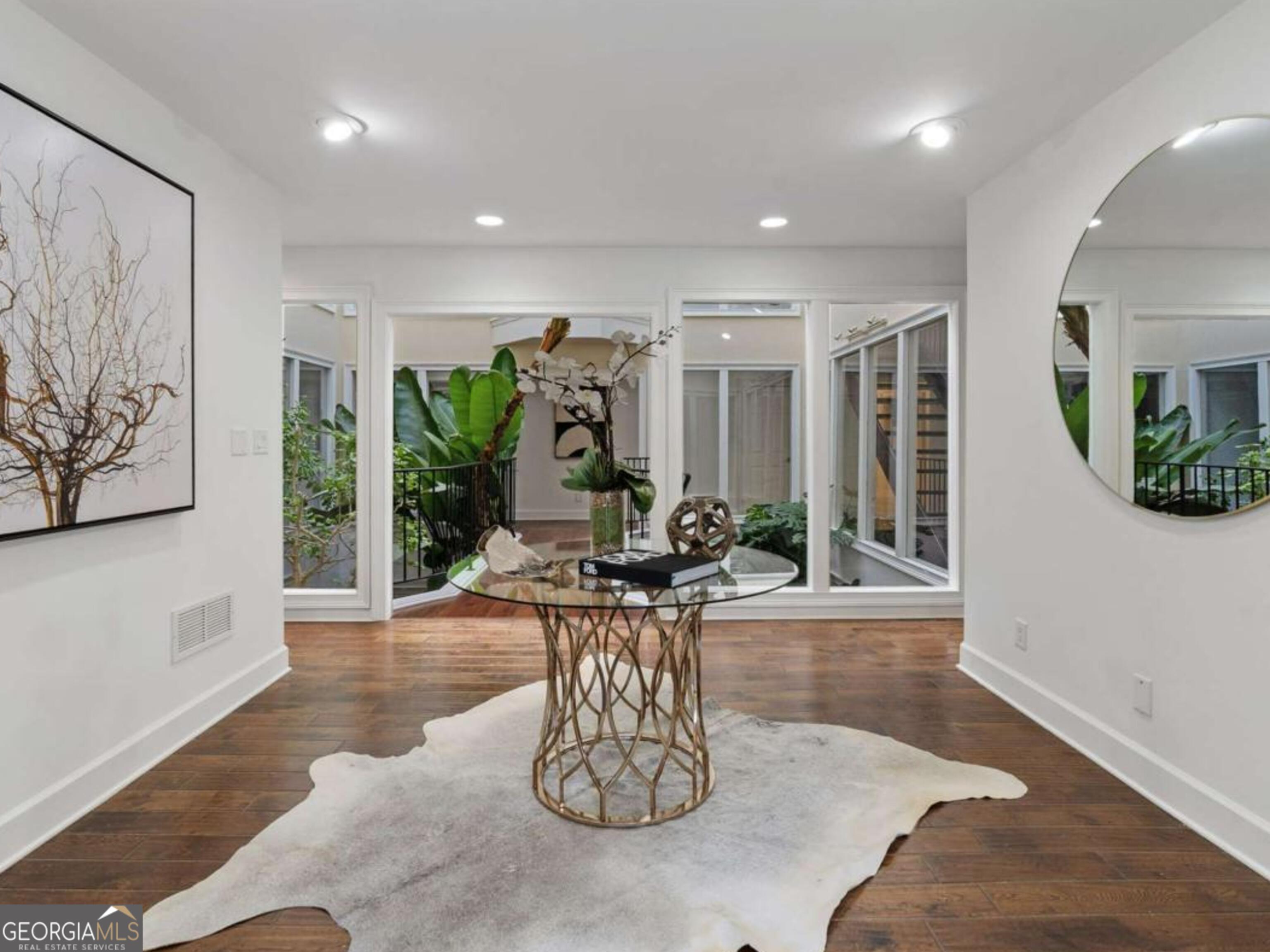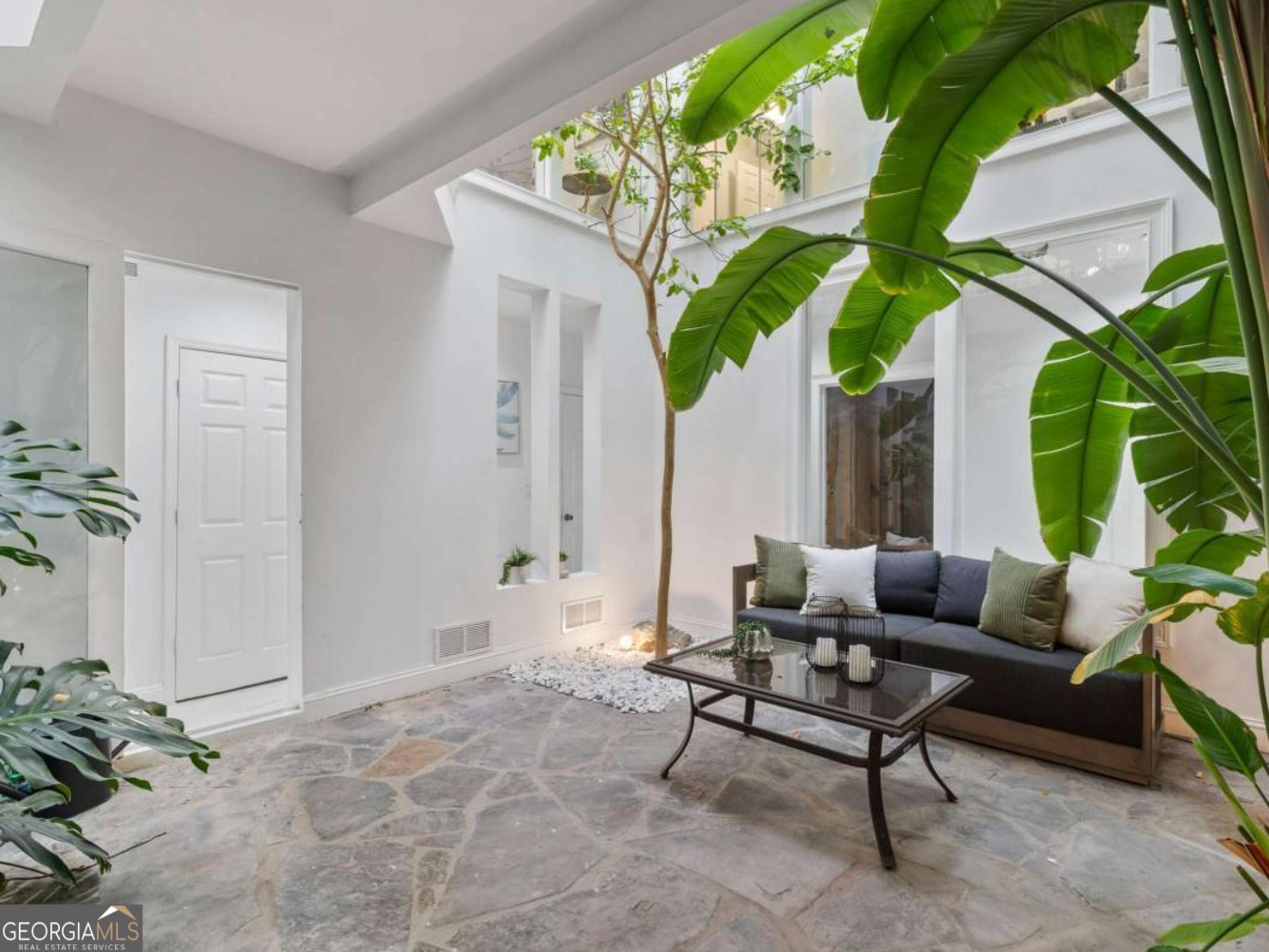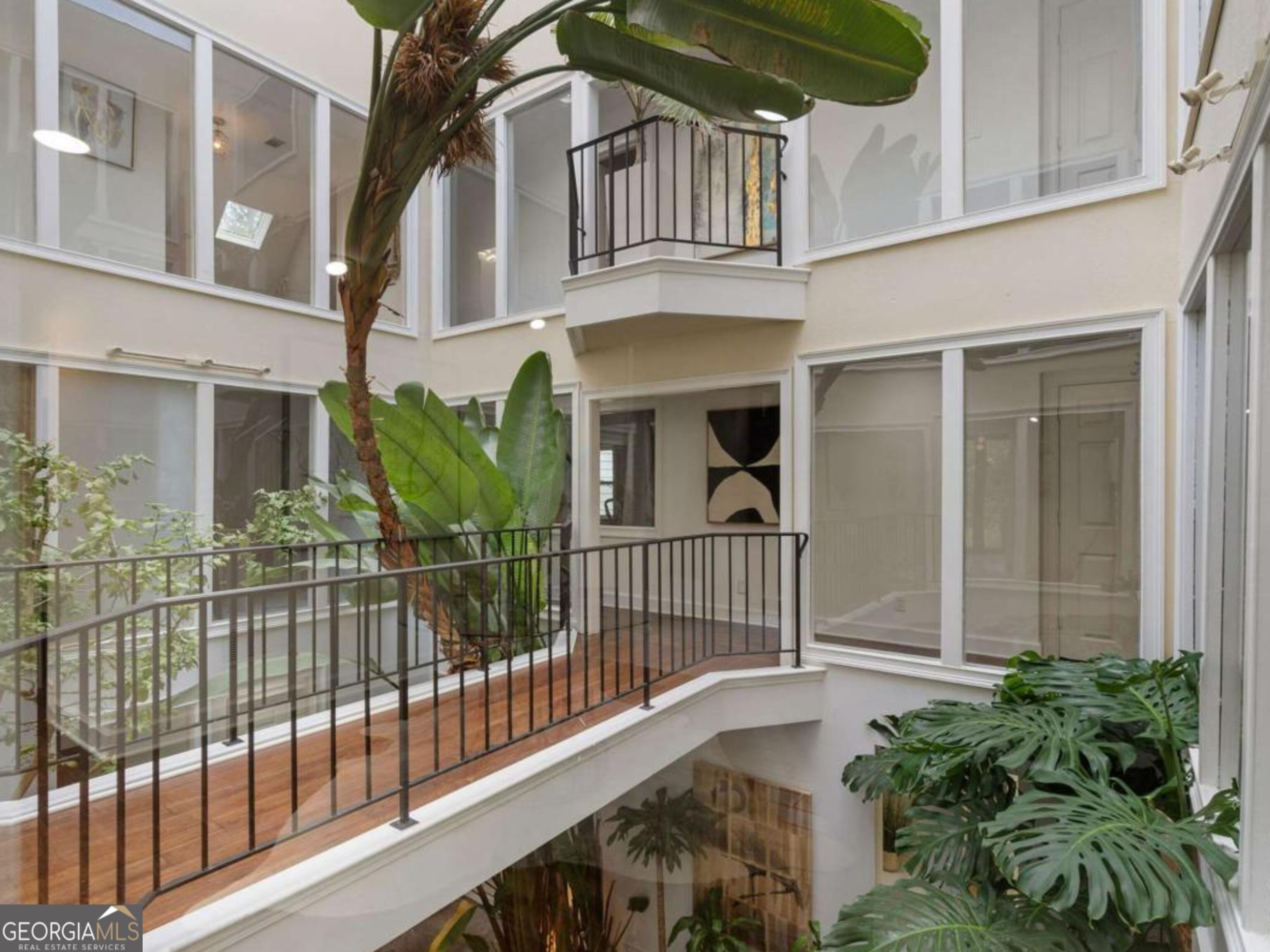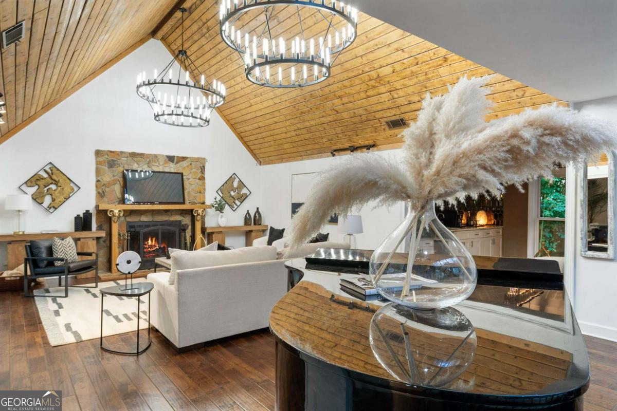 At the end of a long, tree-lined private lane awaits a rare architectural masterpiece that's been renovated with over 8,001-square-feet. Resting on 1.42 secluded acres, this Roswell sanctuary, 11260 Houze Road, is a symphony of light, space, and design, created for those who seek beauty in balance and intention in every detail. From the moment you step inside, you are enveloped by a calm zen experience. A three-story skylit atrium anchors the home-its soaring glass canopy and collection of towering greenery creating a living sculpture that breathes vitality into the interiors. Natural light pours through every level, revealing serene vignettes framed by walls of glass and the ever-changing dance of sun and shadow. Architectural ironwork and an open floating staircase rise through the space, leading to a tranquil loft that overlooks the heart of the home. The great room inspires awe with its cathedral wood ceilings, custom wood-burning fireplace, and sunroom lined in glass-an ideal space to pause with doors out to the deck. The gourmet kitchen is both art and utility: Quartzite Tahiti matte countertops, Esca white cabinetry with glass fronts, and a seamless wall of windows that opens to the expansive deck beyond. A sculptural island invites conversation, while the butler's pantry and wet bar-finished in Alpinus granite and smoked glass-elevate entertaining to ritual. The formal dining room exudes understated elegance, while the main level primary suite becomes a private retreat unto itself-complete with doors out to balcony, and a spa-inspired separate vanities and bathrooms that feel more like a meditation space. A freestanding soaking tub, custom stone floors, and a jetted shower framed in glass create a sense of refined serenity. Upstairs, a loft and lounge study area that overlook the atrium, offering perfect spaces for reflection or creative work plus two more bedrooms. On the terrace level, the rhythm of the home shifts-welcoming an in-law suite with kitchenette and separate entrance. Enjoy a skylit gym and recreation areas, and flexible rooms ideal for art, wellness, or gathering. Two separate garages with tinted black glass doors and EV chargers. Outside, the experience unfolds into nature. Natural stone walkways weave through lush landscaping, boulders, bamboo, koi ponds, a tiki bar, and generous decks designed for connection or solitude. Beyond lies a broad, level lawn-an open canvas for a future pool or garden retreat. This residence is not merely a home, but a state of being-where light, architecture, and nature exist in harmony. New roof put on 2024 and all new windows. Minutes from the energy of downtown Roswell and Canton Street yet hidden in a quiet cul-de-sac, it offers a life that feels both grounded and elevated-modern living with a soul. In minutes enjoy numerous parks like Azalea Park, Riverside Park and Big Creek Park. Or biking trails on Roswell Riverwalk and jogging trails, cayaking, fishing all along the Chattahoochee river corridor that Roswell is known for. Hike to the mill ruins and the Vickery Creek waterfall. Dining and shopping is nearby as well including downtown Roswell/Canton street, Village Walk, North Point Mall and Avalon.