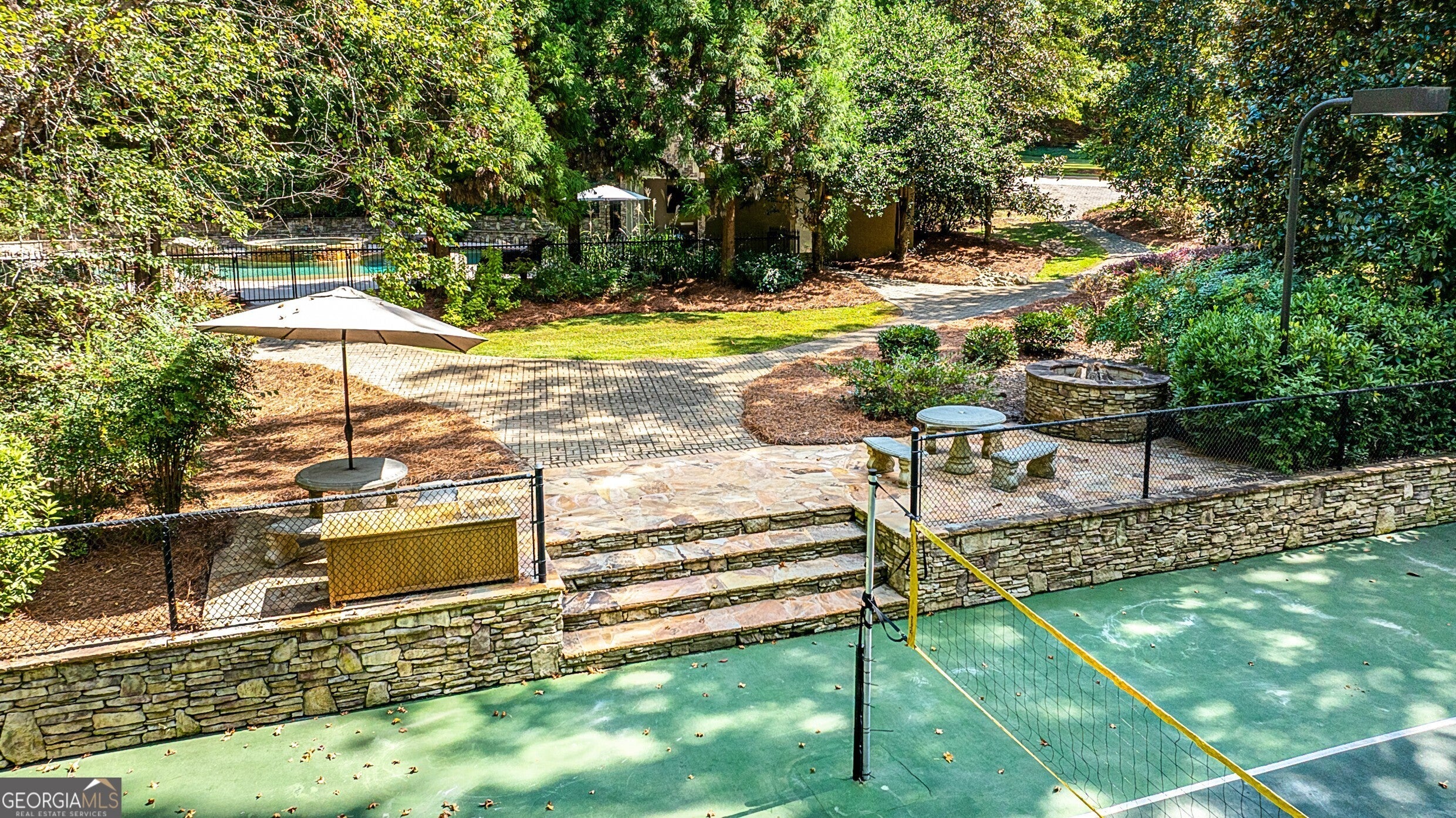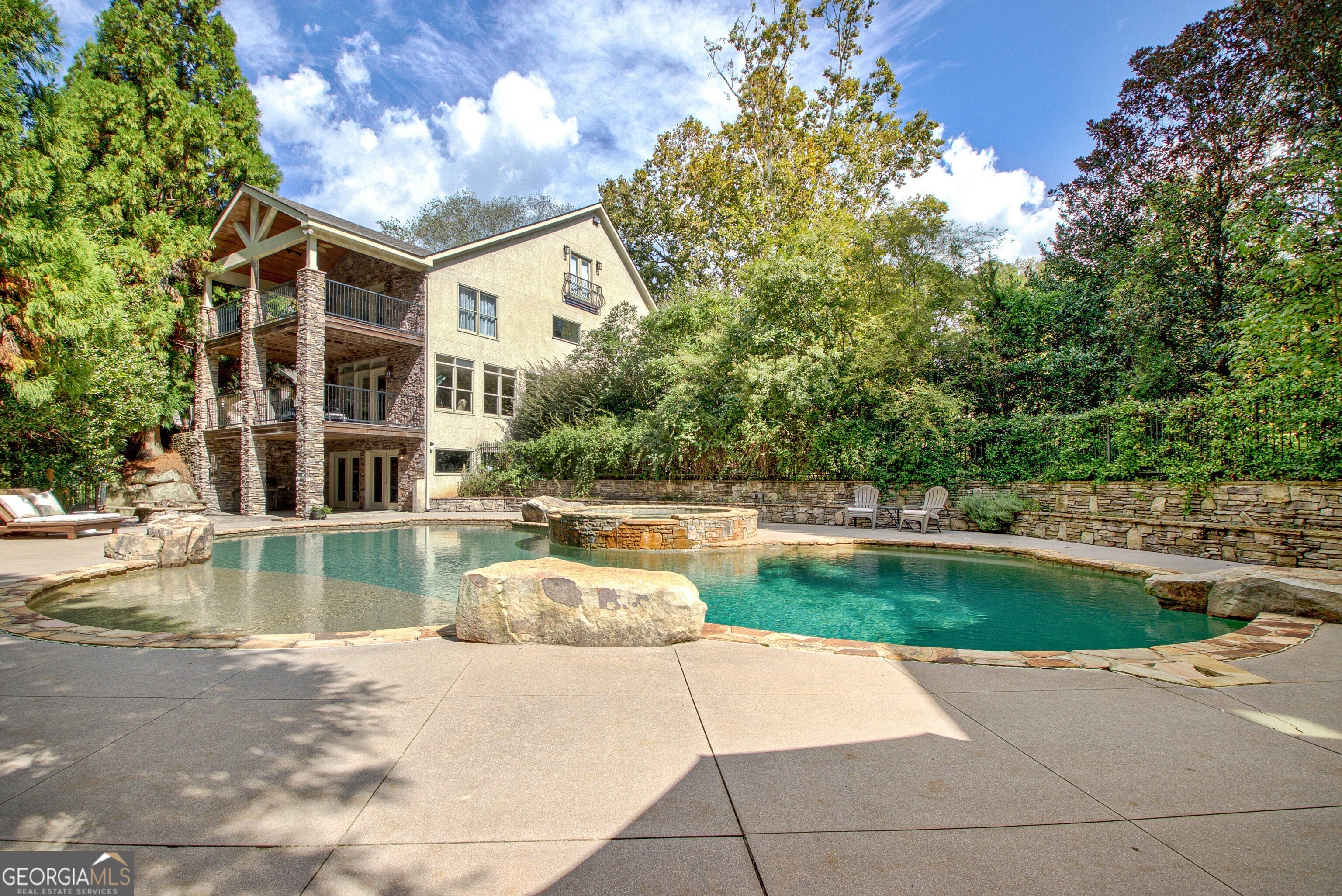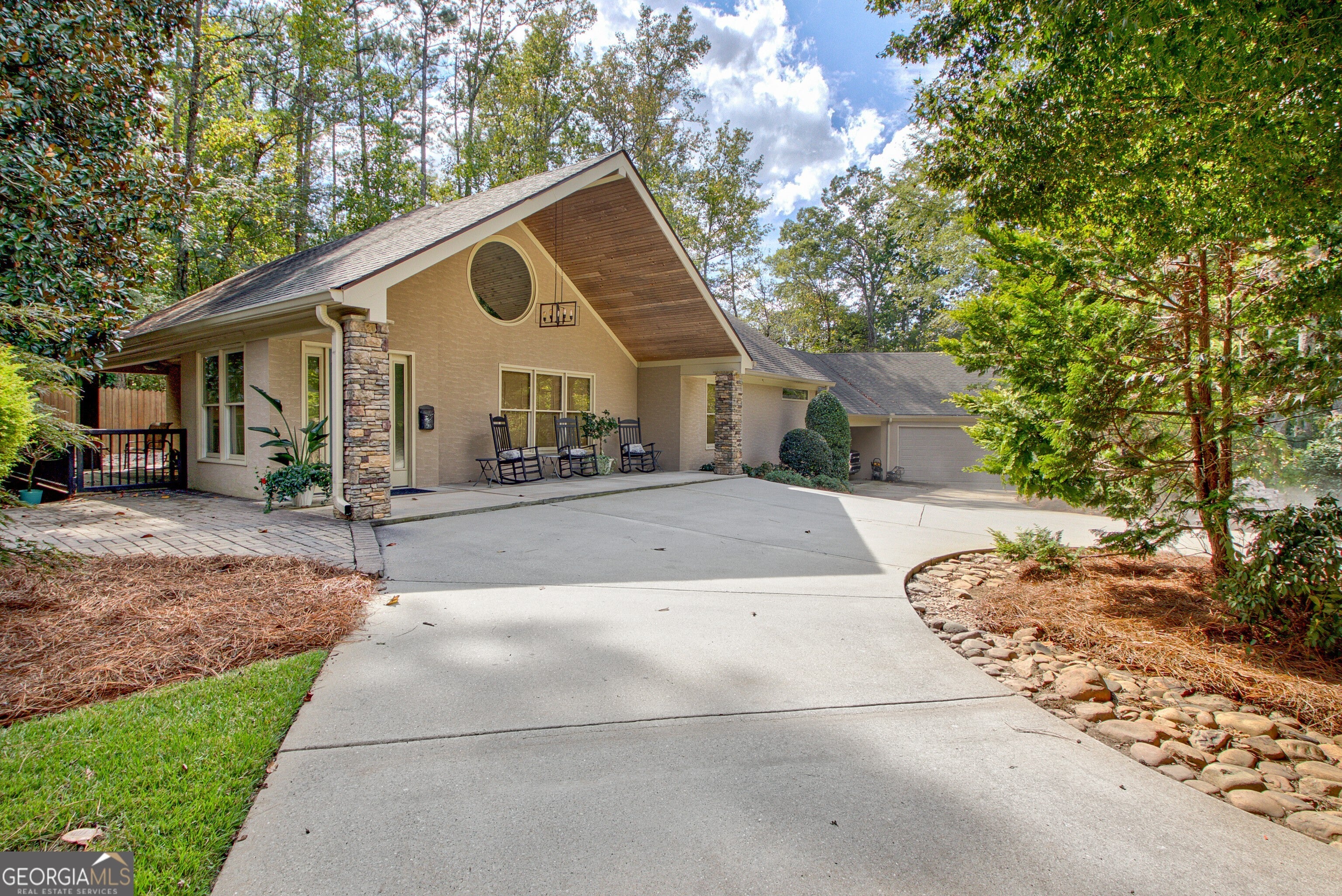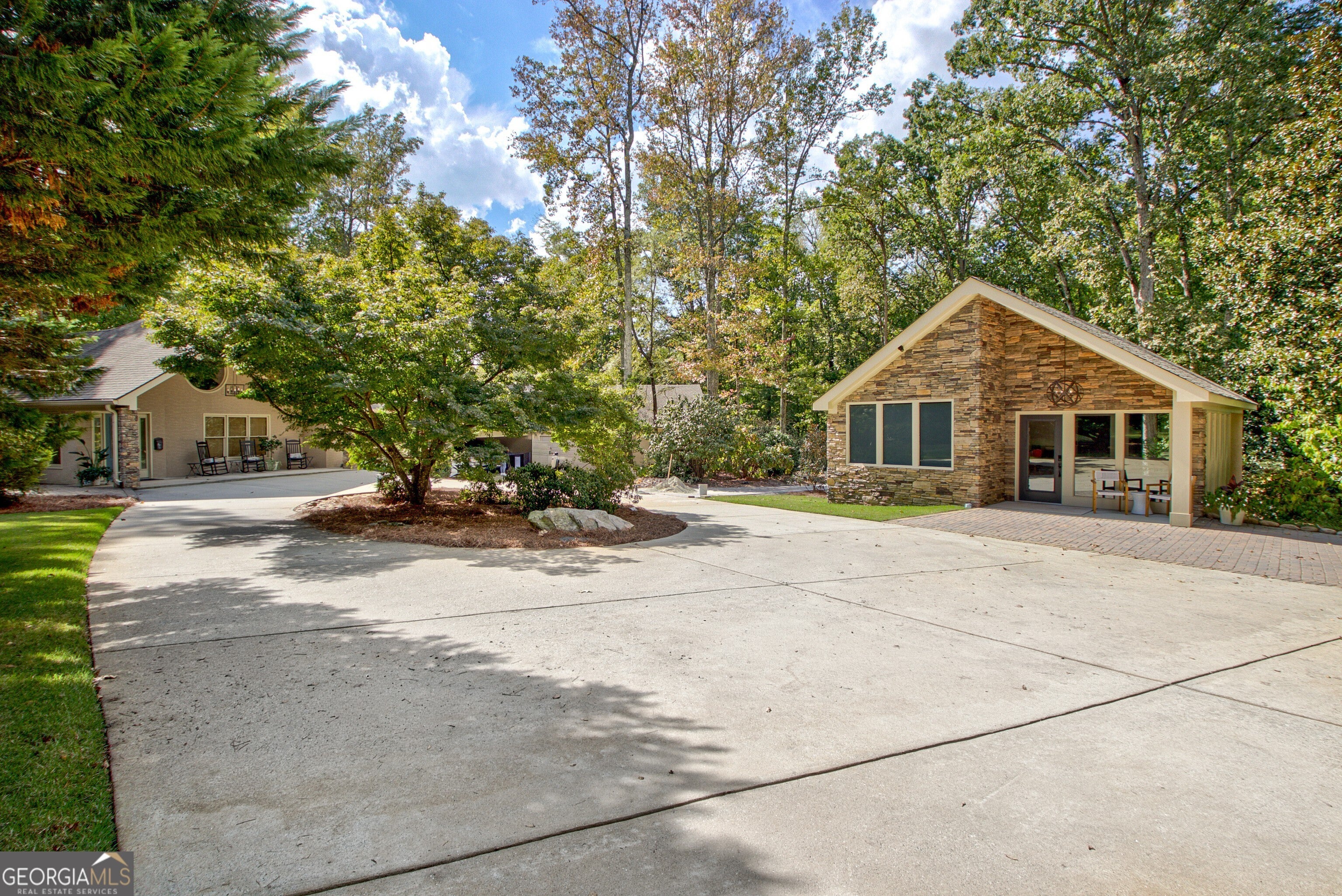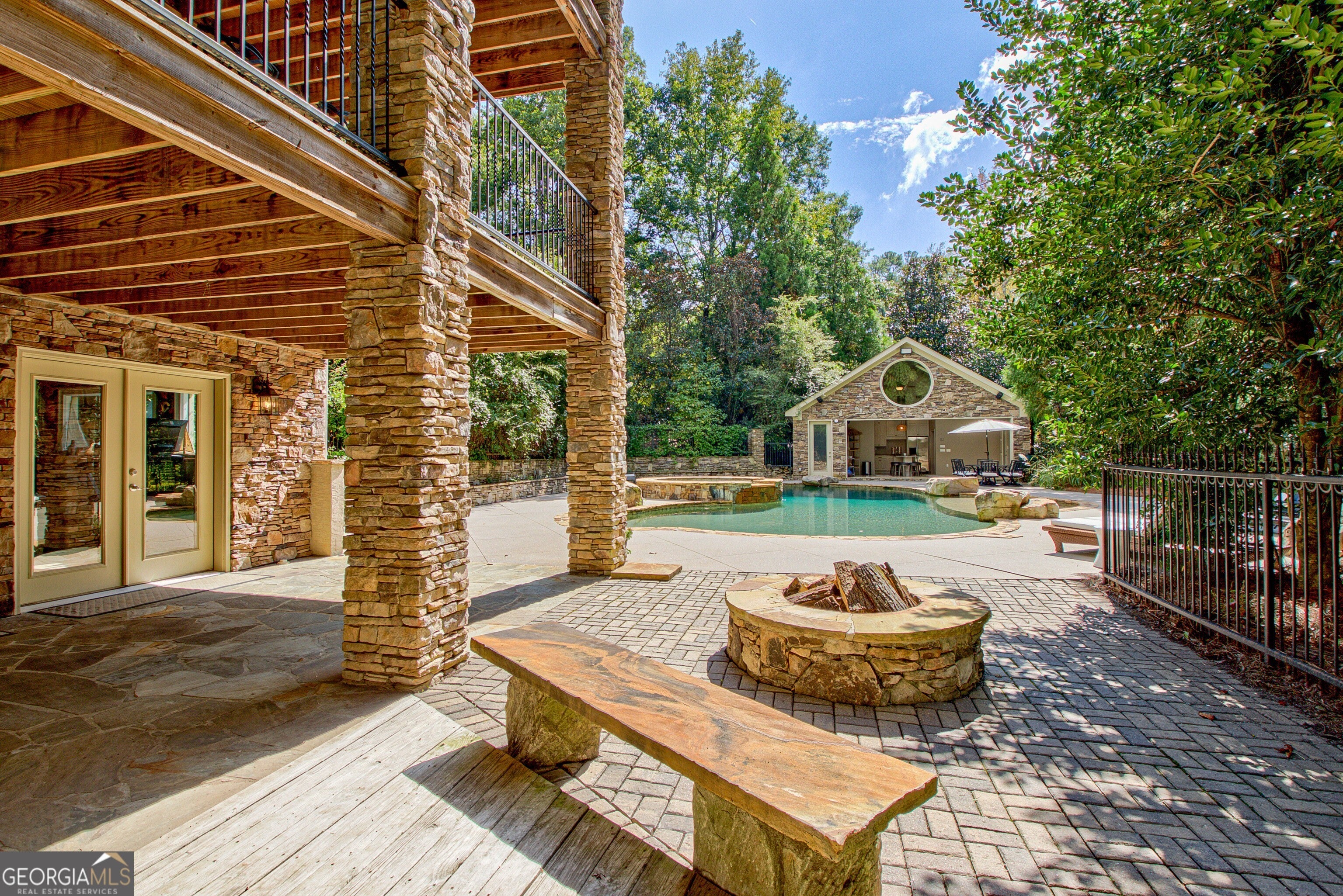 Discover this truly one-of-a-kind private, gated compound set on over 5 acres of meticulously landscaped grounds, offering three separate properties - ideal for multi-generational living. The nearly 9,000 sqft primary home offers 6 bedrooms, 4 full baths, 2 half baths, full terrace with dedicated theater room, game room, and bar for elevated living. Thoughtfully designed with two generous living areas with 2 wood burning fireplaces, a formal dining room, and a well-appointed kitchen complete with double ovens, and built-in commercial refrigerator/freezer - the home is perfect for everyday living and effortless entertaining. Rustic wood beams and stone accents infuse the home with authentic ranch-style character, and brick flooring leads to a charming wine cellar, adding to the unique appeal. In addition to the 5 bedrooms in the main home, an additional private guest suite with it's own entrance is located above the 2 car attached garage, making it ideal for teen suite, au pair living, or live-in housekeeper. A stunning 3-level deck overlooking the pool and serene landscape graces the rear of the primary home with covered porch views from the living room, primary suite and terrace level. In the backyard, the oversized pebble-finish pool and spa await, featuring tanning ledge and natural rock accents creating a resort-style setting complete with firepit. The freeform pool echoes nature and leads to the pool house with kitchenette with stone island, living room and full bath - making backyard hosting seamless. The second residence is a true stepless ranch and spans over 1300 sqft and offers 2 bedrooms and 2 baths, making it perfect for multi-generational living. With a full kitchen, living, and laundry, it is truly a second full home on the property. Attached to the second residence is a gym, expansive carport and and heated/cooled 2-car garage for the car enthusiast or woodworker, with attached office space. The third building on property which encompasses 660 sqft with half bath is ideal for a quiet workspace, creative enclave, yoga retreat, or art studio. All three residences, along with the poolhouse, are thoughtfully connected and cohesive in style and design. Shared architectural elements to include the unique round windows and curated accents create a harmonious flow throughout the property, seamlessly blending with the surrounding landscape. Approaching the primary home, a serene pond featuring a dock and pavilion offers a picturesque setting to relax. Stone and brick pathways wind gracefully throughout the property, leading to a private lighted tennis/pickleball/basketball court, expansive grassy lawns and peaceful patios nestled beneath canopies of mature trees inviting exploration at every turn. With no HOA restrictions, this estate offers the freedom to make it your own - bring your RV, boat, or add chickens to the existing chicken coups - all while enjoying the privacy and space of your own 5-acre retreat. The grassy lawn is great for football, baseball, soccer, golf, and even offers enough space for helicopter landings! Set in Peachtree City GA, a mere 15 miles from Atlanta's Hartsfield-Jackson International Airport, you will feel like you are a world away from everything, while still near first-class entertainment, retail,dining and transportation. Peachtree City offers 100+ miles of golf cart paths, and the estate is zoned for the highly-rated McIntosh High School district.