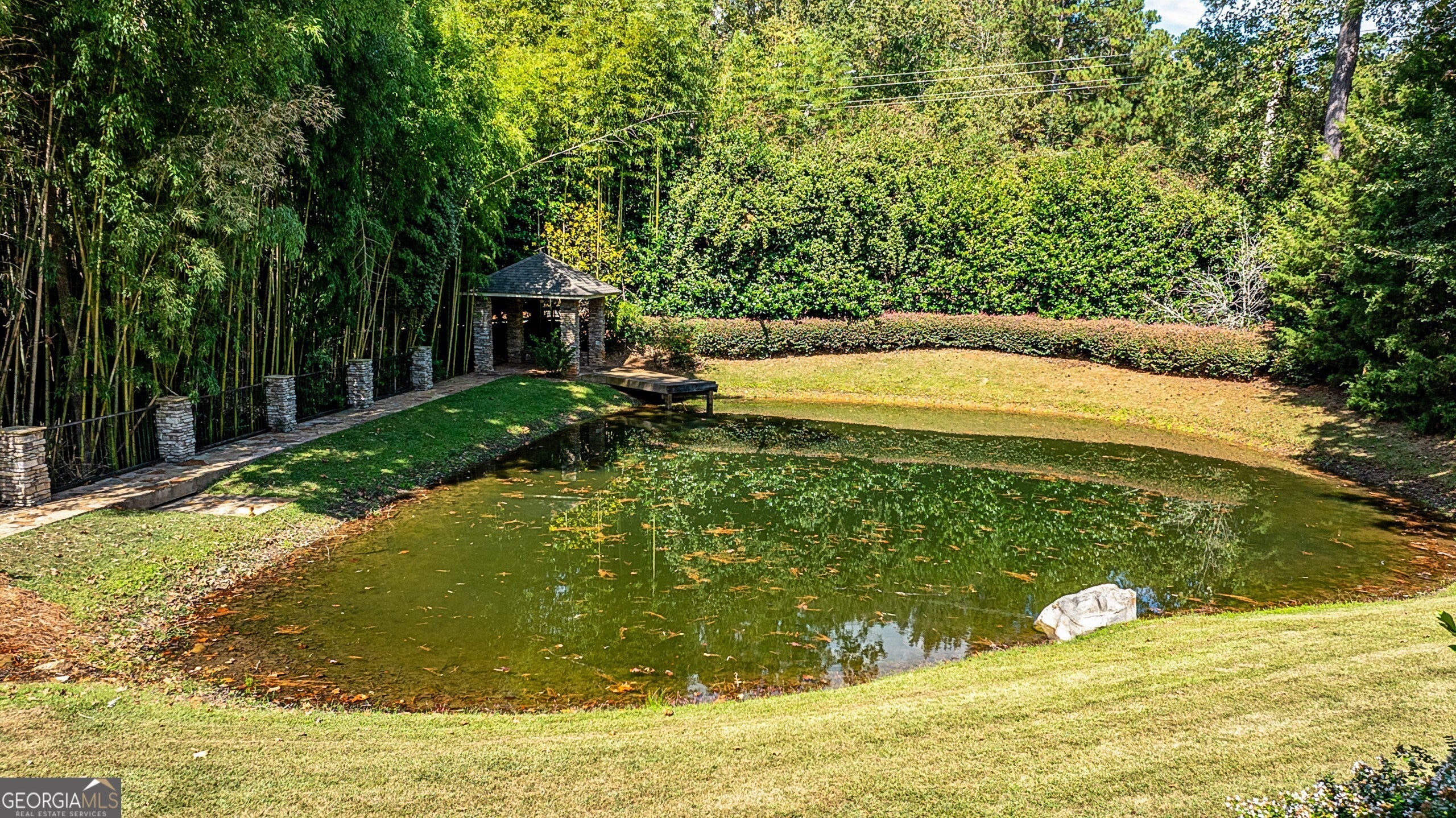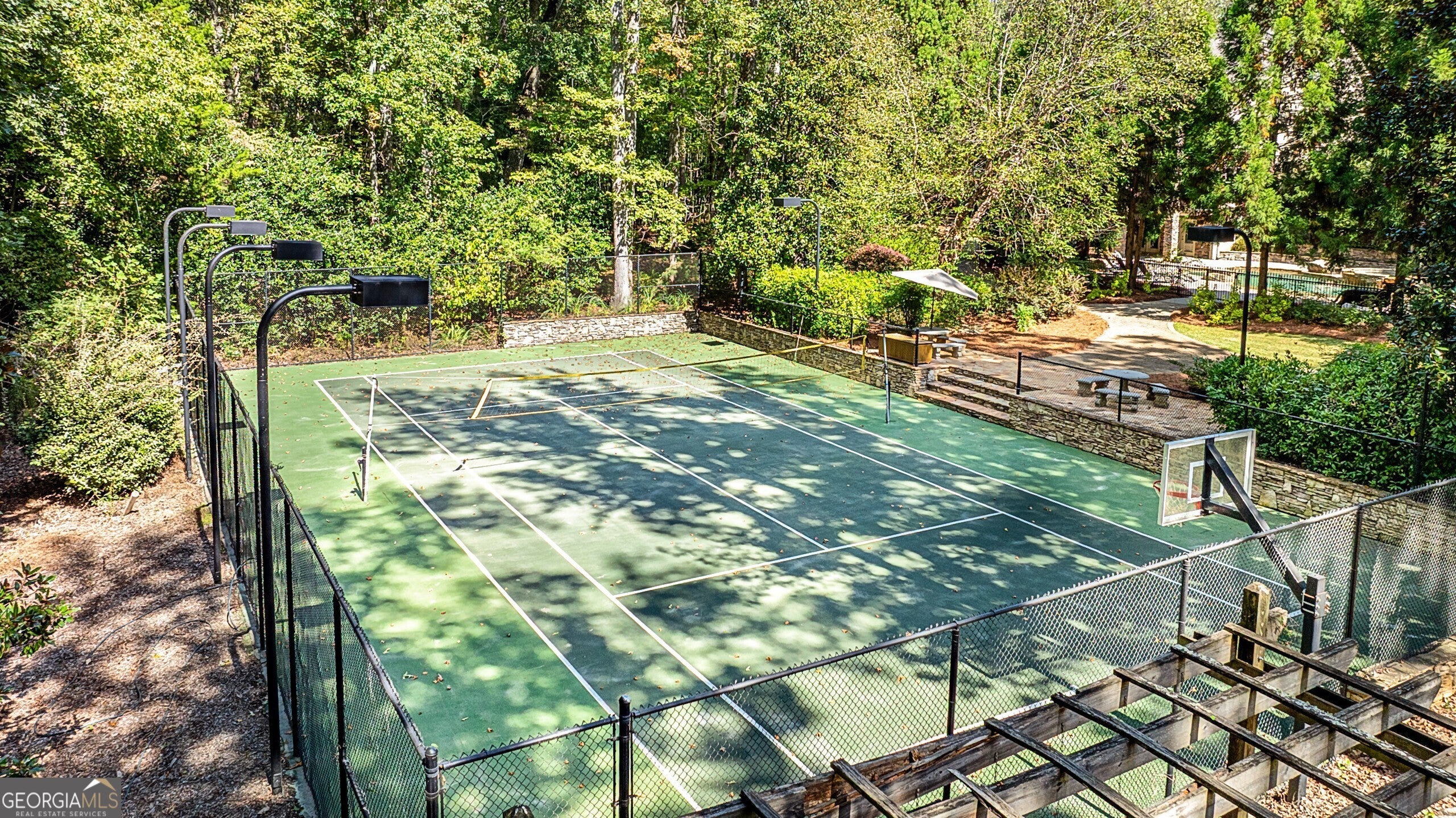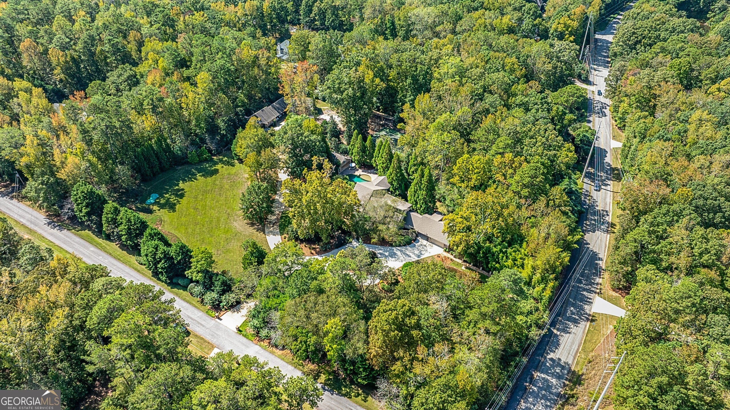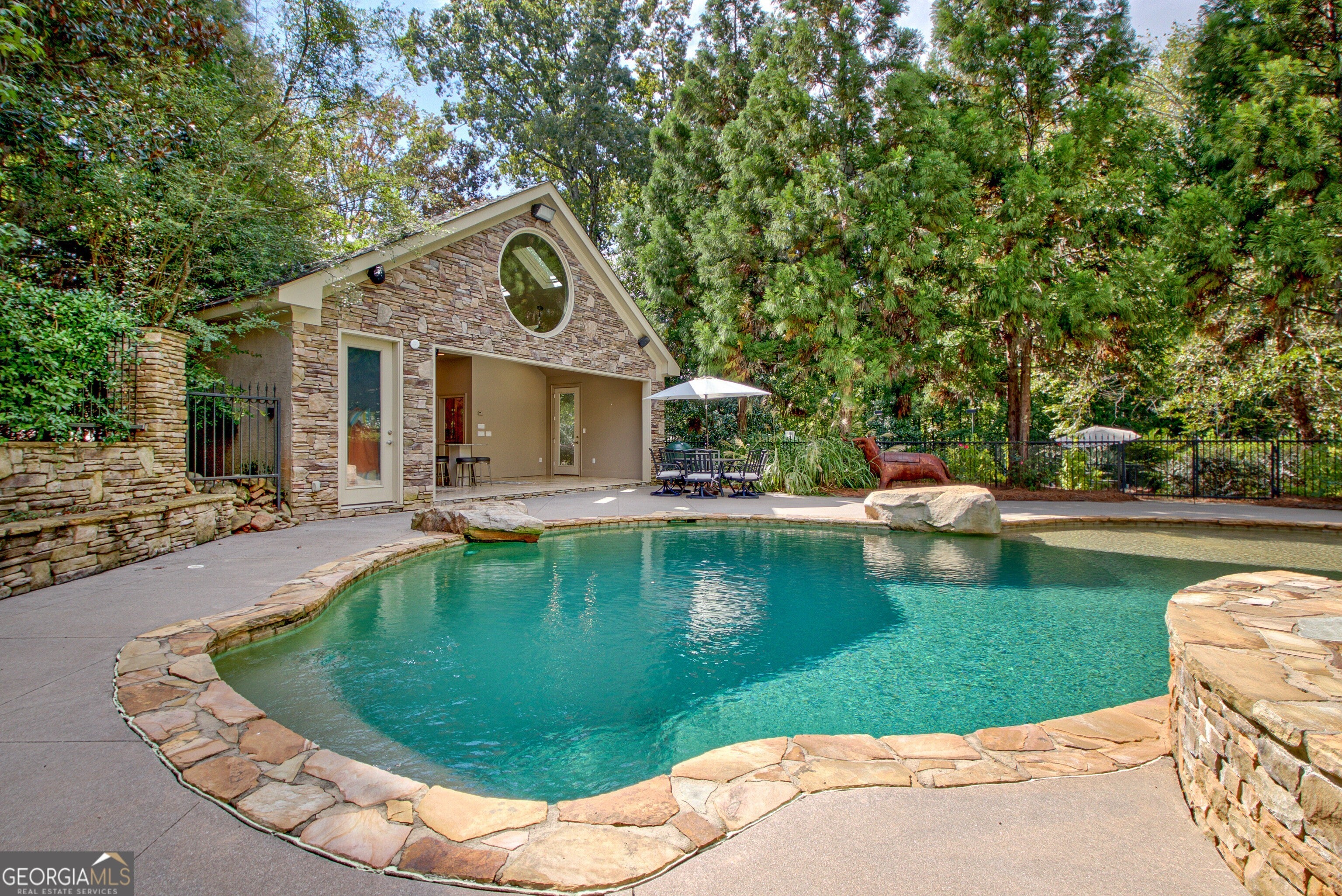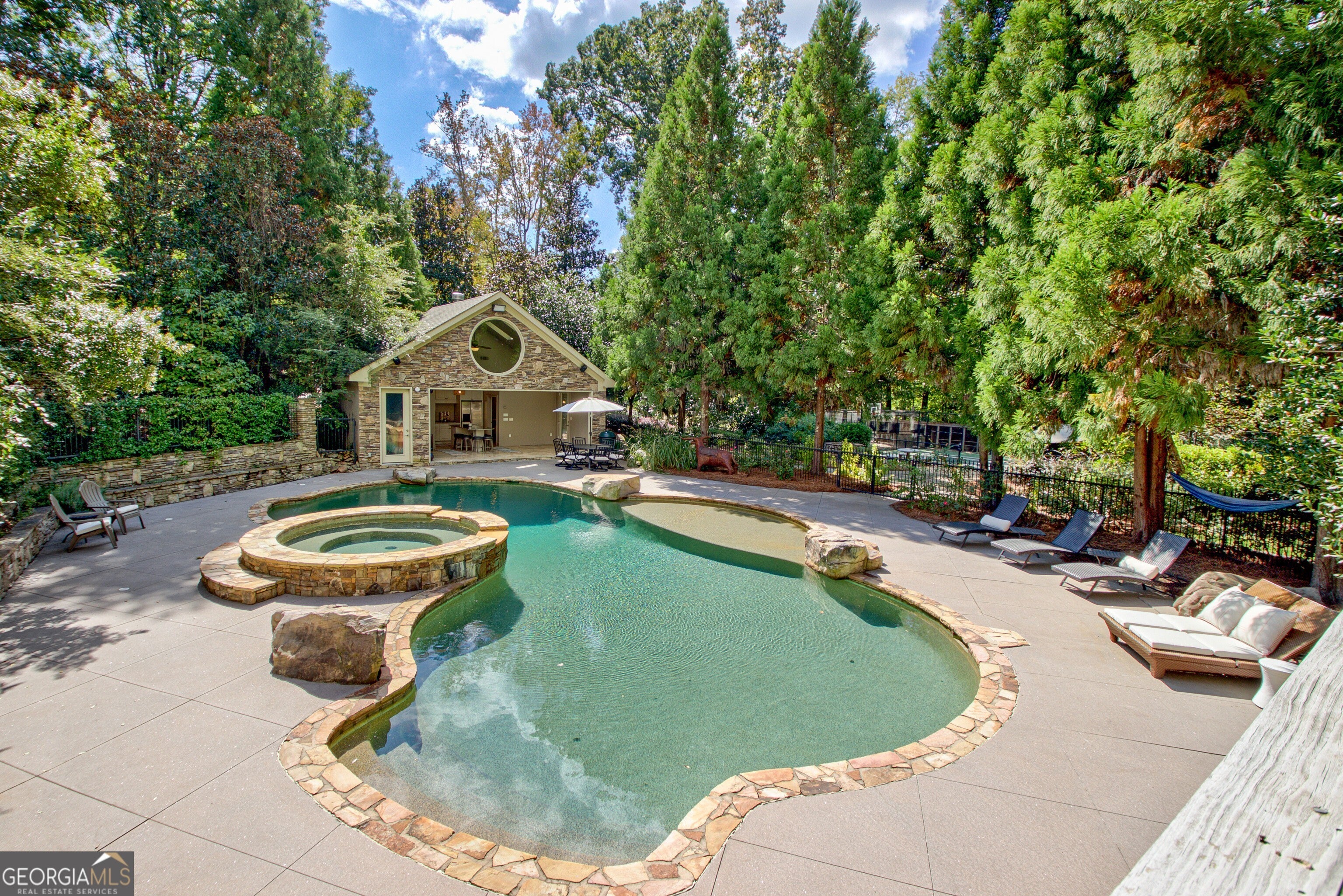 Discover this truly one-of-a-kind private, gated compound set on over 5 acres of meticulously landscaped grounds, offering three separate properties - ideal for multi-generational living. The nearly 9,000 sqft primary home offers 6 bedrooms, 4 full baths, 2 half baths, full terrace with dedicated theater room, game room, and bar for elevated living. Thoughtfully designed with two generous living areas with 2 wood burning fireplaces, a formal dining room, and a well-appointed kitchen complete with double ovens, and built-in commercial refrigerator/freezer - the home is perfect for everyday living and effortless entertaining. Rustic wood beams and stone accents infuse the home with authentic ranch-style character, and brick flooring leads to a charming wine cellar, adding to the unique appeal. In addition to the 5 bedrooms in the main home, an additional private guest suite with it's own entrance is located above the 2 car attached garage, making it ideal for teen suite, au pair living, or live-in housekeeper. A stunning 3-level deck overlooking the pool and serene landscape graces the rear of the primary home with covered porch views from the living room, primary suite and terrace level. In the backyard, the oversized pebble-finish pool and spa await, featuring tanning ledge and natural rock accents creating a resort-style setting complete with firepit. The freeform pool echoes nature and leads to the pool house with kitchenette with stone island, living room and full bath - making backyard hosting seamless. The second residence is a true stepless ranch and spans over 1300 sqft and offers 2 bedrooms and 2 baths, making it perfect for multi-generational living. With a full kitchen, living, and laundry, it is truly a second full home on the property. Attached to the second residence is a gym, expansive carport and and heated/cooled 2-car garage for the car enthusiast or woodworker, with attached office space. The third building on property which encompasses 660 sqft with half bath is ideal for a quiet workspace, creative enclave, yoga retreat, or art studio. All three residences, along with the poolhouse, are thoughtfully connected and cohesive in style and design. Shared architectural elements to include the unique round windows and curated accents create a harmonious flow throughout the property, seamlessly blending with the surrounding landscape. Approaching the primary home, a serene pond featuring a dock and pavilion offers a picturesque setting to relax. Stone and brick pathways wind gracefully throughout the property, leading to a private lighted tennis/pickleball/basketball court, expansive grassy lawns and peaceful patios nestled beneath canopies of mature trees inviting exploration at every turn. With no HOA restrictions, this estate offers the freedom to make it your own - bring your RV, boat, or add chickens to the existing chicken coups - all while enjoying the privacy and space of your own 5-acre retreat. The grassy lawn is great for football, baseball, soccer, golf, and even offers enough space for helicopter landings! Set in Peachtree City GA, a mere 15 miles from Atlanta's Hartsfield-Jackson International Airport, you will feel like you are a world away from everything, while still near first-class entertainment, retail,dining and transportation. Peachtree City offers 100+ miles of golf cart paths, and the estate is zoned for the highly-rated McIntosh High School district.