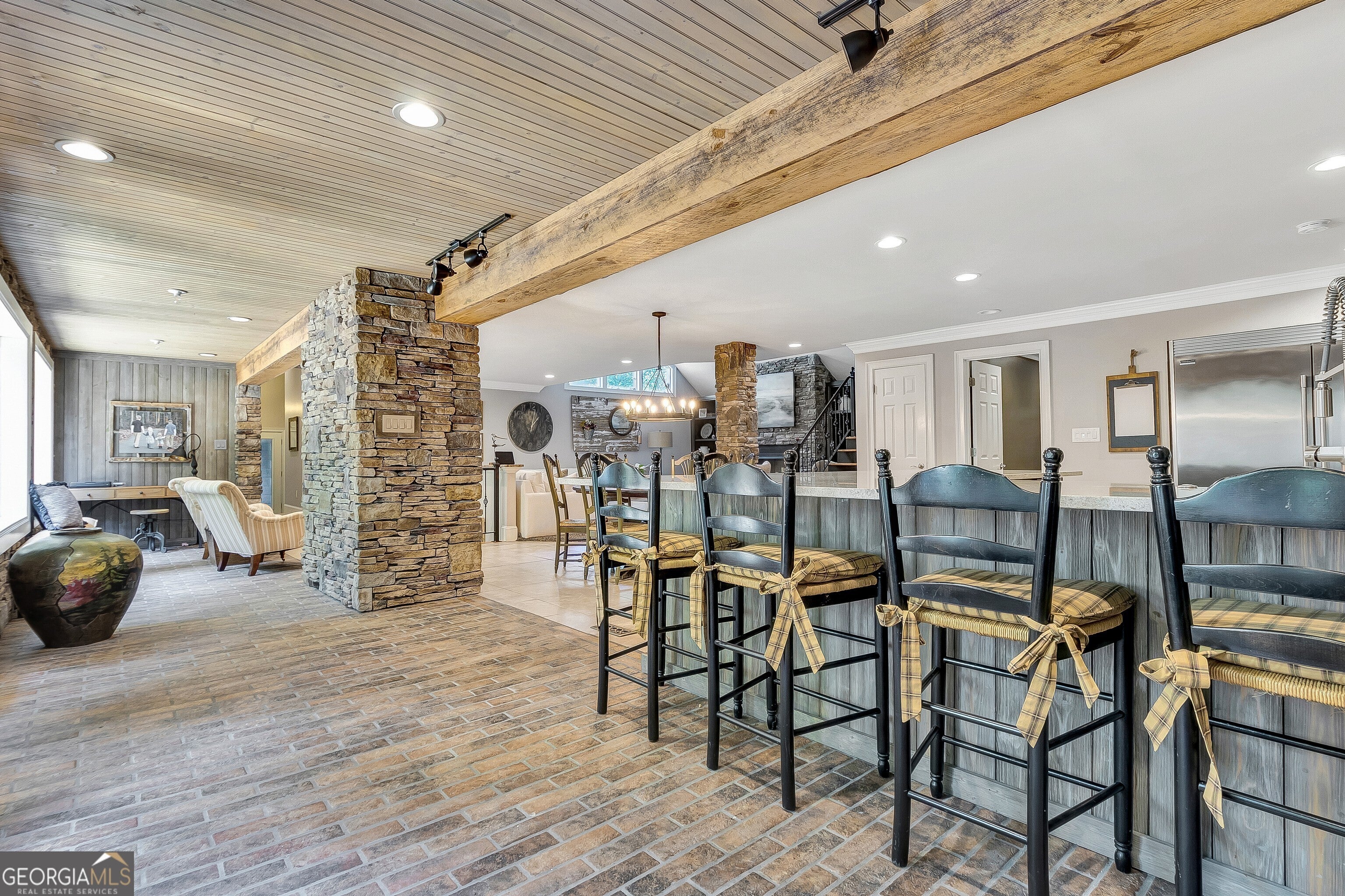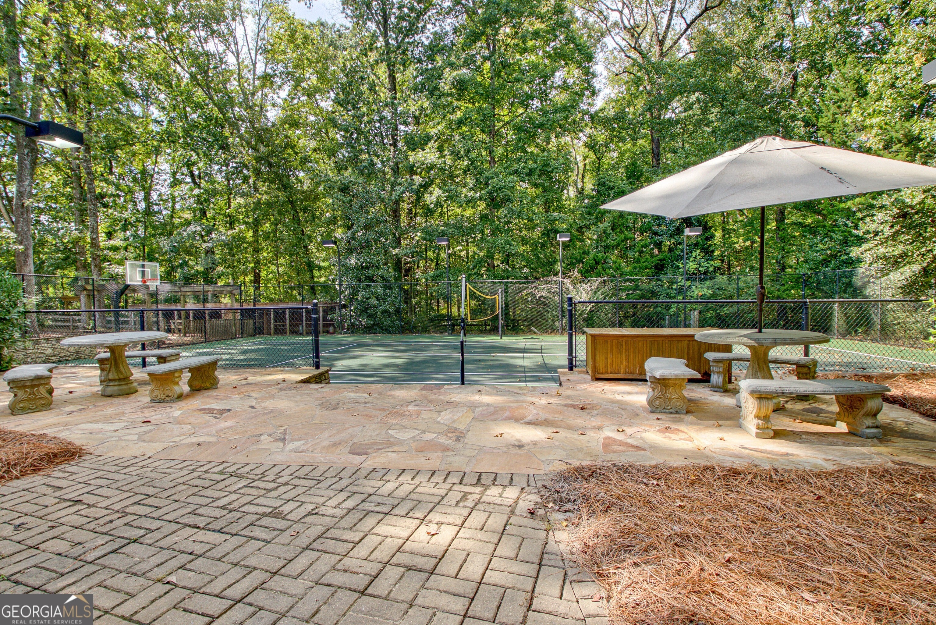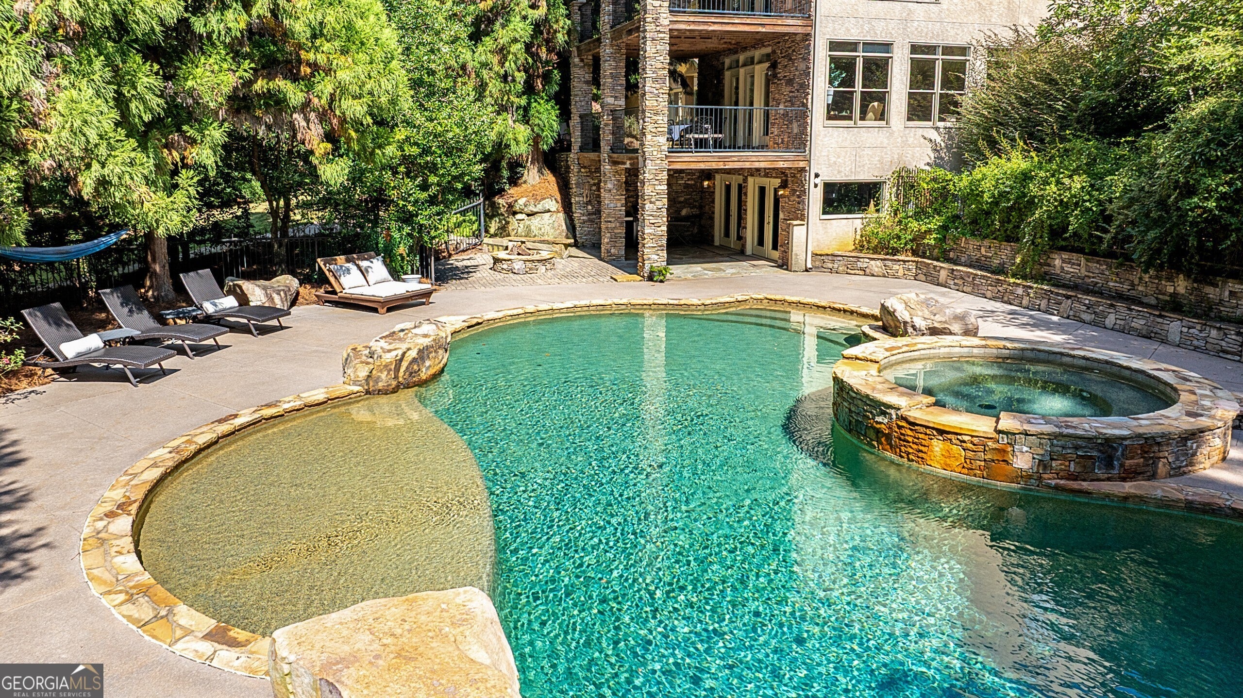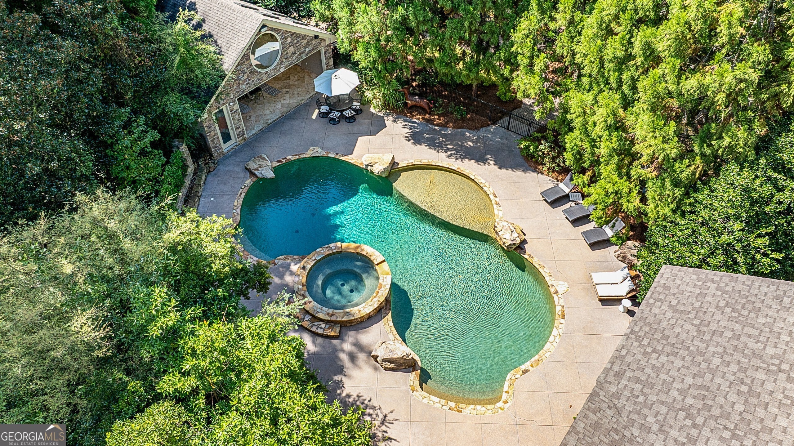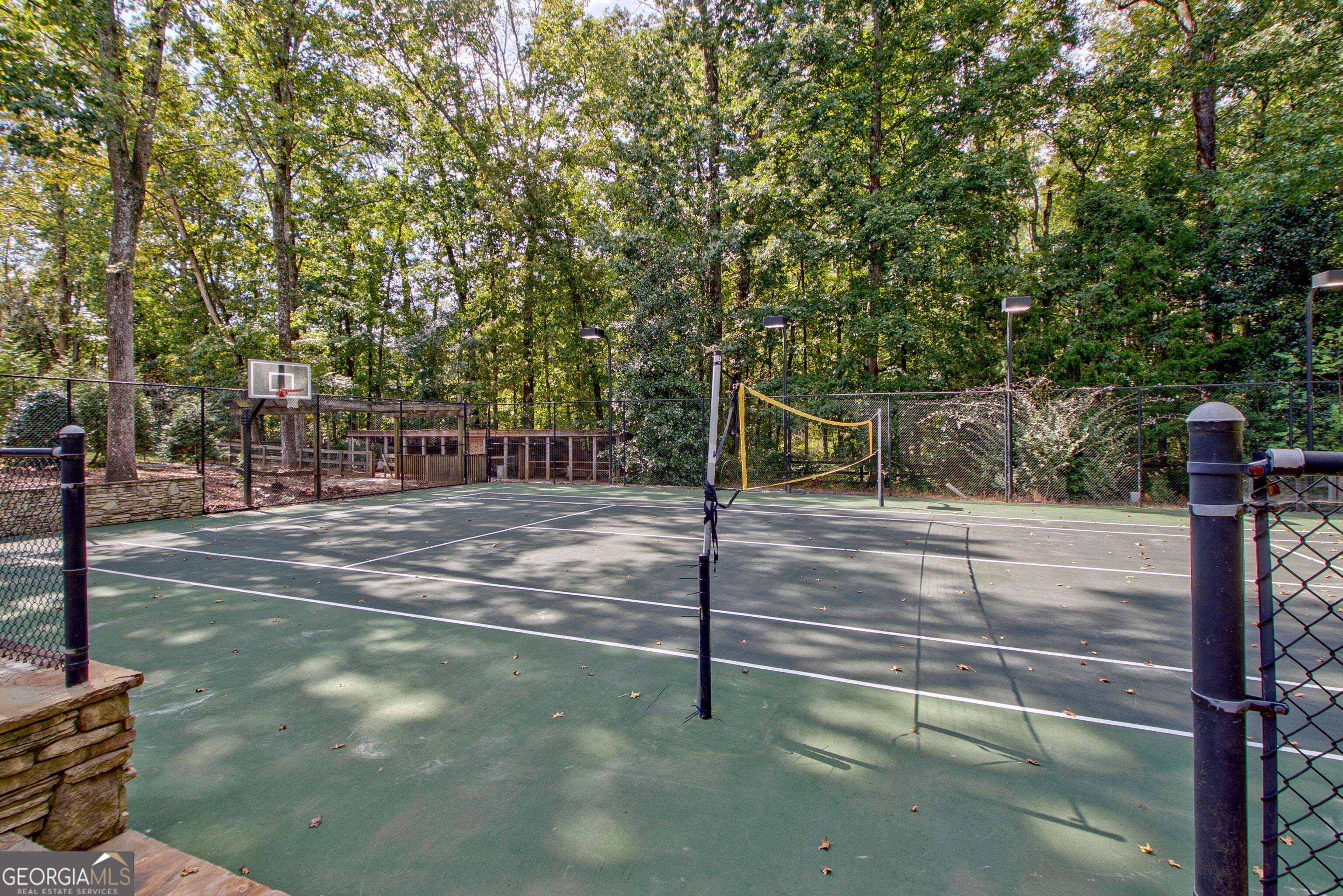 Discover this truly one-of-a-kind private, gated compound set on over 5 acres of meticulously landscaped grounds, offering three separate properties - ideal for multi-generational living. The nearly 9,000 sqft primary home offers 6 bedrooms, 4 full baths, 2 half baths, full terrace with dedicated theater room, game room, and bar for elevated living. Thoughtfully designed with two generous living areas with 2 wood burning fireplaces, a formal dining room, and a well-appointed kitchen complete with double ovens, and built-in commercial refrigerator/freezer - the home is perfect for everyday living and effortless entertaining. Rustic wood beams and stone accents infuse the home with authentic ranch-style character, and brick flooring leads to a charming wine cellar, adding to the unique appeal. In addition to the 5 bedrooms in the main home, an additional private guest suite with it's own entrance is located above the 2 car attached garage, making it ideal for teen suite, au pair living, or live-in housekeeper. A stunning 3-level deck overlooking the pool and serene landscape graces the rear of the primary home with covered porch views from the living room, primary suite and terrace level. In the backyard, the oversized pebble-finish pool and spa await, featuring tanning ledge and natural rock accents creating a resort-style setting complete with firepit. The freeform pool echoes nature and leads to the pool house with kitchenette with stone island, living room and full bath - making backyard hosting seamless. The second residence is a true stepless ranch and spans over 1300 sqft and offers 2 bedrooms and 2 baths, making it perfect for multi-generational living. With a full kitchen, living, and laundry, it is truly a second full home on the property. Attached to the second residence is a gym, expansive carport and and heated/cooled 2-car garage for the car enthusiast or woodworker, with attached office space. The third building on property which encompasses 660 sqft with half bath is ideal for a quiet workspace, creative enclave, yoga retreat, or art studio. All three residences, along with the poolhouse, are thoughtfully connected and cohesive in style and design. Shared architectural elements to include the unique round windows and curated accents create a harmonious flow throughout the property, seamlessly blending with the surrounding landscape. Approaching the primary home, a serene pond featuring a dock and pavilion offers a picturesque setting to relax. Stone and brick pathways wind gracefully throughout the property, leading to a private lighted tennis/pickleball/basketball court, expansive grassy lawns and peaceful patios nestled beneath canopies of mature trees inviting exploration at every turn. With no HOA restrictions, this estate offers the freedom to make it your own - bring your RV, boat, or add chickens to the existing chicken coups - all while enjoying the privacy and space of your own 5-acre retreat. The grassy lawn is great for football, baseball, soccer, golf, and even offers enough space for helicopter landings! Set in Peachtree City GA, a mere 15 miles from Atlanta's Hartsfield-Jackson International Airport, you will feel like you are a world away from everything, while still near first-class entertainment, retail,dining and transportation. Peachtree City offers 100+ miles of golf cart paths, and the estate is zoned for the highly-rated McIntosh High School district.