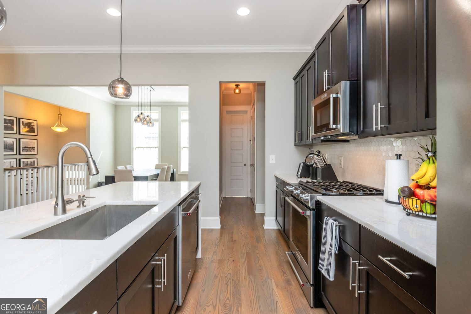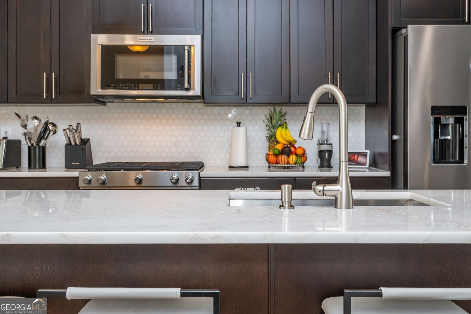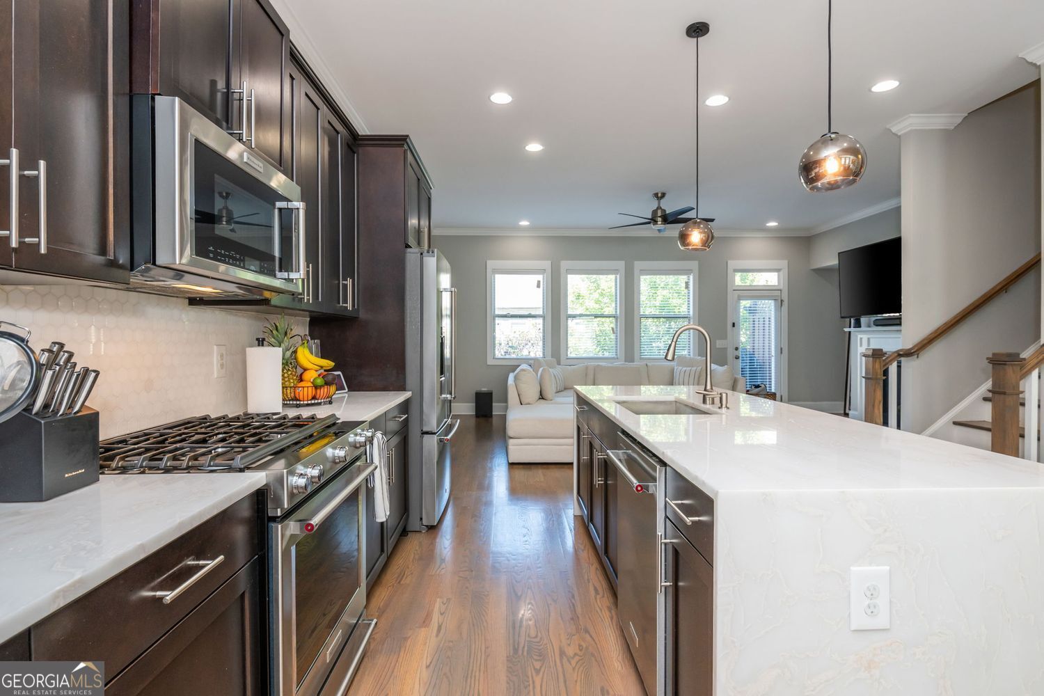 Brock Built craftsmanship meets a best-in-class location. Set in Vinings on the Chattahoochee, this townhome puts Westside Provisions, The Battery/Truist Park, Vinings Jubilee, Smyrna Market Village, Buckhead and Midtown within easy reach-two quick turns to I-285/I-75, yet tucked into a quiet, sidewalked, swim/tennis community. Inside, a designer kitchen with marble waterfall island, hex marble backsplash, gas range and rich shaker cabinetry anchors an open main level framed by all-hardwood floors. The great room lives large with a modern gas fireplace and a wall of windows that step out to a treetop deck-private, green, and perfect for evenings in. Upstairs, the tray-ceiling primary suite offers a double vanity and glass walk-in shower, while secondary bedrooms keep the floor plan flexible. Downstairs, a rare walk-out terrace level with full bath opens to a fenced backyard and covered patio-true indoor-outdoor living you won't find in most comparables. A two-car garage, fresh systems, and move-in polish round it out. Bolton Academy zone. Appliances convey. Homes with this pedigree and position don't sit. Arrange your private showing today-call your agent for immediate access.