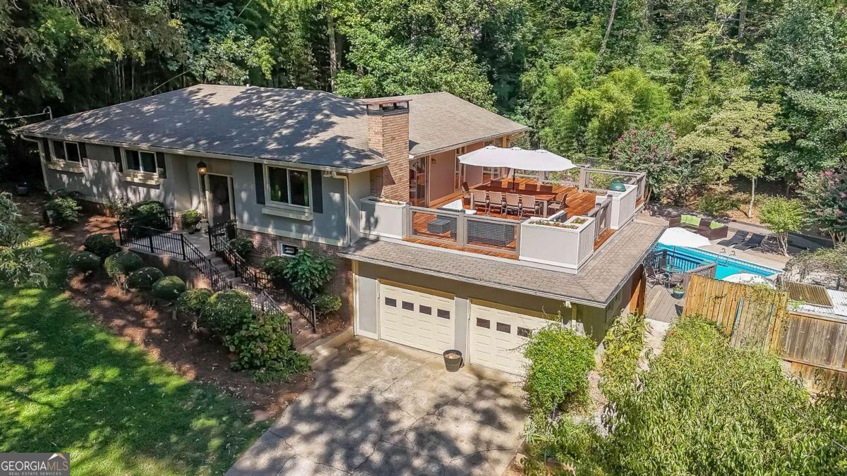 This one is the perfect combination of warm and charming indoor space and amazing outdoor living. The lot has wonderful privacy with a natural side yard with mature trees and plantings and a garden of wildflowers leading to the backyard where the inground pool sits surrounded by beautiful landscaping and a beautiful pergola. The decking that surrounds the pool includes a covered deck with a cozy sitting area, open deck area for grilling, a more secluded area with a hot tub and sitting area, and then the most amazing rooftop deck overlooking the property you could imagine complete with planting boxes and built in smoker station. The interior of the home is so charming with multiple common areas including a fireside family room with built in bookcases and a sunroom. There are 3 bedrooms on the main level and a basement with a newly finished full kitchen, an office that could be utilized as a 4th bedroom, and a full bathroom. No carpet anywhere and tons of natural light flowing in. Outbuilding on property for storage. Wonderful community with no HOA and a picturesque lake across the street from the property. Great schools and access to all highways. This property is more than a house, it is truly a retreat!