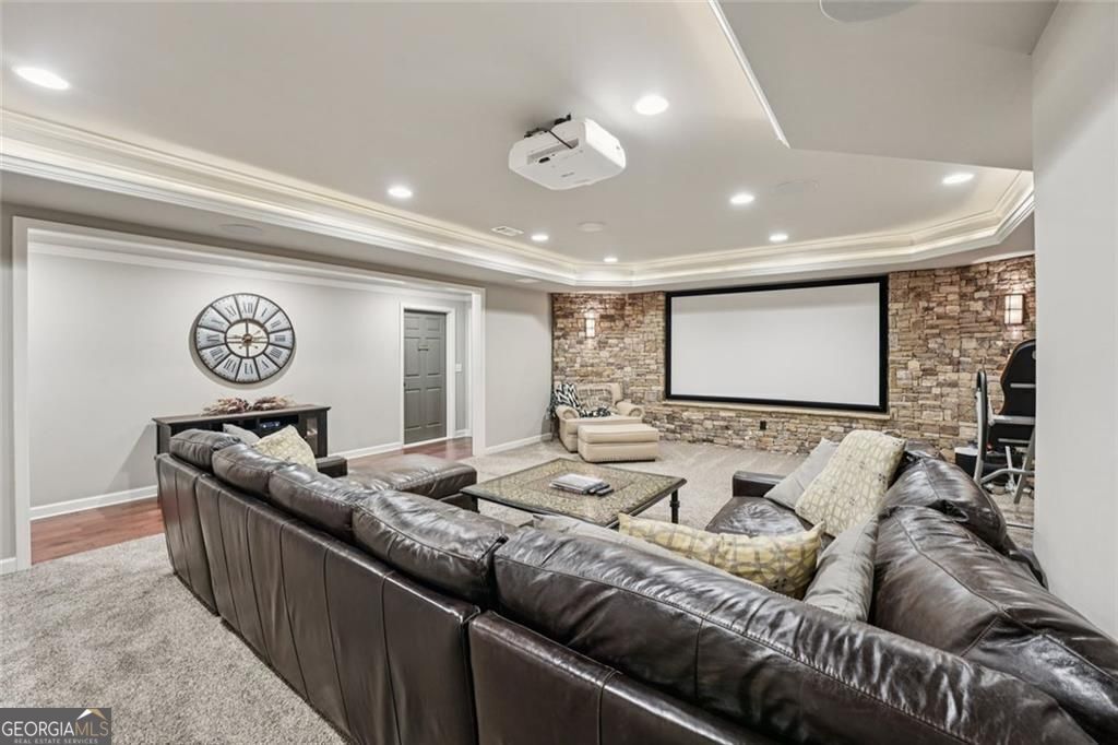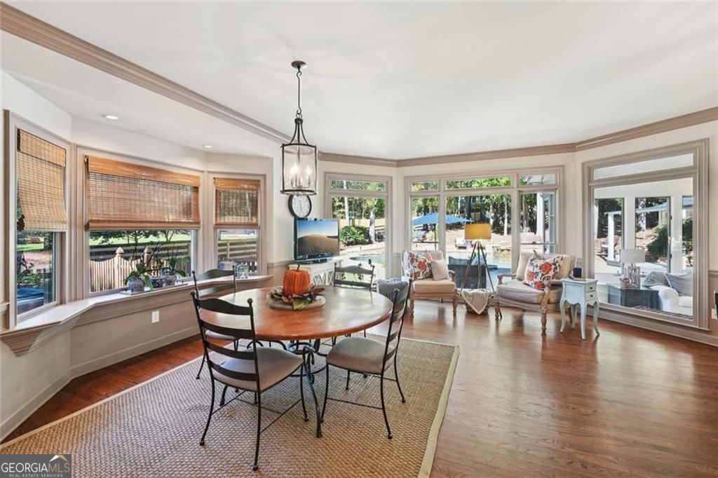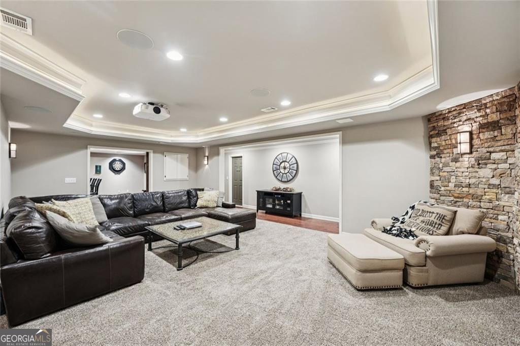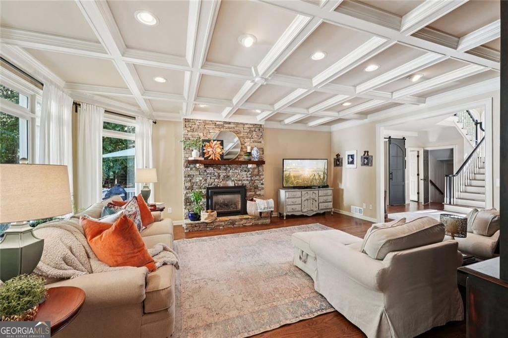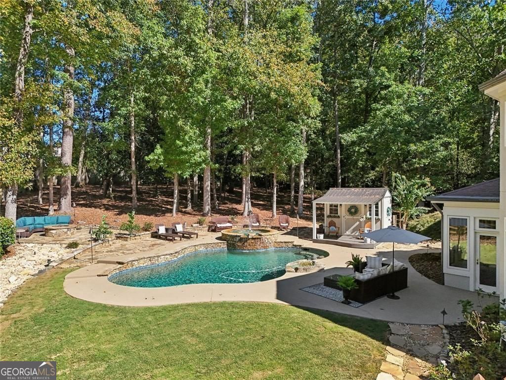 Exquisite French Country estate designed by renowned architect Stephen Fuller-a masterpiece of timeless elegance and luxury living. From the grand two-story entryway with dual staircases to the richly detailed coffered and trey ceilings, hardwood floors, and intricate trim work, every inch of this home exudes sophistication. The updated kitchen is a chef's delight, featuring stainless steel appliances, granite countertops, a gas range, and a wall oven. The spacious kitchen and breakfast room flow seamlessly into a bright sunroom, perfect for relaxed mornings or entertaining. An oversized pantry with a second refrigerator provides exceptional storage and convenience. The upstairs primary suite with fireplace and a recently remodeled spa-like bath offers a serene retreat, upstairs you'll find three additional bedrooms and two full bathrooms, providing ample space for family or guests. The finished terrace level is an entertainer's dream, complete with a pub-style bar, theater room, guest suite, and full bath. Enjoy the warmth and ambiance of four fireplaces throughout the home, each adding charm and comfort to the living spaces. Step outside to the private, professionally landscaped backyard surrounded by evergreens and featuring flagstone walkways, a sparkling pool, and a relaxing spa-your personal oasis. Located in the sought-after Polo Golf and Country Club, within walking distance to Vickery Village, and just minutes from Cumming City Center, Halcyon, Big Creek Greenway, top-rated schools, and premier shopping and dining. With luxurious finishes and exceptional craftsmanship throughout, this residence offers both grandeur and warmth in one perfect package.