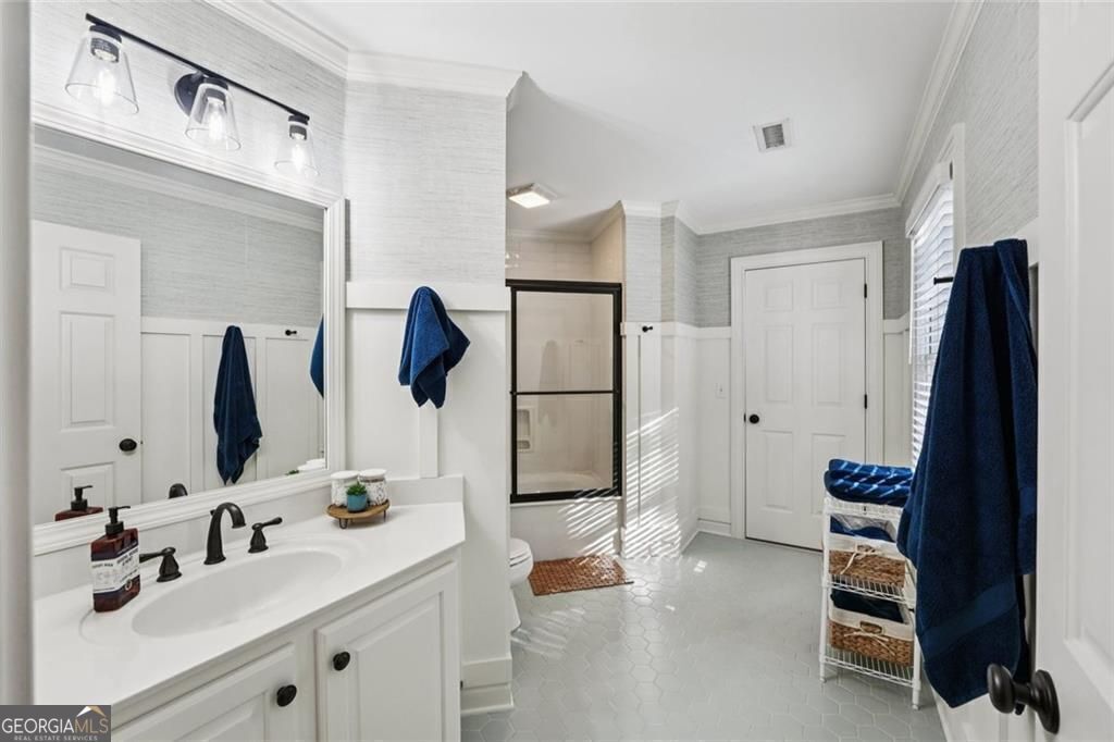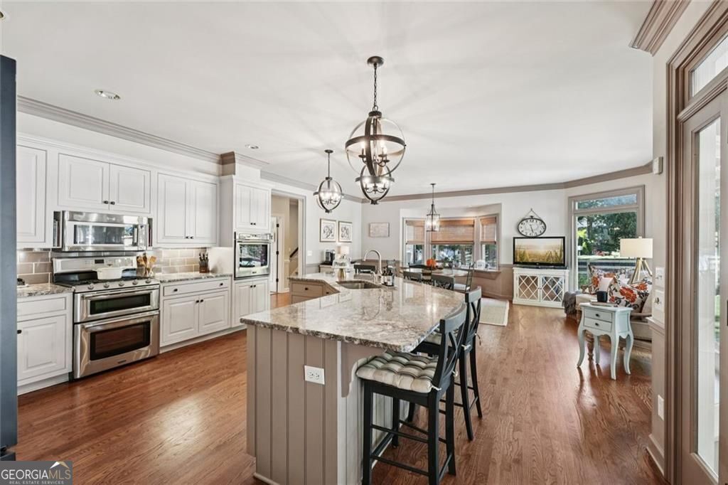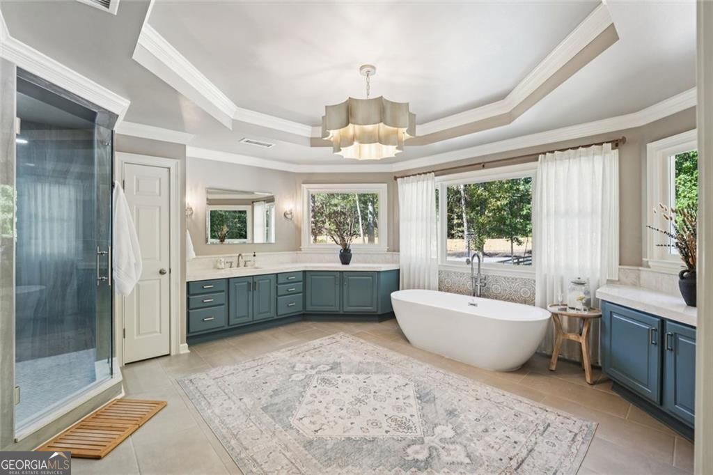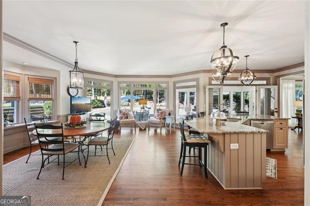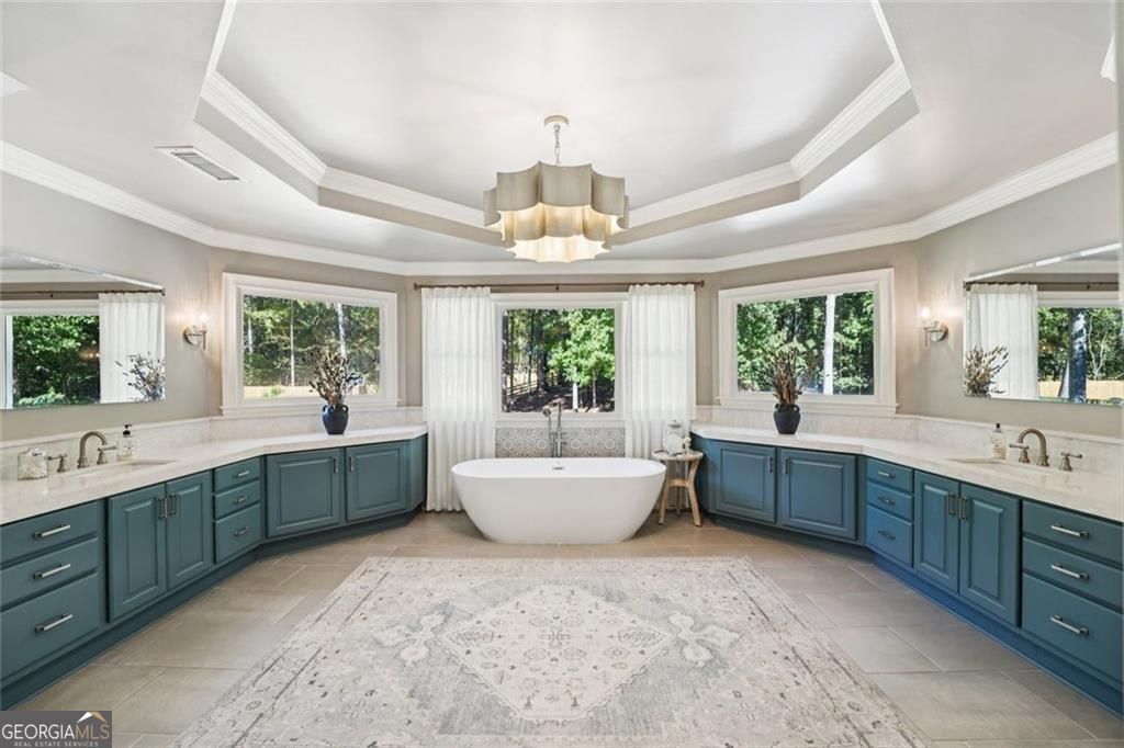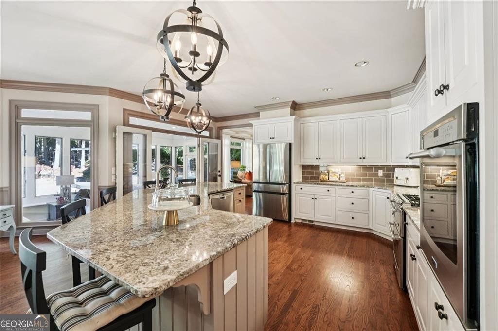 Exquisite French Country estate designed by renowned architect Stephen Fuller-a masterpiece of timeless elegance and luxury living. From the grand two-story entryway with dual staircases to the richly detailed coffered and trey ceilings, hardwood floors, and intricate trim work, every inch of this home exudes sophistication. The updated kitchen is a chef's delight, featuring stainless steel appliances, granite countertops, a gas range, and a wall oven. The spacious kitchen and breakfast room flow seamlessly into a bright sunroom, perfect for relaxed mornings or entertaining. An oversized pantry with a second refrigerator provides exceptional storage and convenience. The upstairs primary suite with fireplace and a recently remodeled spa-like bath offers a serene retreat, upstairs you'll find three additional bedrooms and two full bathrooms, providing ample space for family or guests. The finished terrace level is an entertainer's dream, complete with a pub-style bar, theater room, guest suite, and full bath. Enjoy the warmth and ambiance of four fireplaces throughout the home, each adding charm and comfort to the living spaces. Step outside to the private, professionally landscaped backyard surrounded by evergreens and featuring flagstone walkways, a sparkling pool, and a relaxing spa-your personal oasis. Located in the sought-after Polo Golf and Country Club, within walking distance to Vickery Village, and just minutes from Cumming City Center, Halcyon, Big Creek Greenway, top-rated schools, and premier shopping and dining. With luxurious finishes and exceptional craftsmanship throughout, this residence offers both grandeur and warmth in one perfect package.