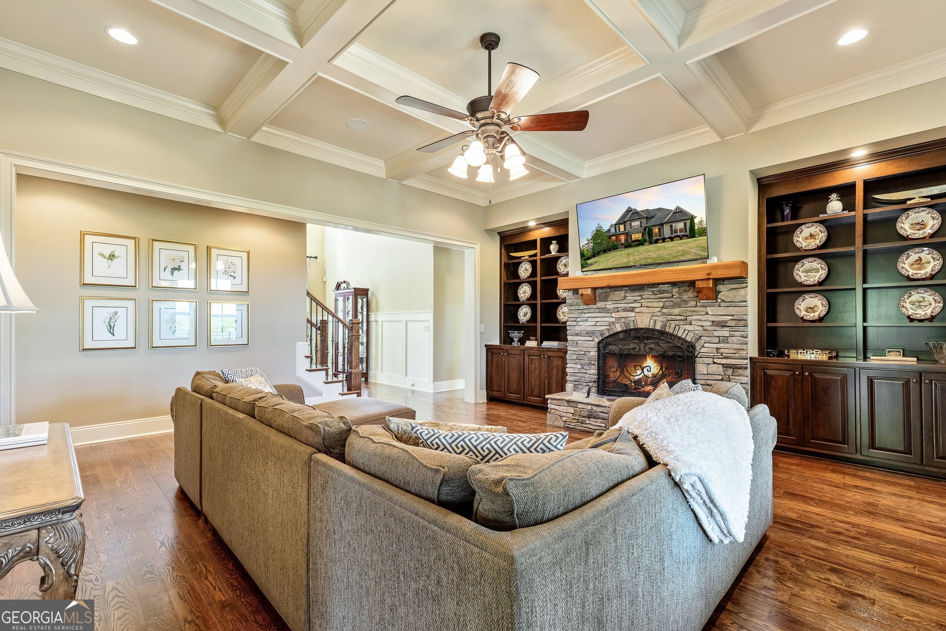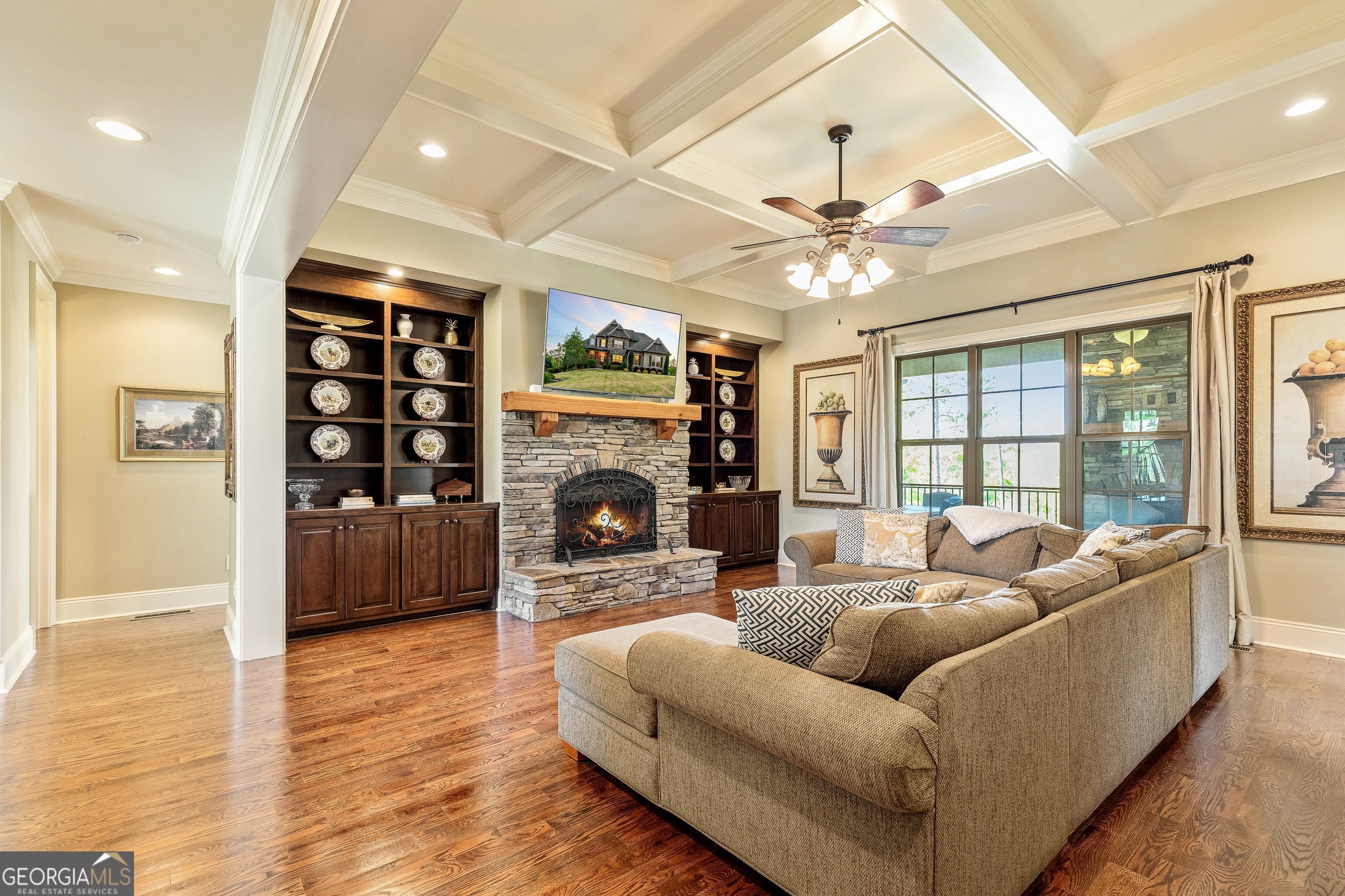 SELLER OFFERING 10K TOWARDS RATE BUY DOWN OR BUYER CLOSING COSTS! Welcome to 776 Arbor Springs Parkway, a stunning 6365 sq ft custom-built home nestled in the heart of Arbor Springs in Newnan, Georgia. Built in 2018, this home offers a seamless blend of refined Southern elegance and relaxed luxury. Meticulously maintained for the most discerning buyer, the home offers nearly 4,000 square feet of beautifully designed living space, including four spacious bedrooms and three and a half bathrooms. The left wing of the main level is dedicated to the serene primary suite and features a spa-like bath with soaking tub, separate shower, his and her sinks and an expansive double sided walk-in custom closet, perfect for organizing and showcasing your wardrobe in style. From the moment you arrive, you'll notice the signature details that define Frank Betz architecture-thoughtful trim work, rich wood tones, and an inviting covered front porch. Inside, soaring ceilings, gleaming hardwood floors, and oversized windows flood the space with natural light. The open-concept floorplan flows seamlessly into a gourmet kitchen, outfitted with leathered granite countertops, stainless steel appliances, custom cabinetry, double convection ovens, pot filler and a generous island perfect for gathering. Off the kitchen, a charming keeping room with cedar beamed vaulted ceiling creates an intimate space for relaxation or casual dining, offering a cozy inviting atmosphere. The family room and dining room boast coffered ceilings, built-in cabinets and a fantastic view onto the back yard and spacious deck. An additional 2,412-square-foot unfinished terrace level with walk-out access and generous windows invites natural light to pour in, offering endless possibilities for creating bright, expansive living spaces customized to your needs and ideal for a home theater, gym, in-law suite, or game room. Outdoor living is just as impressive, with a covered back porch featuring a stone fireplace with gas logs, perfect for enjoying cooler evenings surrounded by nature. The porch overlooks a peaceful one-acre lot framed by abundant nature offering wildlife viewing where deer, bunnies, and even the occasional visiting eagle make frequent appearances. A full irrigation system keeps the grounds lush, and a security system adds peace of mind. Located in the highly sought-after Arbor Springs community, residents enjoy access to a championship golf course, tennis and pickle ball courts, swimming pool, clubhouse, pavilion and scenic walking trails. Shopping and restaurants are only minutes away, making it easy to enjoy everything Newnan and Peachtree City have to offer. With just 22 minutes to Hartsfield-Jackson International Airport and quick access to I-85, Northgate schools, and more, this home offers an exceptional blend of luxury, lifestyle, and convenience.