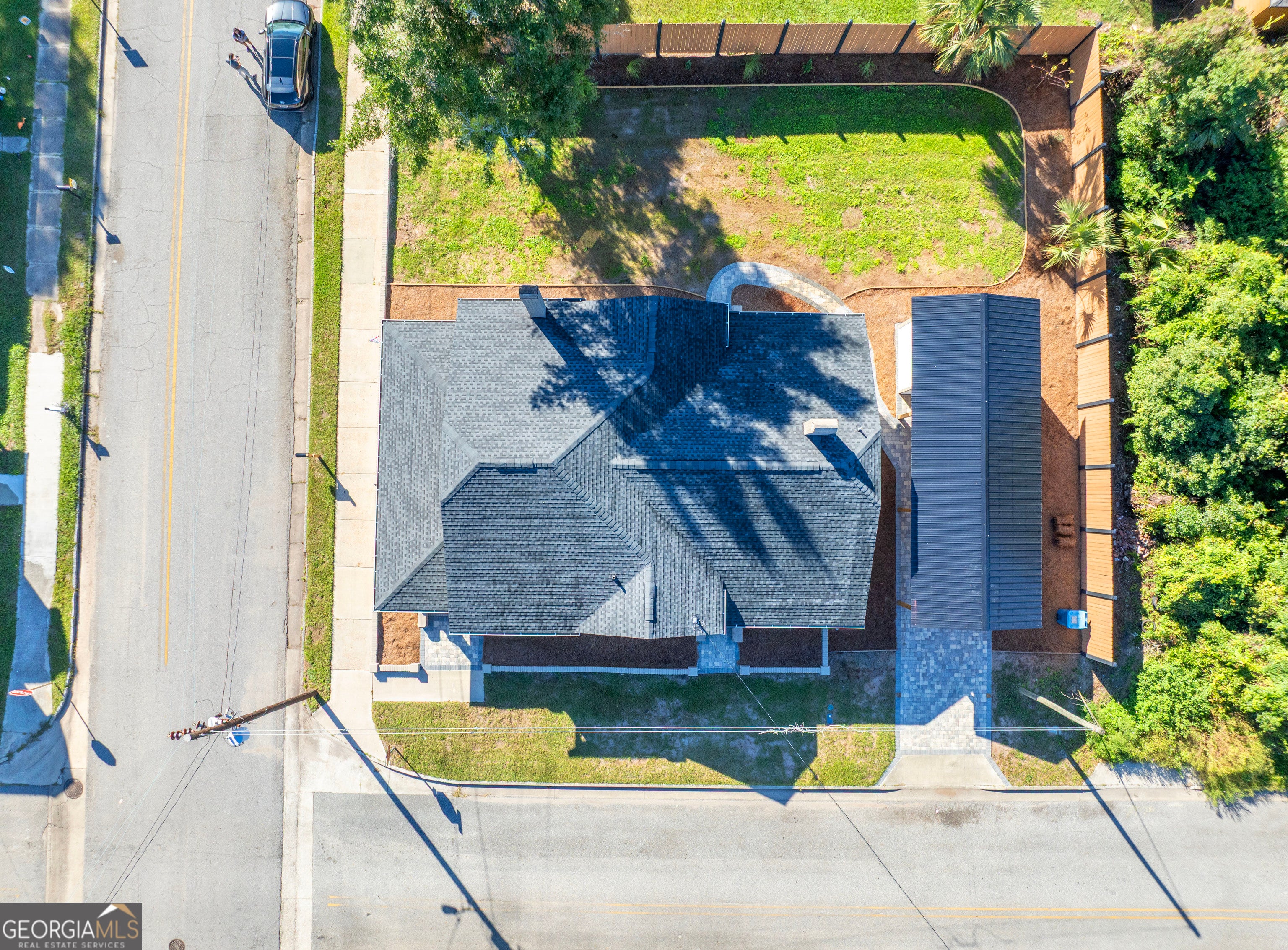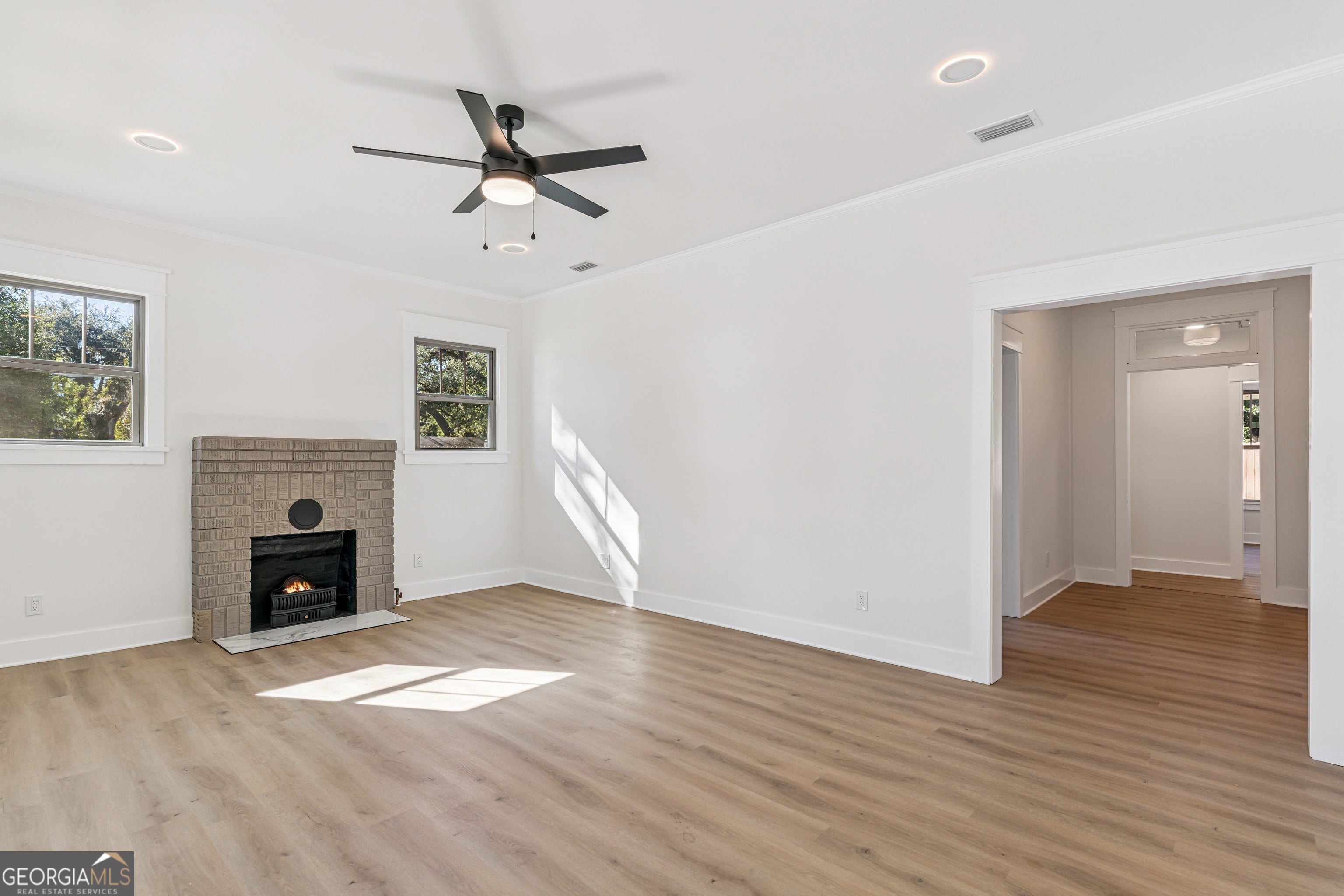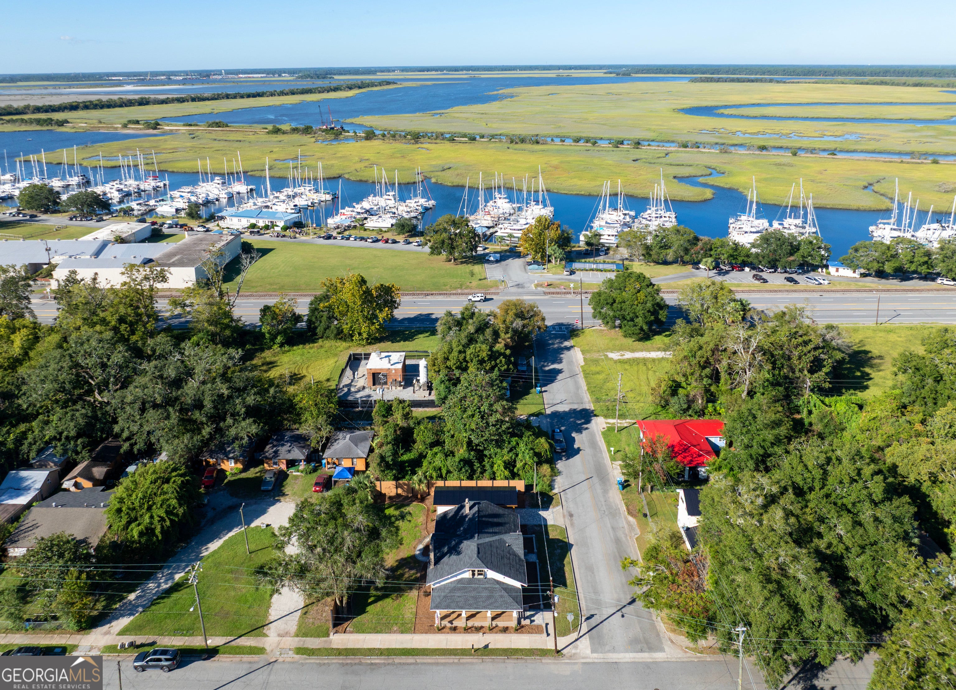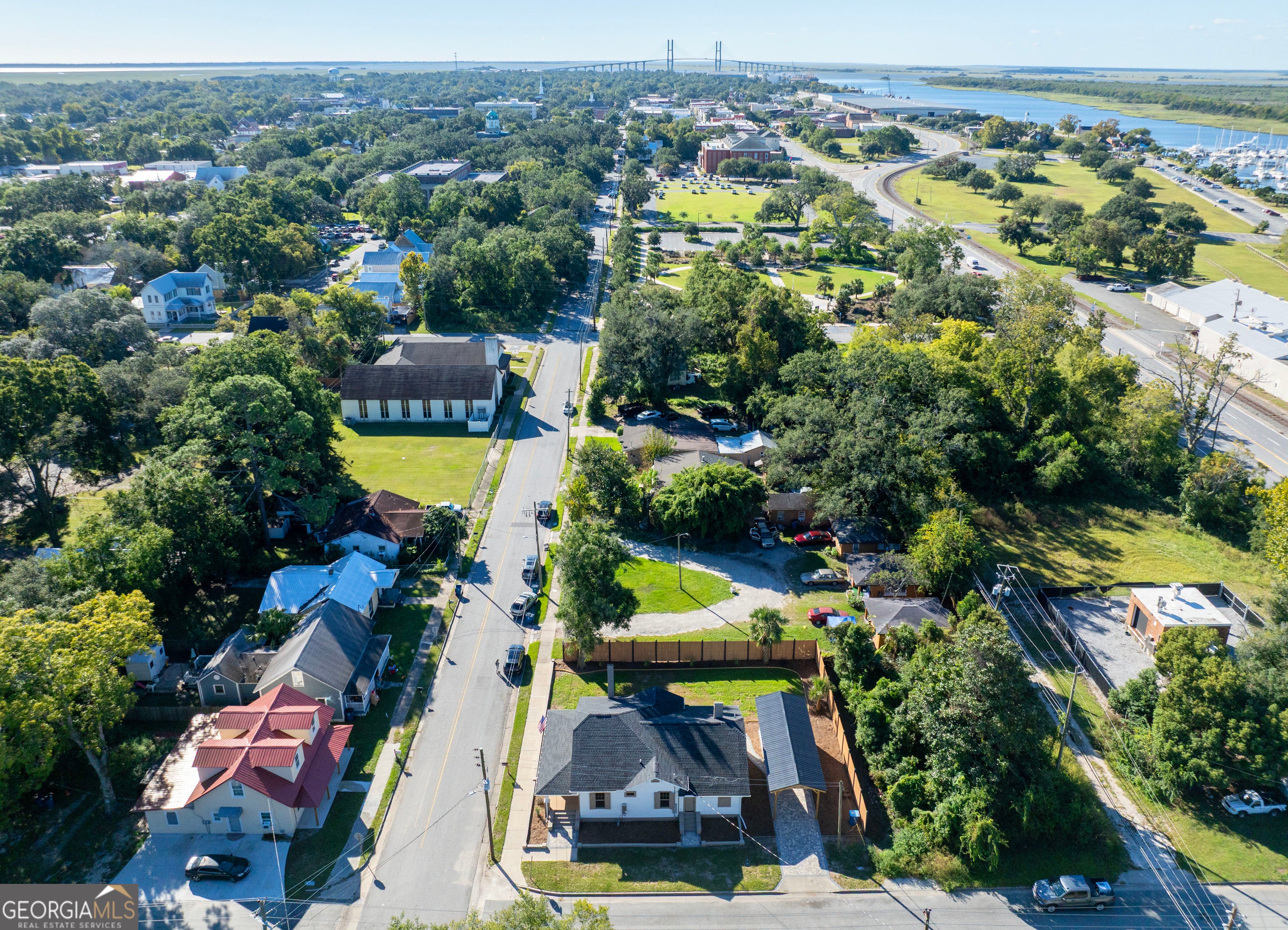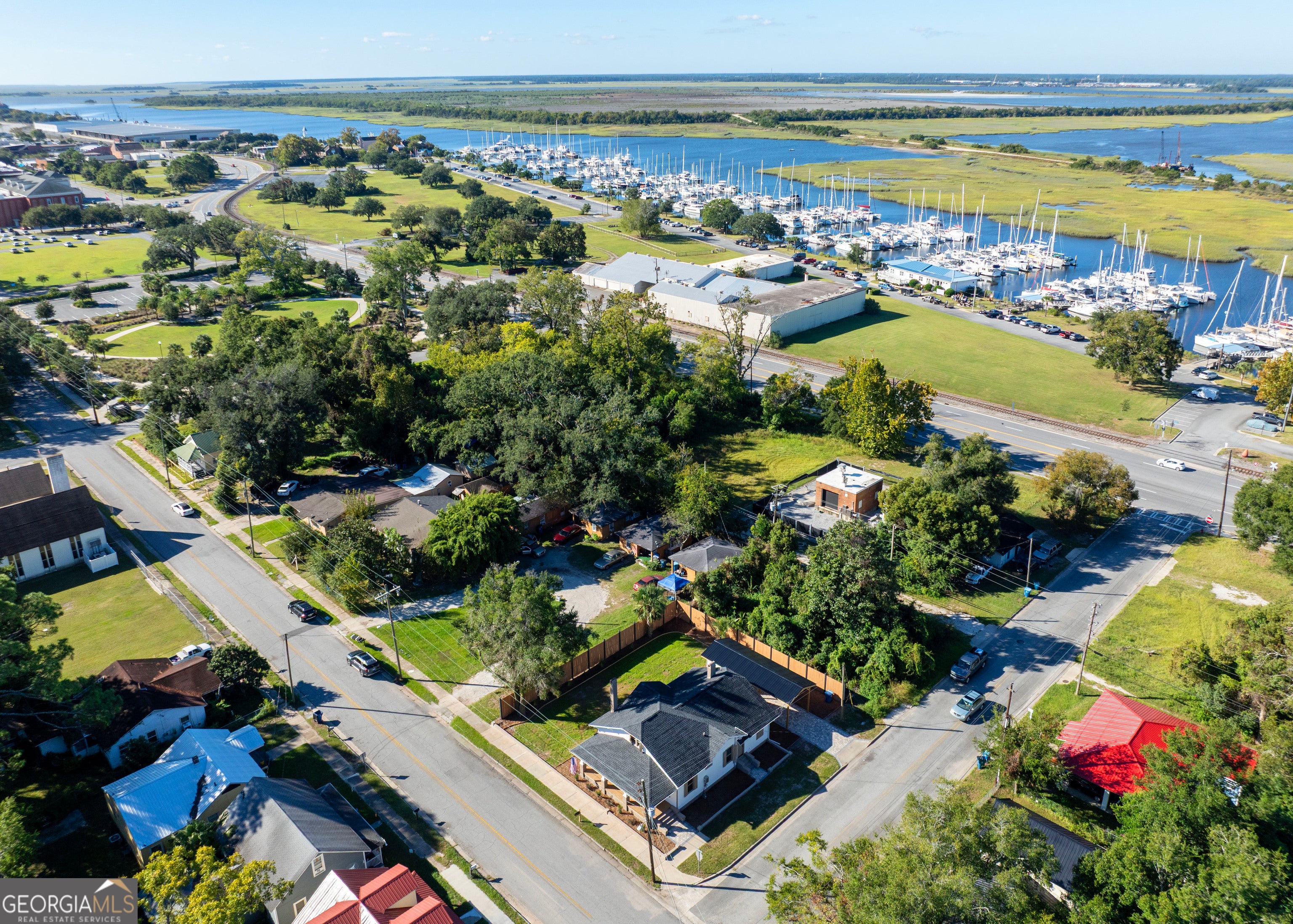 Experience the charm of Historic Downtown Brunswick in this fully renovated Craftsman-style home, ideally located just one block from the Brunswick Landing Marina and Veterans Memorial Park, and an easy stroll to the shops, galleries, and restaurants of Historic Downtown Brunswick. This corner-lot residence blends timeless architectural character with modern luxury. The home has been completely reimagined-nothing left untouched. Inside and out, enjoy a freshly painted exterior and interior, a 2-year-old roof, new HVAC, new plumbing and electrical (including nightlight feature fixtures), new double-pane windows, batt and blown-in insulation, and a tankless water heater. Step onto the rocking-chair front porch with its charming porch swing, then enter into a bright and inviting living area featuring a fireplace with ventless gas insert and open flow to the heart of the home. The custom kitchen showcases white cabinetry, quartz countertops, stainless appliances, gas range, and an exposed brick accent wall for added character. Your kitchen flows into the dining room which also includes a gas fireplace and wine bar with wine fridge. The home offers three bedrooms with original wood ceilings and two beautifully updated baths. The guest bath includes tile flooring, a tiled shower, new fixtures, and a quartz-topped vanity. The owner's bath features a soaking tub, quartz vanity, tile floors, and stacked full-size laundry for convenience. Additional highlights include new luxury vinyl plank flooring throughout, pull-down attic stairs, and alley access with a paver driveway, carport, and storage building. The private backyard is enclosed with an 8-foot privacy fence, offering the perfect blend of historic charm and modern comfort-right in the heart of Brunswick's most desirable walkable neighborhood.