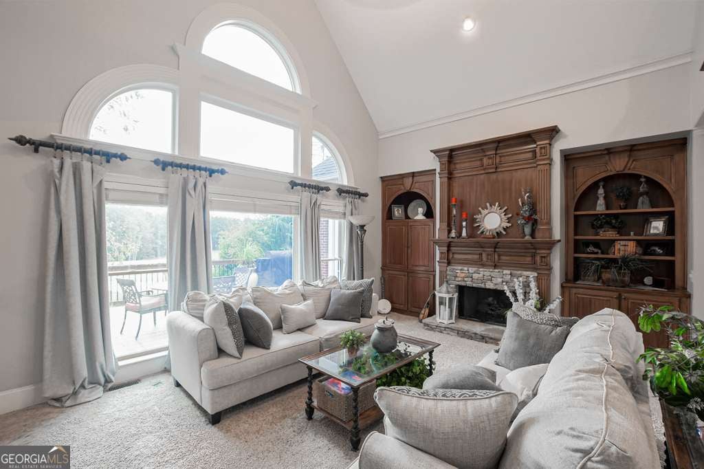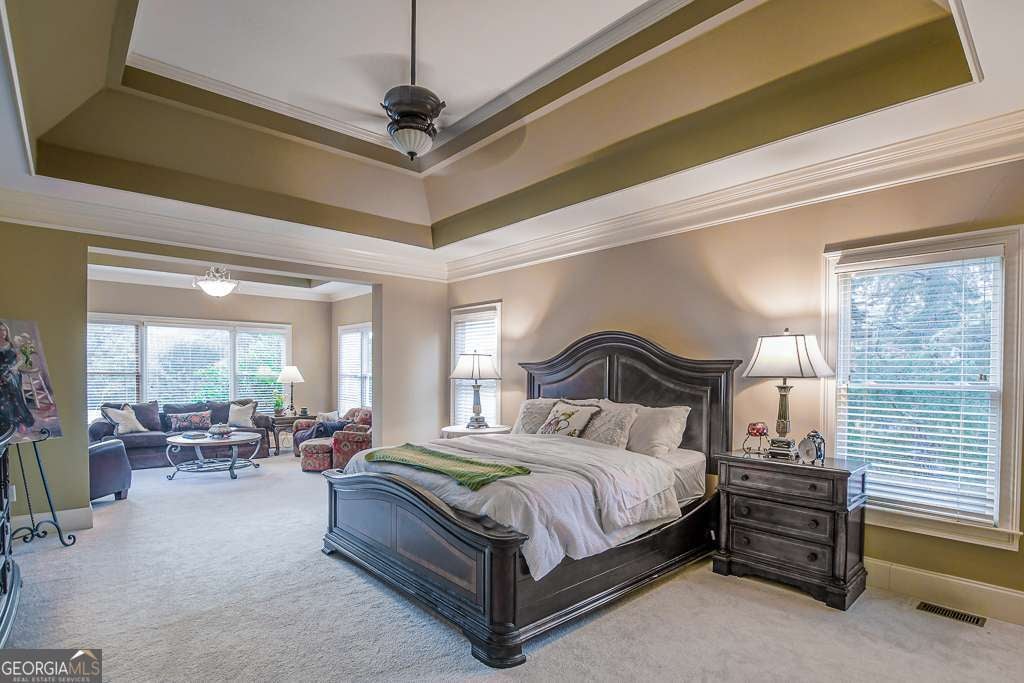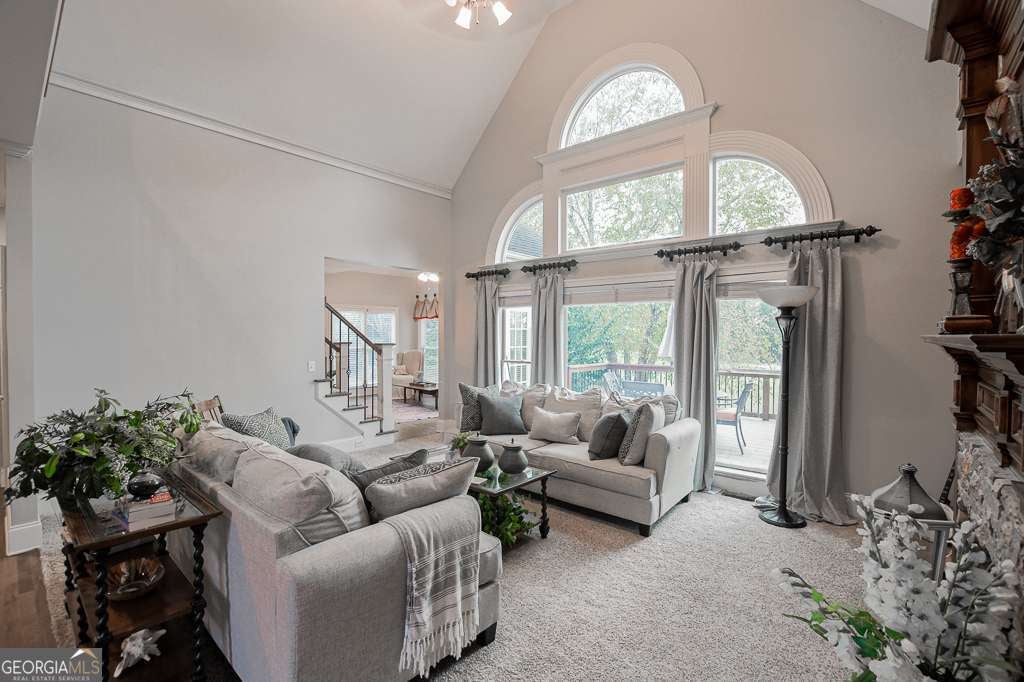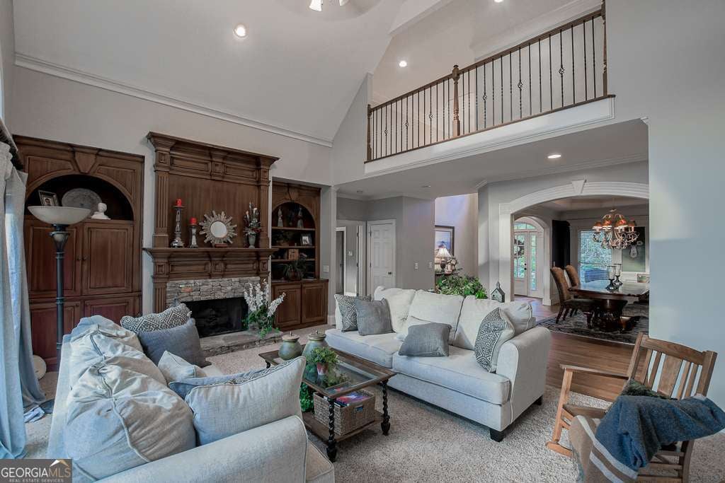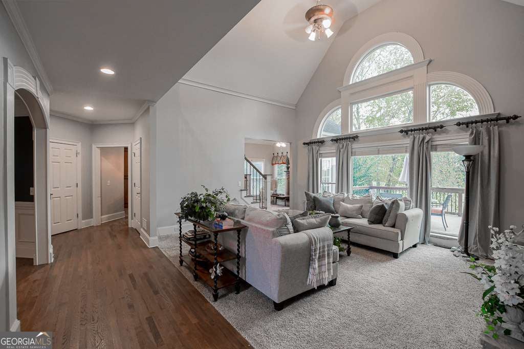 Experience refined country club living at 1041 Windermere Crossing, an elegant single-family residence located within the prestigious Windermere community in Forsyth County. This beautifully appointed 4-bedroom, 4.5-bath home offers timeless architectural design, exceptional craftsmanship, and expansive living spaces across two levels plus a fully finished basement, totaling approximately 5,977 square feet (per public records). Upon entry, you are welcomed by a dramatic two-story foyer and a stunning great room featuring soaring 20-foot ceilings, abundant natural light, and custom details throughout. The chef's kitchen is thoughtfully designed with high-end appliances, solid surface countertops, stained cabinetry, a breakfast bar, and an inviting keeping room, perfect for both everyday living and entertaining. Formal dining comfortably seats 12+ guests, making it ideal for gatherings. The primary suite on the main level offers a private retreat complete with a sitting area, spa-inspired bathroom featuring double vanities, whirlpool tub, separate shower, vaulted ceilings, and a generous walk-in closet. Additional living spaces include a media room, exercise room, office, family room, and a fully finished daylight basement with interior and exterior access. Step outside to enjoy a private patio, deck, and front porch, ideal for year-round enjoyment. The backyard patio features a permanently attached gas grill, perfect for entertaining. Situated along the 13th hole of the Windermere Golf Course, the property offers scenic golf course views and a peaceful, landscaped lot. Residents enjoy access to resort-style amenities, including championship golf, tennis courts, a swimming pool, a clubhouse, playground, walking trails, and street-lit neighborhoods. Additional features include three fireplaces, hardwood and carpet flooring, zoned heating and cooling, rear stairs, high-speed internet, an irrigation system, and a three-car side-entry garage with kitchen-level access. Conveniently located near top-rated South Forsyth schools, upscale shopping, dining, and major roadways. Home is occupied and not vacant. Appointment required for showings.