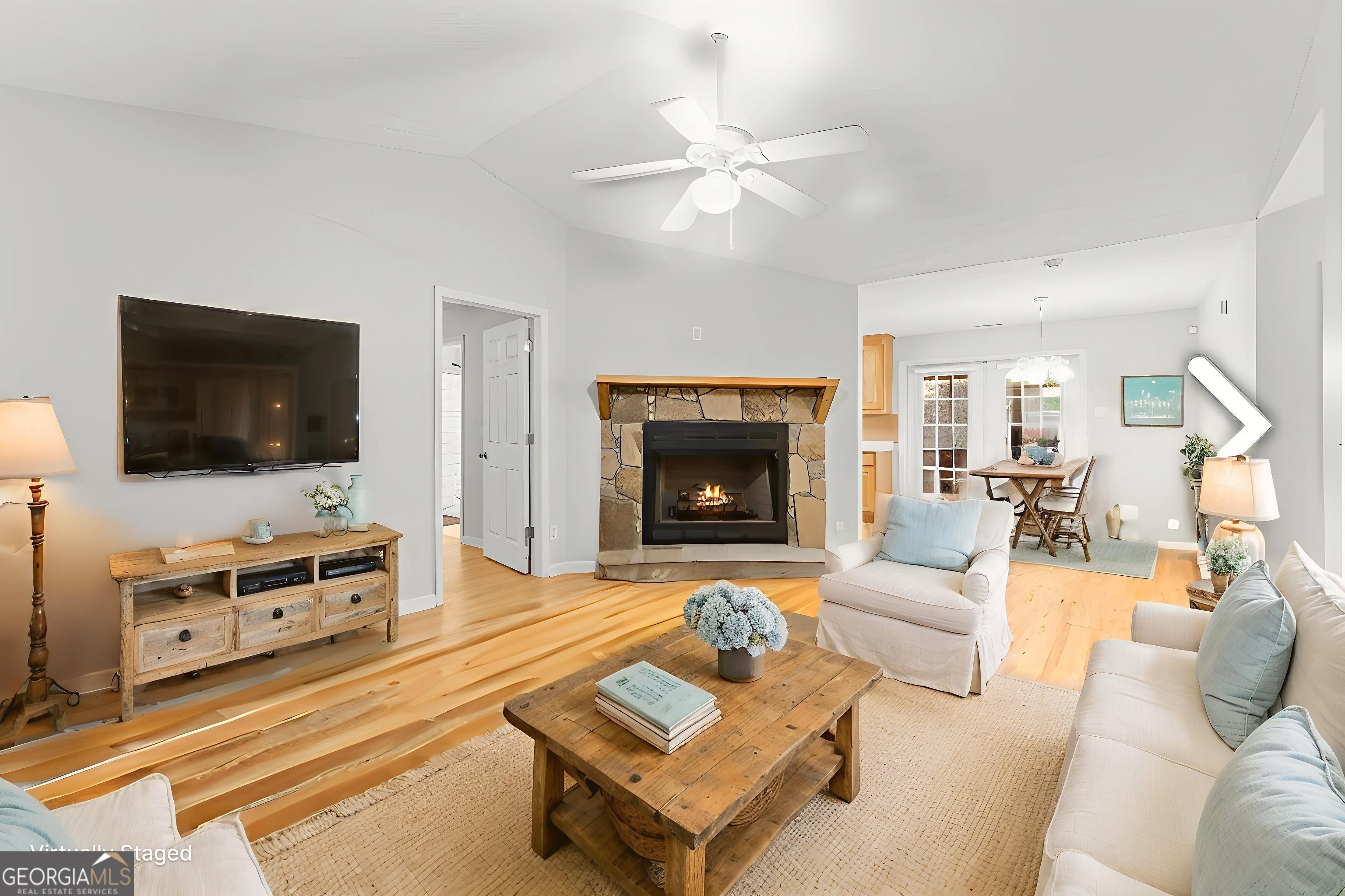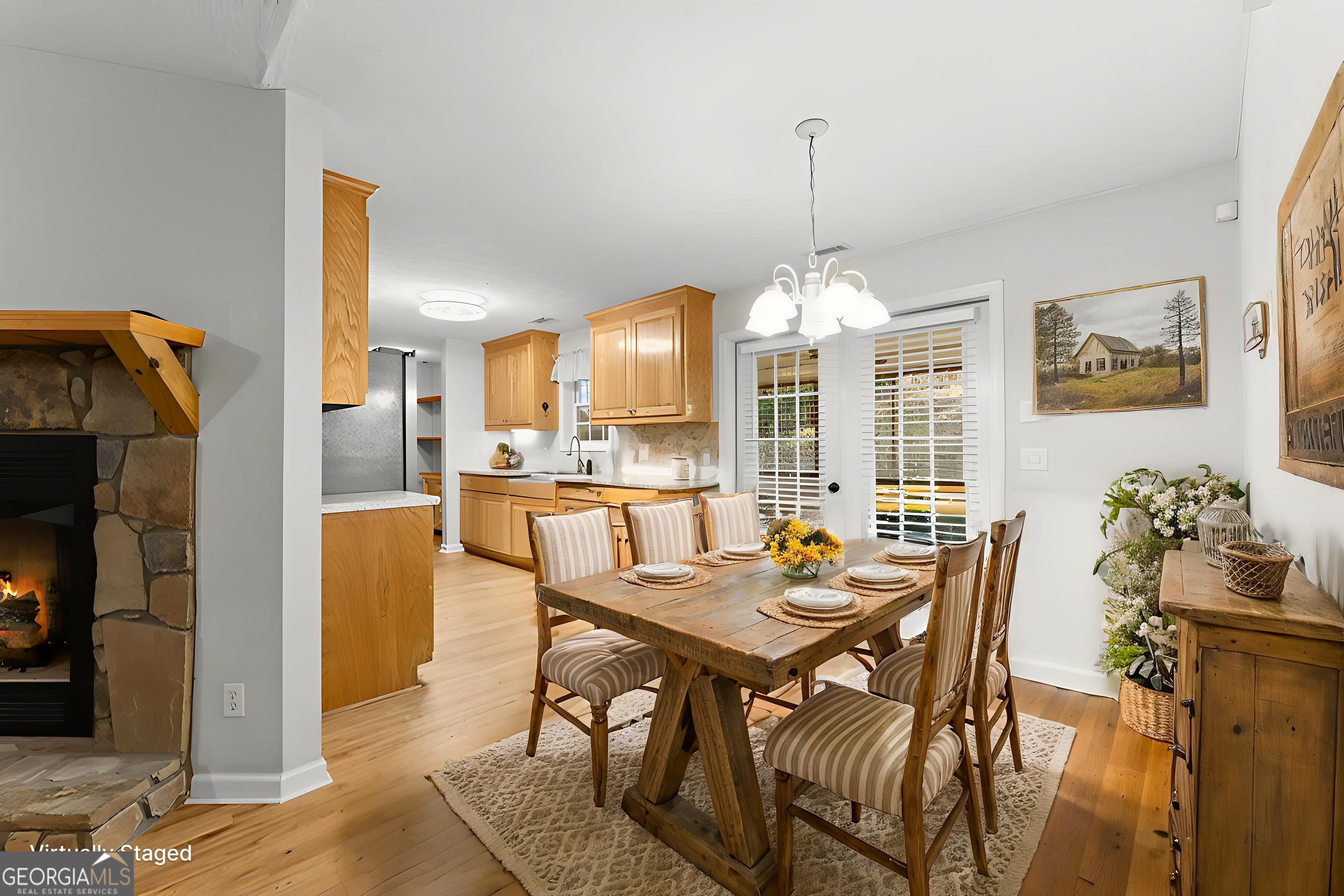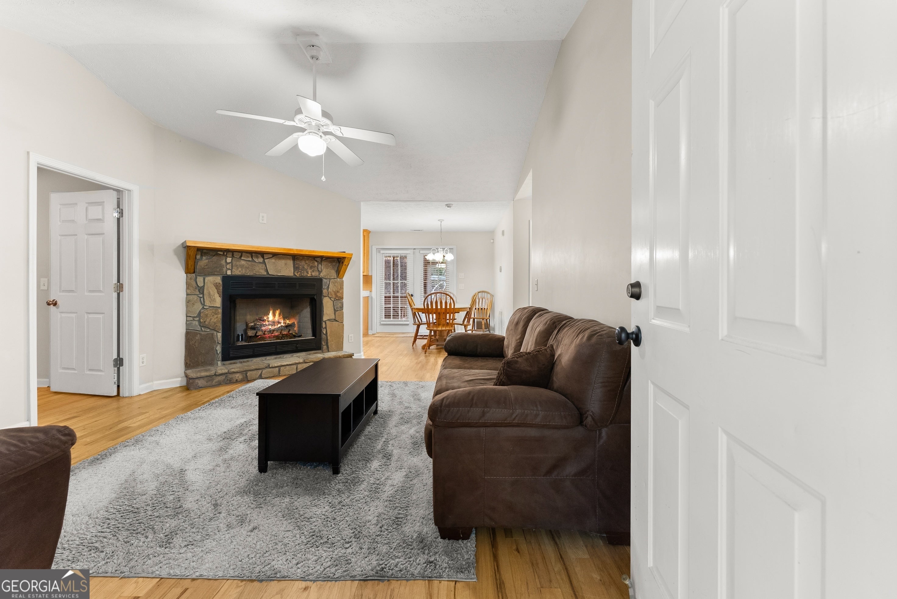 Welcome home to this beautifully maintained, spacious ranch nestled in a quiet, established neighborhood that offers the perfect blend of seclusion and convenience. Ideally situated just minutes from Dahlonega, Gainesville, and Dawsonville, this charming home provides a serene lifestyle without sacrificing accessibility. Set on over an acre of open, usable land framed by mature trees, the sunny lot offers abundant space for gardening, pets, entertaining, or simply enjoying the outdoors. Inside, you'll find a thoughtfully designed single-level layout with a split-bedroom floor plan and genuine hardwood floors throughout, combining warmth, character, and practicality. The inviting living room greets guests with a real stone wood-burning fireplace, creating a cozy centerpiece just off the formal dining area. The galley-style kitchen is both functional and charming, features SS appliances, featuring an oversized walk-in pantry and a convenient laundry area that flows seamlessly into a generously sized second living room-perfect for gatherings, relaxing, or entertaining. This versatile space features two heat sources: a wood-burning stove and an additional fireplace, offering both ambiance and flexibility. Additional highlights include: Two-car garage with a hidden built-in storm shelter/safe room. Covered parking at the front entrance and outside storage building. Abundant indoor and outdoor living space. Quiet, natural surroundings that feel remote yet remain highly accessible. Whether you're looking for peace and privacy, room to grow, or a forever home close to nature and community, this exceptional property checks all the boxes. Schedule your tour today and discover the unmatched comfort and charm this home has to offer. USDA Eligible.