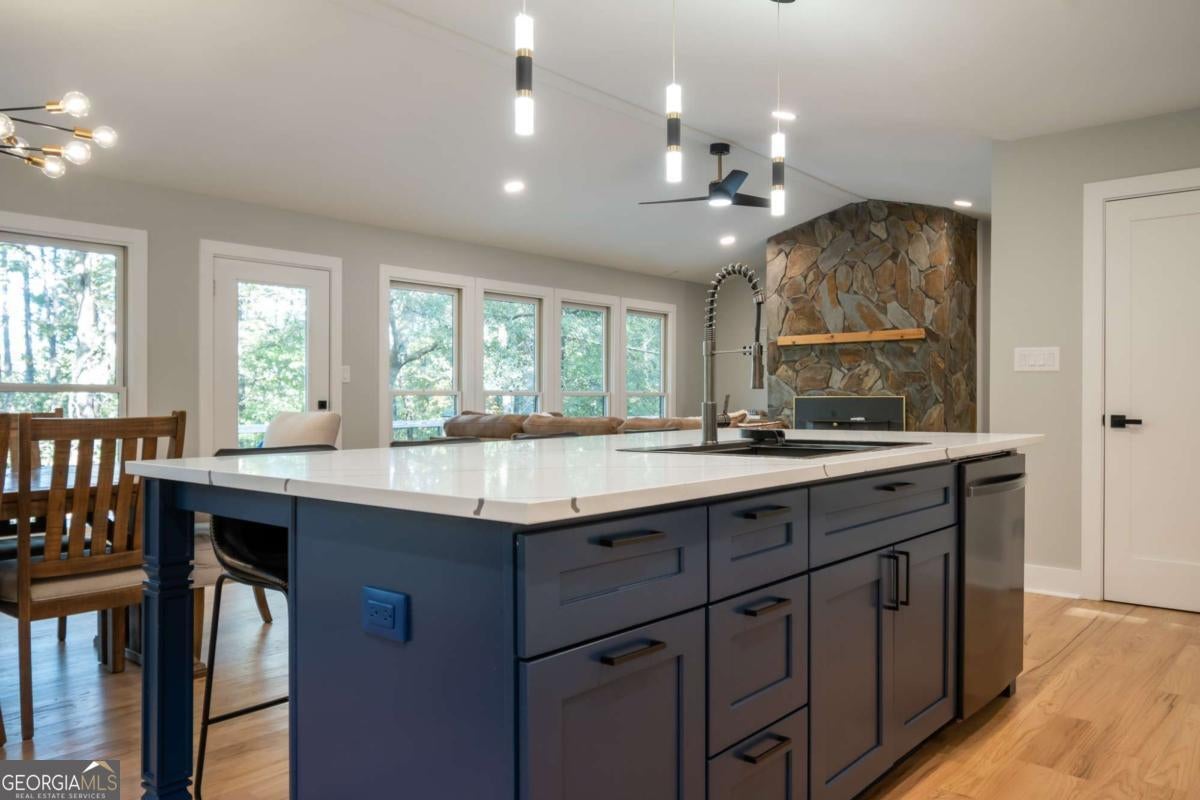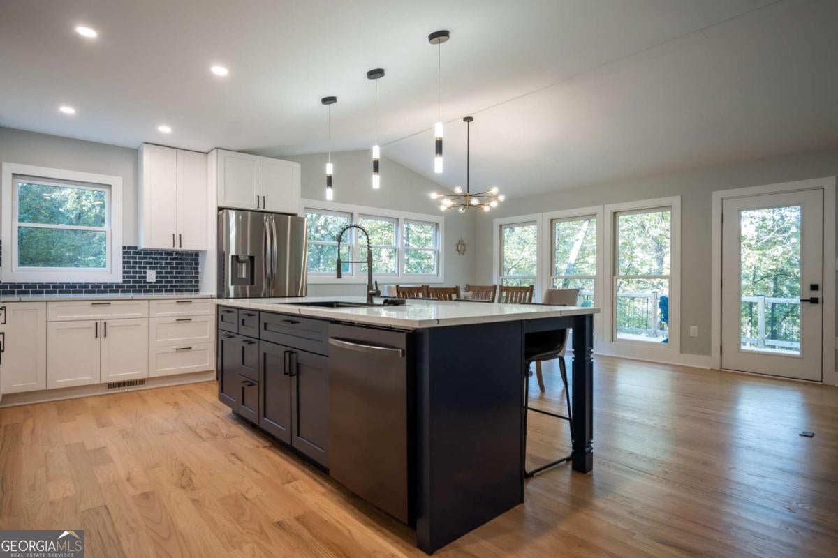 This extensively remodeled lake home offers endless possibilities as a wonderful retreat. The ranch plan with a full basement has been thoughtfully separated into two distinct living spaces. There are fireplaces on both levels of the home. The left side of the home features three bedrooms, two and a half bathrooms, a living room, and an open-concept kitchen and family room downstairs. The right side currently includes two sleeping areas and a small living room. All bathrooms are exquisite in their remodel, with the master being its own private retreat. Recent upgrades include new electrical, plumbing, and flooring throughout, and a new roof. From the full-span screened porch, topped by an expansive deck, you can enjoy stunning views of Lake Hartwell. The owner has also redecked the entire upstairs deck and floating dock with durable Trex. This property is conveniently located just minutes from I-85, Harbour Light Marina, local restaurants, and boat ramps.