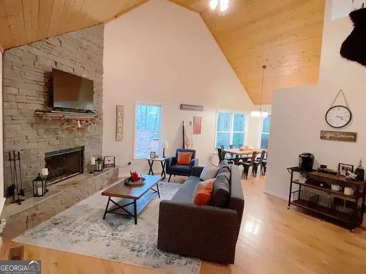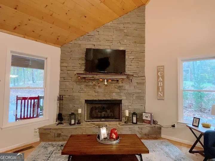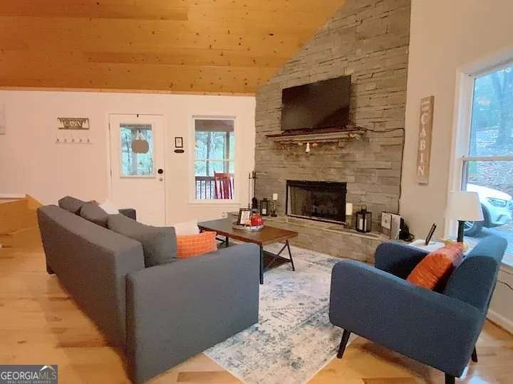 Rustic 4BR/3BA cabin on 1.04+/- acres in historic Dahlonega with seasonal mountain views and privacy. Welcoming front porch and spacious family room with stacked stone fireplace and tongue-and-groove vaulted ceilings. Charming kitchen with breakfast area and custom cabinets. Primary suite on main, 1 BR + loft upstairs, and 2 BR on terrace level. Finished basement includes 2 bedrooms, full bath and private exterior entrance-ideal for guests or rental use. Hardwood floors, tiled baths, and outbuilding for storage. Large screened-in porch for enjoying the wooded surroundings. Property has been used as a licensed short-term rental with rental history and income potential (financials available). Convenient to vineyards, hiking trails, Helen, and local event venues. Ideal primary residence, mountain getaway, or investment property. Not being sold furnished.