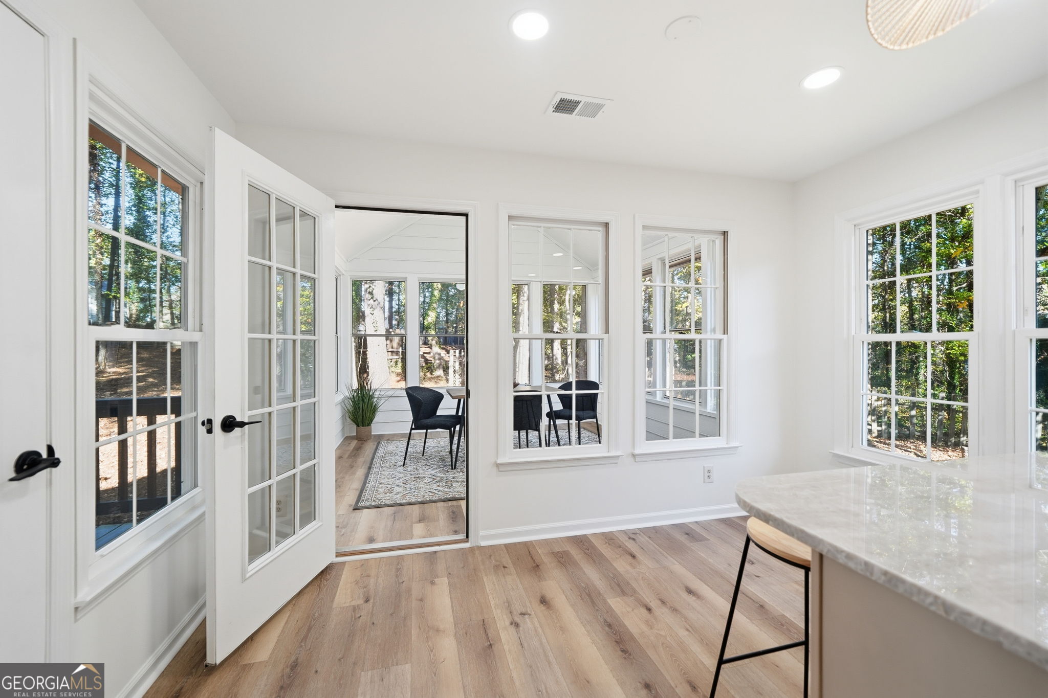 Don't miss this exceptional opportunity to own a beautifully renovated 4 bedroom, 3 bathroom home that uniquely blends timeless character with modern style - just minutes from the best that all of Downtown Alpharetta and Avalon have to offer. Enjoy quick and easy access to top rated restaurants, boutique shopping, the Alpha Loop trail, Brook Street Park, and so much more - all less than a mile away. Completely transformed with over $200K in renovations, this home offers the perfect mix of comfort, craftsmanship, and charm. As you enter the grand two-story foyer, you will notice the abundance of natural light and the new luxury vinyl flooring throughout that immediately set the tone. The spacious living room features an inviting gas fireplace, convertible to wood-burning, and flows effortlessly into a separate dining room, ideal for gatherings. The updated kitchen is a true showpiece, showcasing quartzite countertops, subway tile backsplash, two-tone cabinetry, stainless steel appliances, and an extended breakfast bar. Enjoy seamless indoor-outdoor living with the three season sunroom and a large deck, providing year round enjoyment of the lush, private surroundings. The primary suite is your personal sanctuary, featuring a spa-inspired ensuite with a double quartzite vanity, freestanding soaking tub, frameless glass shower, and designer finishes. Two additional bedrooms and a full bathroom complete the main level. The finished terrace level expands your possibilities - offering an open living area, a spacious bedroom, a full bath, and a versatile flex room perfect for a home office, gym, media space, or fifth bedroom. The expansive three car garage allows for space to create a gym and/or flex space, while providing plenty of space for storage. Outside, the backyard is a true retreat rarely found this close to downtown. With mature trees, multiple entertaining areas, a grassy knoll, built-in firepit, and plenty of room to customize, it's the perfect space to unwind or entertain. This home is the ultimate combination of charm, location, and modern upgrades - all in one perfect package and turn key ready.