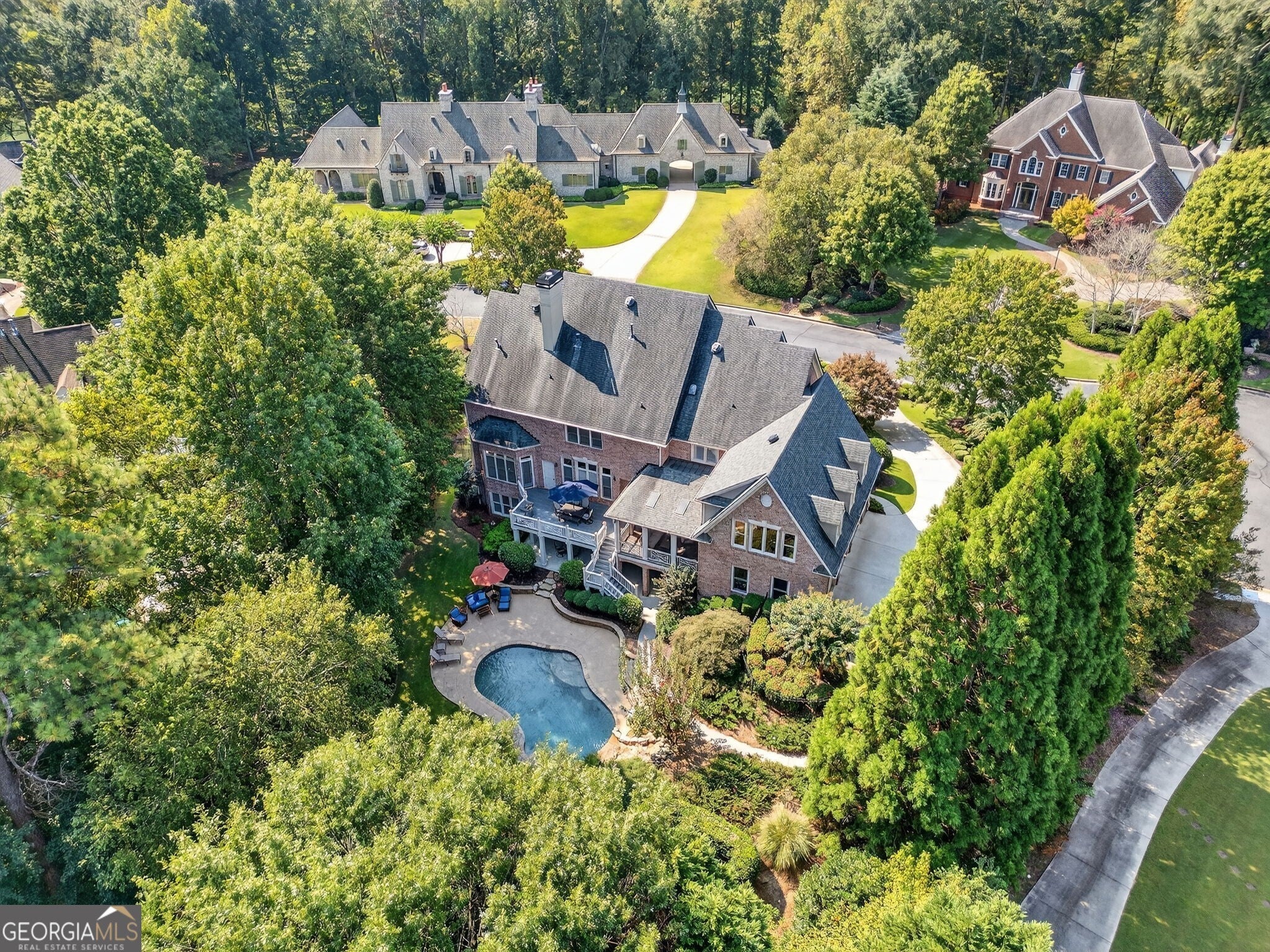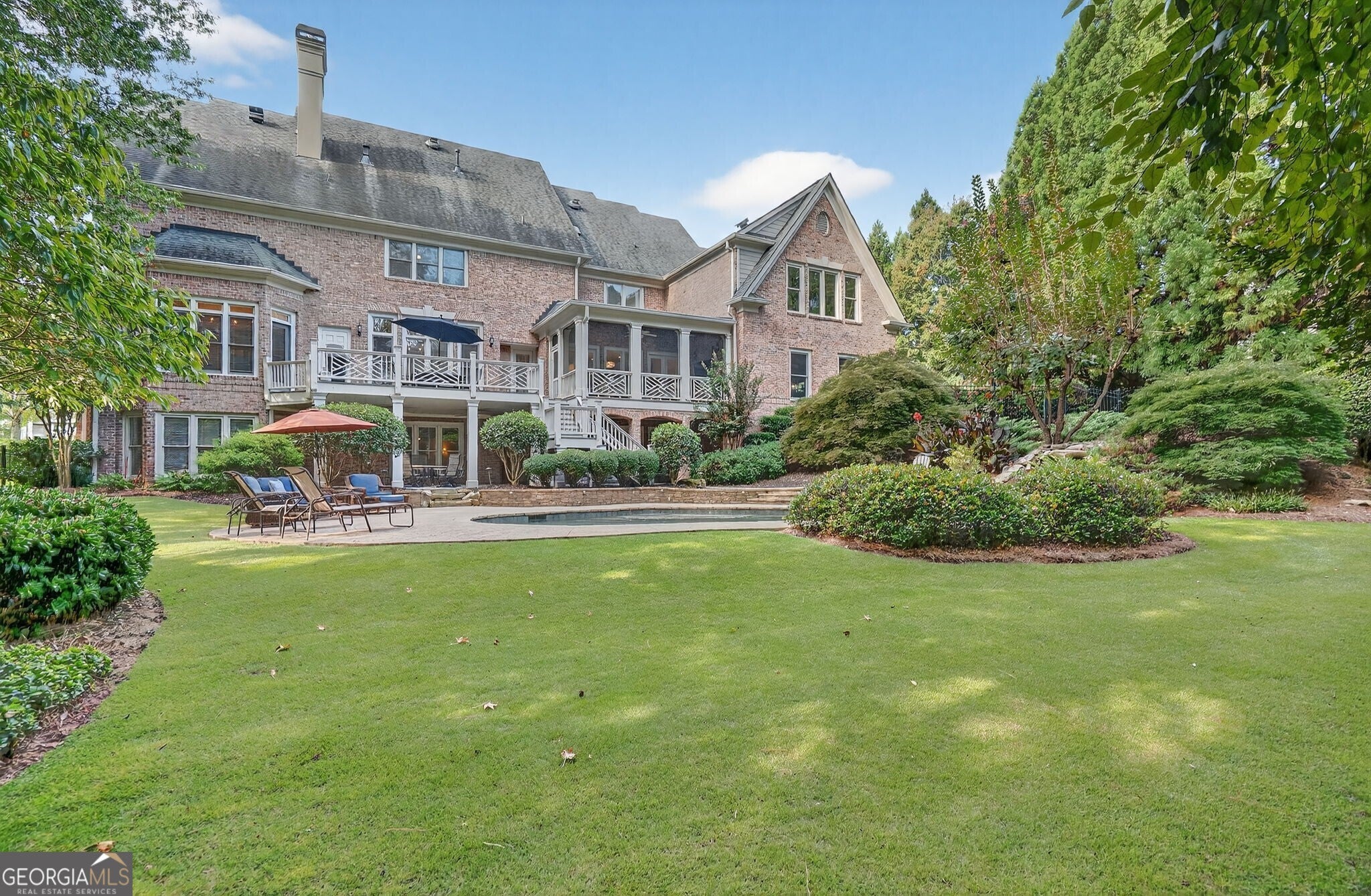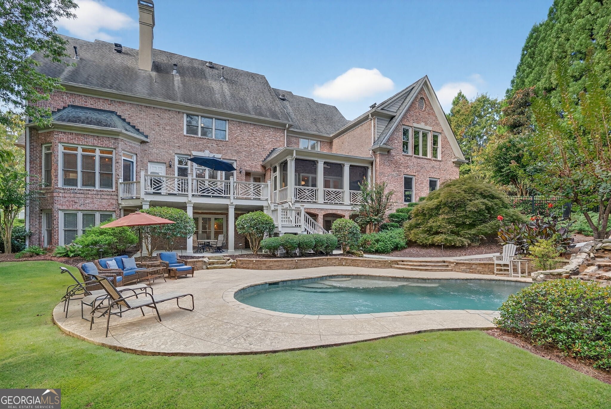 Experience resort-style living in this elegant estate on a private cul-de-sac in the highly sought-after community Winfield on the River, a one-of-a-kind gated neighborhood nestled on the serene banks of the Chattahoochee River. With its timeless brick architecture and natural landscaping, this home is a special retreat with luxurious amenities and exceptional indoor-outdoor living on +/- 0.70 acres. Step inside to a grand two-story foyer flanked by a formal dining room and a flexible office/library/den space-perfect for both elegant entertaining and everyday living. The expansive ceilings and wall of windows in the family room flood the space with natural light, while the open-concept layout flows seamlessly into the gourmet kitchen, complete with high-end appliances, abundant cabinetry, and an entertainer's island. Just off the kitchen, a spacious screened porch and deck overlook your private and spacious backyard oasis. Outside, your own backyard paradise awaits, featuring a stunning saltwater pool with a waterfall, framed by lush, manicured landscaping for maximum privacy and relaxation. The main level owner's suite is a peaceful retreat with a spa-like ensuite and serene views. Upstairs are three spacious bedrooms, three bathrooms, and a versatile bonus room-ideal for a playroom, teen suite, or additional living space. A large unfinished space with a private entry also has the potential to be an additional private suite for guests or multigenerational living. The daylight terrace level is a versatile space for everyday entertainment or hosting guests, offering a full pool bath, tiled playroom with closet, expansive rec room, gym, private office or 5th bedroom with full bath, fireside family room with wet bar, workshop, and extensive storage. Off the terrace level is an additional large covered patio space. Bordering a beautiful river across from a national park with recreation space and hiking trails, the neighborhood feels private and secluded, yet boasts proximity to premier shopping and dining at The Forum and top-rated public and private schools, including Johns Creek High School, Autrey Mill Middle School, Medlock Bridge Elementary School, Perimeter Christian School, and the Wesleyan School. The Atlanta Athletic Club is just minutes away. This home truly combines classic elegance with modern luxury in one of Johns Creek's most desirable gated communities.