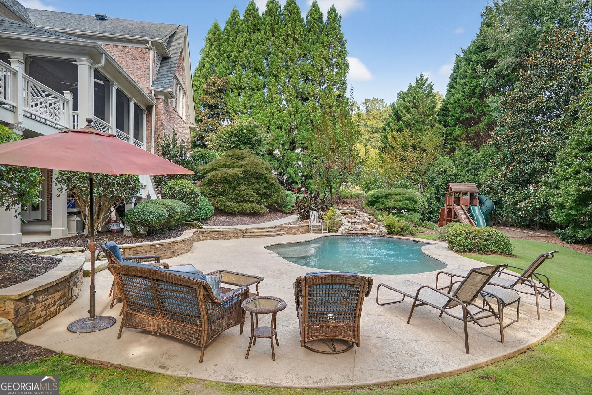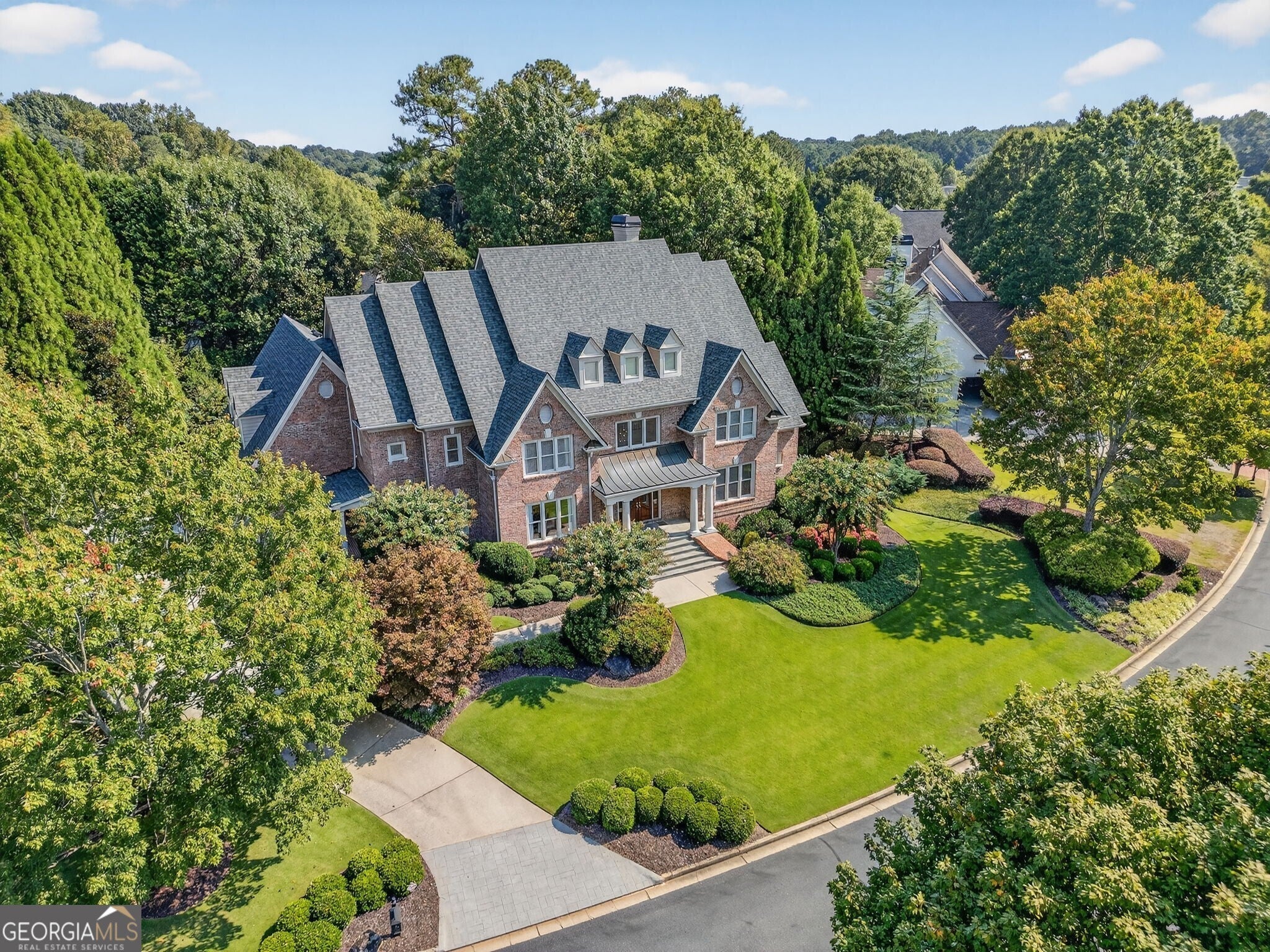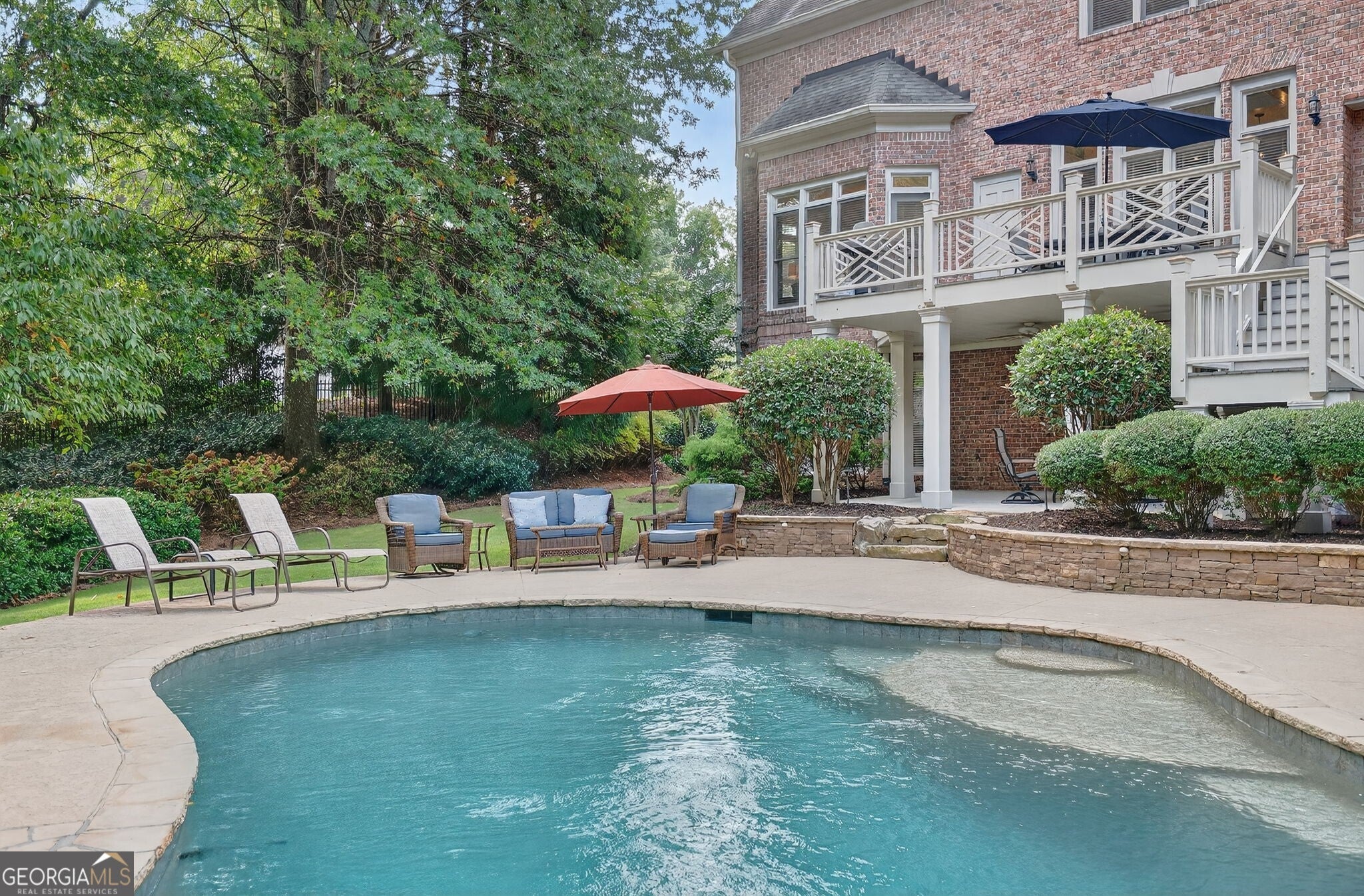 Experience resort-style living in this elegant estate on a private cul-de-sac in the highly sought-after community Winfield on the River, a one-of-a-kind gated neighborhood nestled on the serene banks of the Chattahoochee River. With its timeless brick architecture and natural landscaping, this home is a special retreat with luxurious amenities and exceptional indoor-outdoor living on +/- 0.70 acres. Step inside to a grand two-story foyer flanked by a formal dining room and a flexible office/library/den space-perfect for both elegant entertaining and everyday living. The expansive ceilings and wall of windows in the family room flood the space with natural light, while the open-concept layout flows seamlessly into the gourmet kitchen, complete with high-end appliances, abundant cabinetry, and an entertainer's island. Just off the kitchen, a spacious screened porch and deck overlook your private and spacious backyard oasis. Outside, your own backyard paradise awaits, featuring a stunning saltwater pool with a waterfall, framed by lush, manicured landscaping for maximum privacy and relaxation. The main level owner's suite is a peaceful retreat with a spa-like ensuite and serene views. Upstairs are three spacious bedrooms, three bathrooms, and a versatile bonus room-ideal for a playroom, teen suite, or additional living space. A large unfinished space with a private entry also has the potential to be an additional private suite for guests or multigenerational living. The daylight terrace level is a versatile space for everyday entertainment or hosting guests, offering a full pool bath, tiled playroom with closet, expansive rec room, gym, private office or 5th bedroom with full bath, fireside family room with wet bar, workshop, and extensive storage. Off the terrace level is an additional large covered patio space. Bordering a beautiful river across from a national park with recreation space and hiking trails, the neighborhood feels private and secluded, yet boasts proximity to premier shopping and dining at The Forum and top-rated public and private schools, including Johns Creek High School, Autrey Mill Middle School, Medlock Bridge Elementary School, Perimeter Christian School, and the Wesleyan School. The Atlanta Athletic Club is just minutes away. This home truly combines classic elegance with modern luxury in one of Johns Creek's most desirable gated communities.