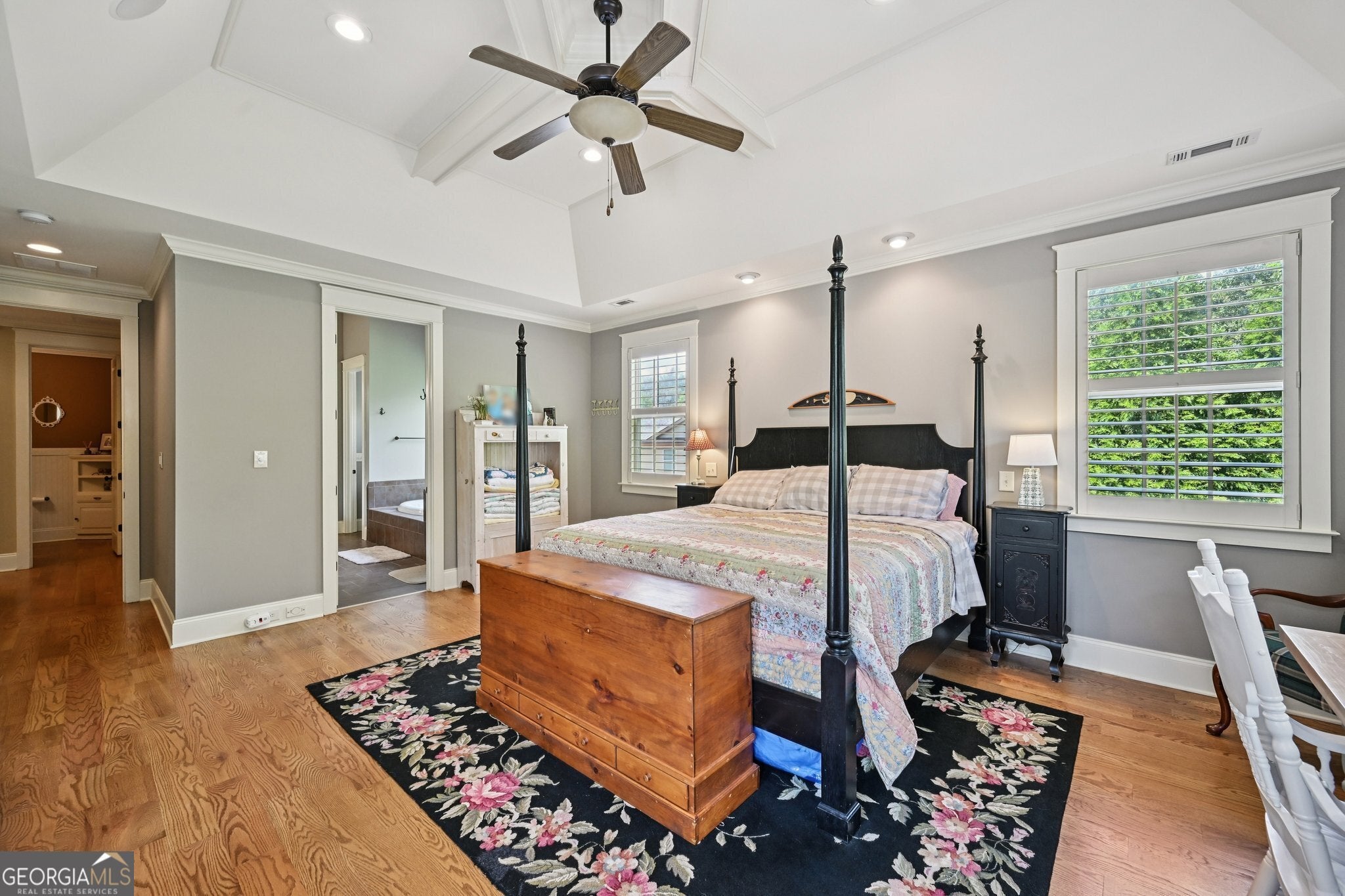 - Interior FeaturesCentral Vacuum, Attic Expandable, Bookcases, Tray Ceiling(s), Vaulted Ceiling(s), High Ceilings, Double Vanity, Beamed Ceilings, Pulldown Attic Stairs, Separate Shower, Tile Bath, Walk-In Closet(s), Whirlpool Bath, In-Law Floorplan, Master On Main Level
