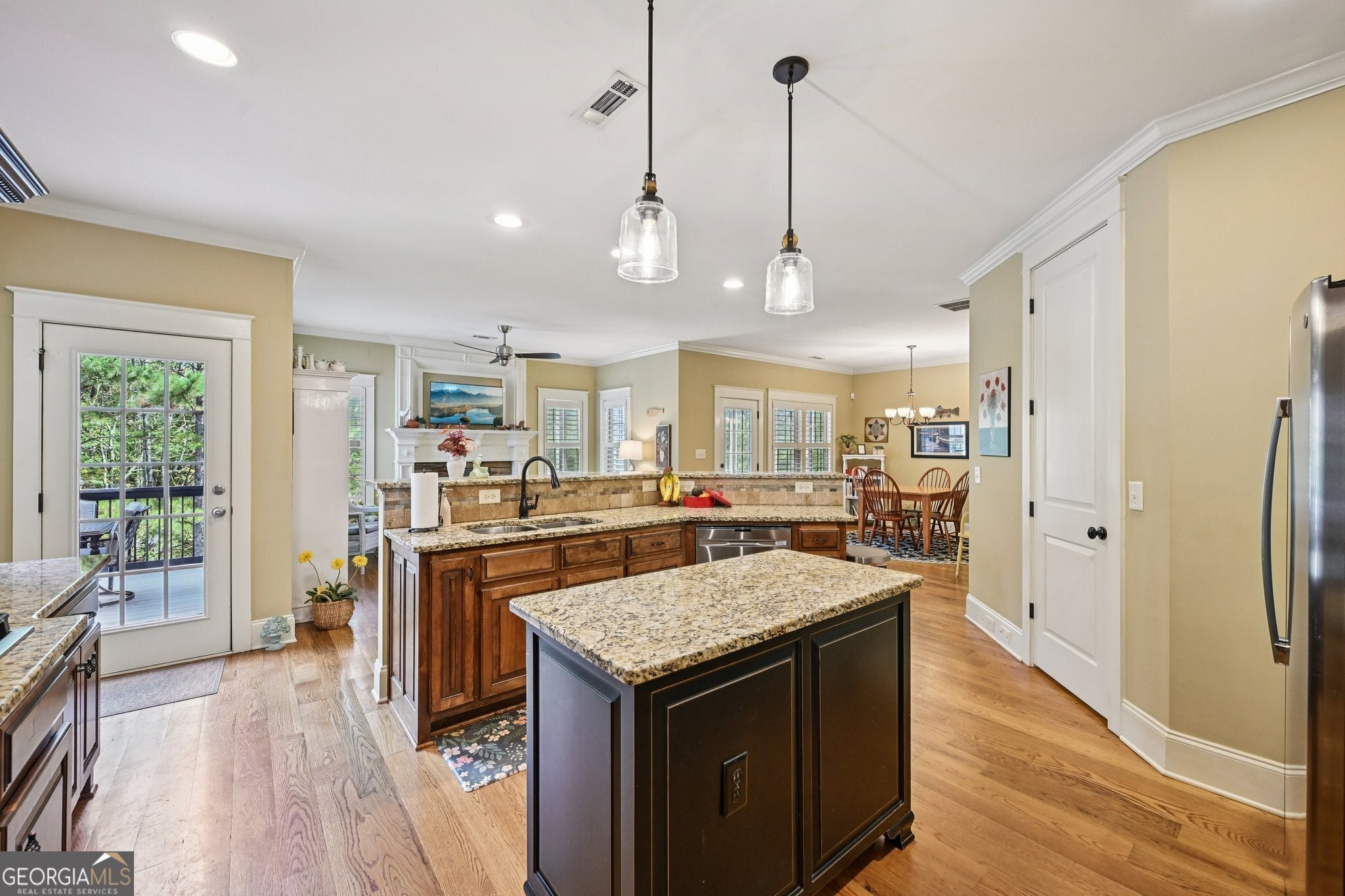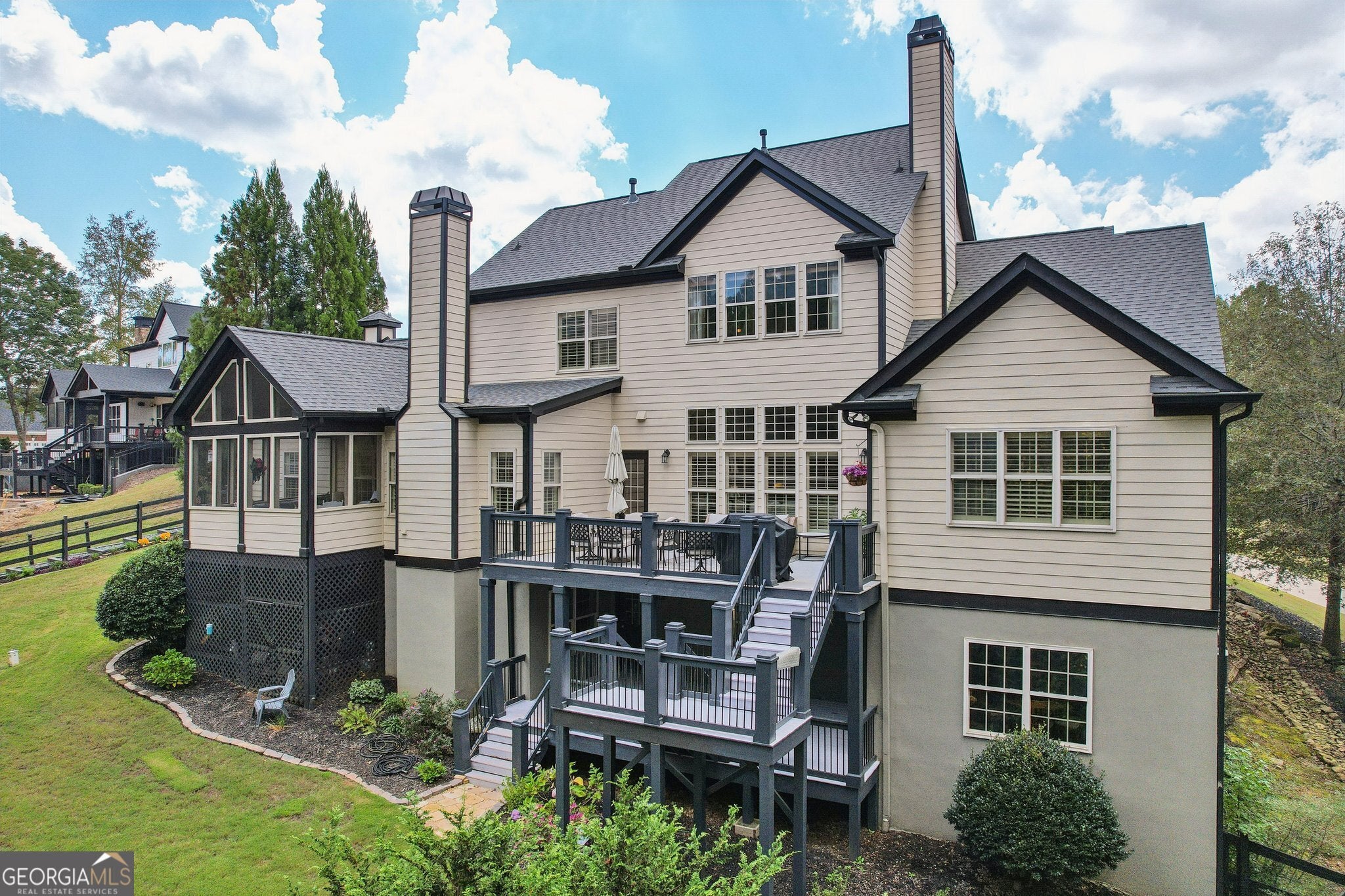 This home truly has room for everyone in this 6-bedroom, 4.5-bathroom home that perfectly blends elegance, functionality, and comfort. Featuring multiple levels of living space, this property offers everything you need for luxurious everyday living and entertaining - from a main-level primary suite to a fully finished basement with its own kitchen. With the primary bedroom on the Main Floor, enjoy convenience and privacy in the spacious owner's suite, complete with an ensuite bath and ample closet space. The main living area flows seamlessly onto the deck with lake views, perfect for indoor-outdoor living. Walk into the well-appointed kitchen with modern appliances, plenty of counter space, and storage for the home chef. The kitchen flows into a breakfast nook and keeping room with an additional fireplace. Off of the breakfast nook there is a screened in sunroom with lake views! Don't forget the charming front porch featuring ceiling fans and a swing, one of the largest in the neighborhood, ideal for warm summer evenings. Three spacious bedrooms and two full bathrooms offer comfort and flexibility for family or guests. A versatile loft area perfect for a playroom, office, home gym, or reading nook. The finished basement includes 2 bedrooms, 1 full bathroom, and a full kitchen. Ideal for in-laws, guests, or a private rental suite. Walk out directly to the lower deck, providing additional outdoor living and entertainment space. Newly installed fence and beautiful landscaping in the front and back will not disappoint!