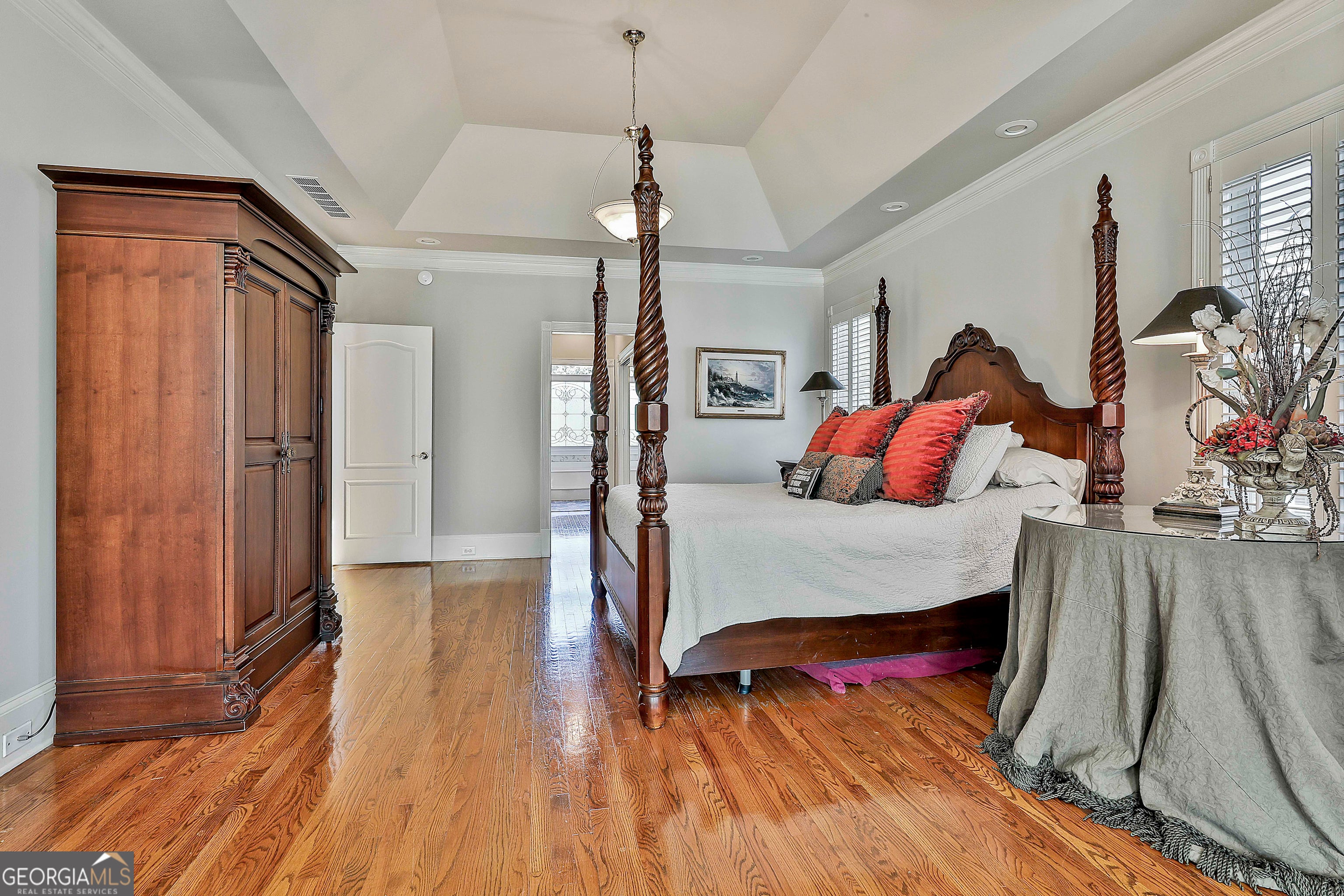 - Interior FeaturesBookcases, Central Vacuum, Double Vanity, High Ceilings, Master On Main Level, Separate Shower, Soaking Tub, Tile Bath, Tray Ceiling(s), Two Story Foyer, Vaulted Ceiling(s), Walk-In Closet(s)