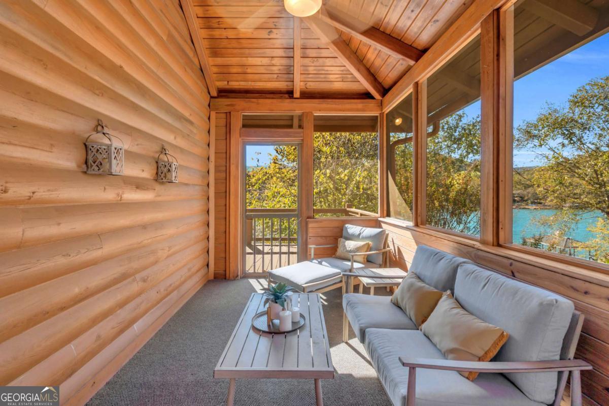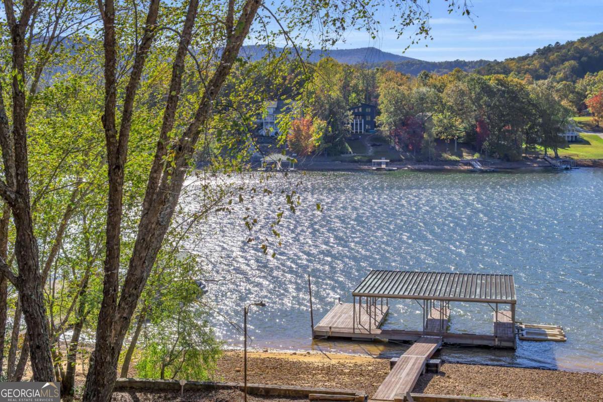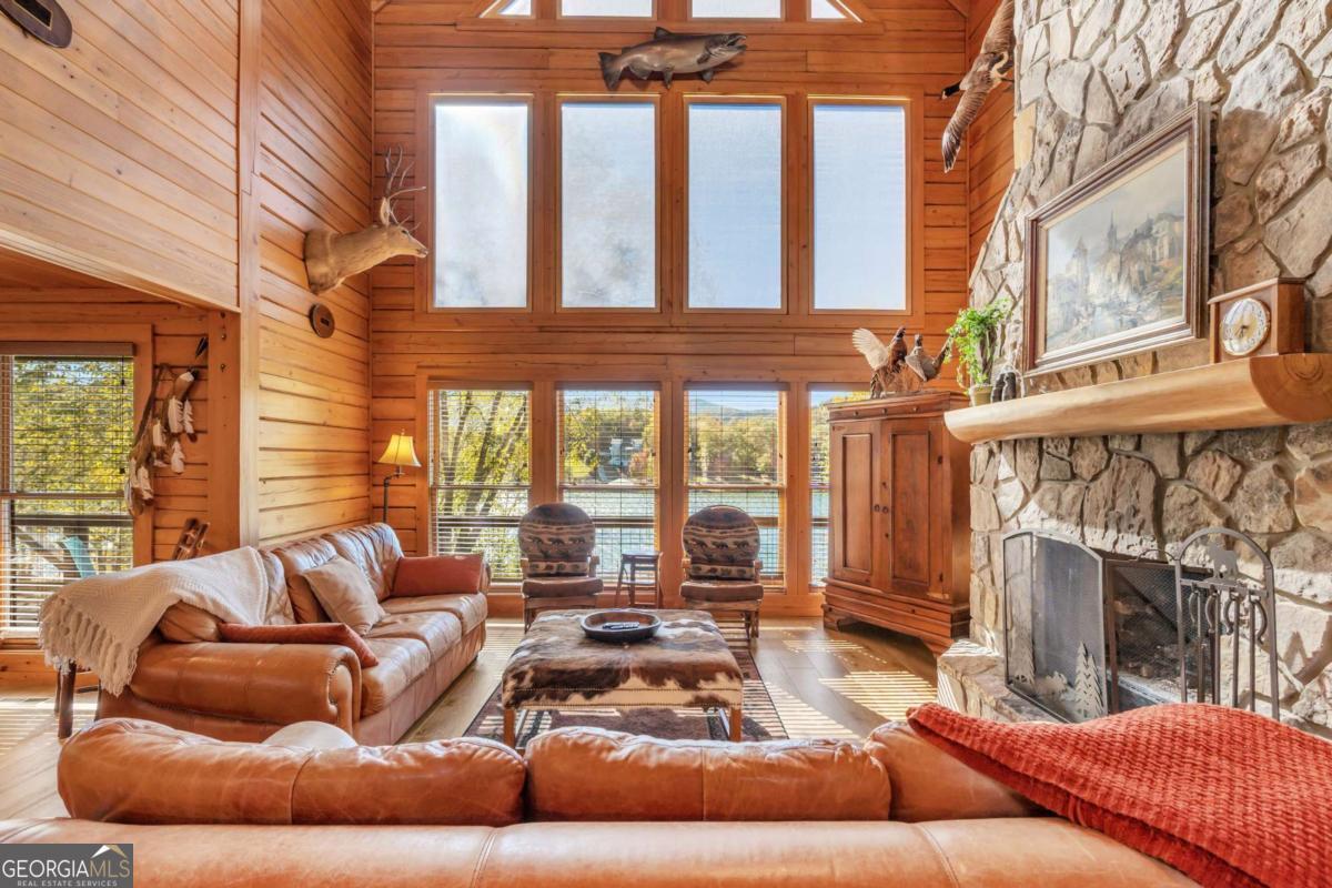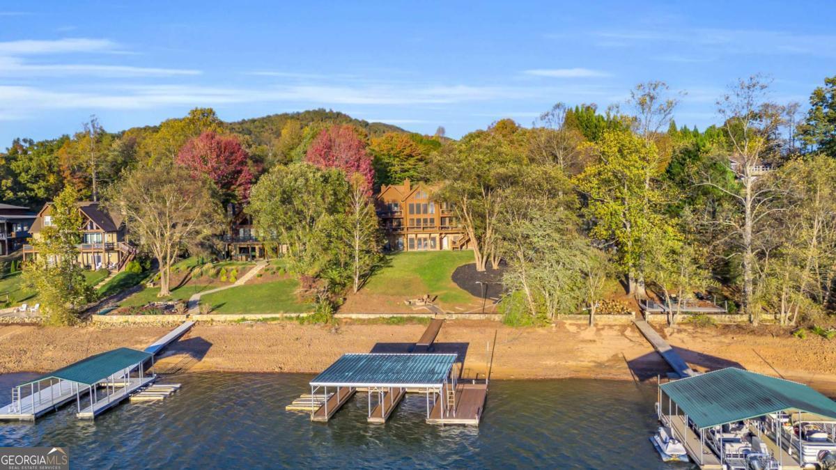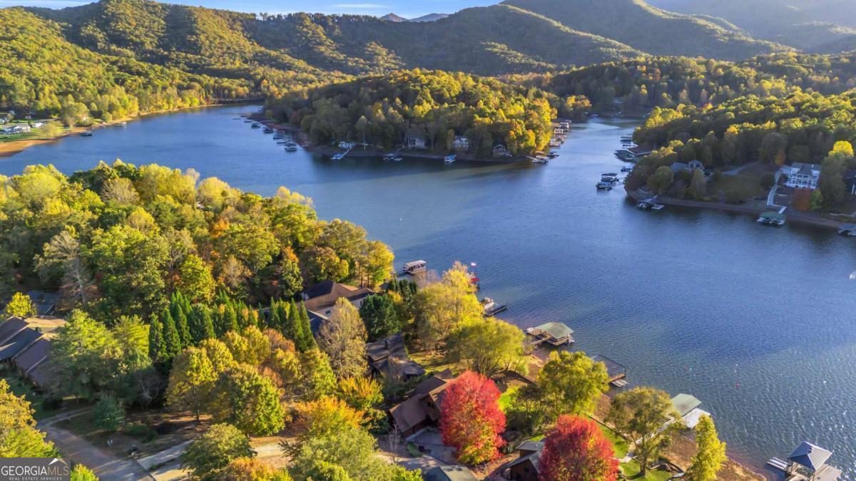 As you arrive, the mountains and lake unfold before you, hinting at the beauty that greets you at every turn. Stepping through the large entrance foyer, sunlight filters across tongue-and-groove walls and beamed ceilings, giving a sense of warmth, space, and care. Your eyes are drawn to the great room, where a stone fireplace anchors the space, and walls of windows frame a view that could never be captured in a photograph-Brasstown Bald rising in the distance, long-range peaks stretching, and the lake glimmering. To your left, the dining area opens onto one side of the screened porch. A ping pong table waits for afternoons of laughter, games, and friendly competition, blending fun with the serenity that surrounds the home. On the other side, the owner's suite steps onto its own screened porch, a private perch for morning coffee or quiet reflection as sunlight dances across the water. Inside, the suite offers a fireplace and small kitchenette, creating a self-contained space that feels like a personal retreat. Descending to the basement, you find a modern living area and kitchen, along with three sleeping rooms, offering flexibility for guests or family, keeping the home's focus-the connection to the lake, the mountains, and life outdoors. Outside, the land slopes gently toward the lake, where a two-slip dock with a large sun deck awaits, perfect for boating, lounging, or sunsets. Evenings might be spent around the fire pit under a starry sky or enjoying a spontaneous swim. Every step outside brings a new perspective, whether a long-range mountain vista or the sparkling lake reflecting light. Throughout the home, every detail encourages you to pause: the crackle of a fireplace, the soft mountain breeze through porch screens, laughter from a game of ping pong, and quiet moments when it's just you and the view. This is a home designed to be lived in, experienced, and cherished, where everyday life feels extraordinary-the mountains and lake are always at your doorstep.
