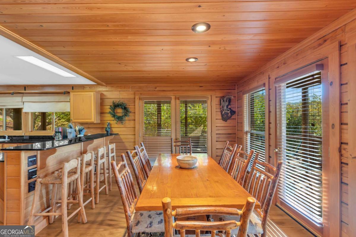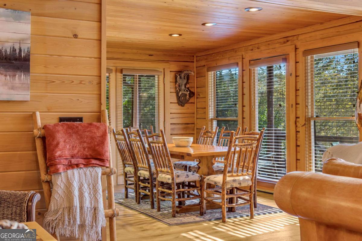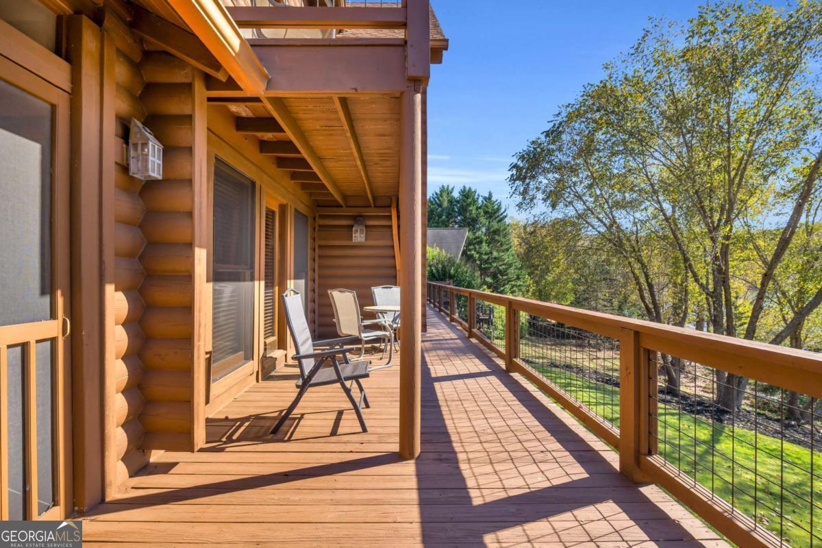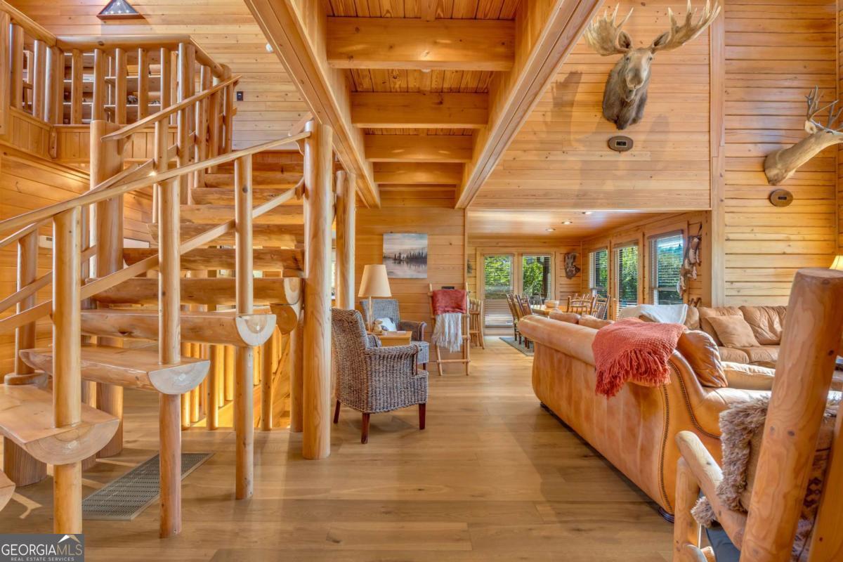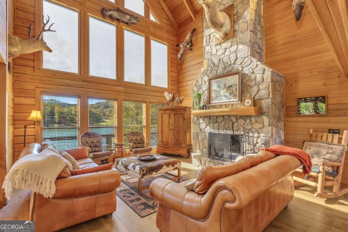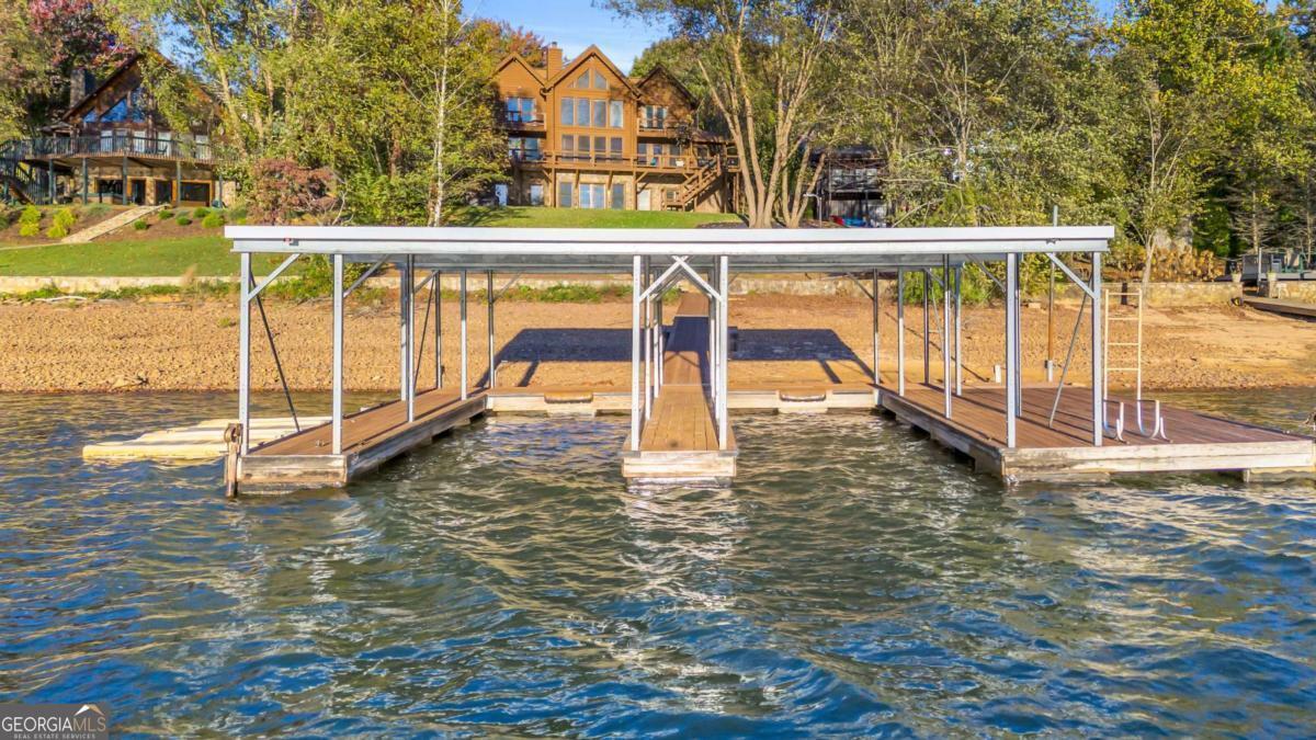 As you arrive, the mountains and lake unfold before you, hinting at the beauty that greets you at every turn. Stepping through the large entrance foyer, sunlight filters across tongue-and-groove walls and beamed ceilings, giving a sense of warmth, space, and care. Your eyes are drawn to the great room, where a stone fireplace anchors the space, and walls of windows frame a view that could never be captured in a photograph-Brasstown Bald rising in the distance, long-range peaks stretching, and the lake glimmering. To your left, the dining area opens onto one side of the screened porch. A ping pong table waits for afternoons of laughter, games, and friendly competition, blending fun with the serenity that surrounds the home. On the other side, the owner's suite steps onto its own screened porch, a private perch for morning coffee or quiet reflection as sunlight dances across the water. Inside, the suite offers a fireplace and small kitchenette, creating a self-contained space that feels like a personal retreat. Descending to the basement, you find a modern living area and kitchen, along with three sleeping rooms, offering flexibility for guests or family, keeping the home's focus-the connection to the lake, the mountains, and life outdoors. Outside, the land slopes gently toward the lake, where a two-slip dock with a large sun deck awaits, perfect for boating, lounging, or sunsets. Evenings might be spent around the fire pit under a starry sky or enjoying a spontaneous swim. Every step outside brings a new perspective, whether a long-range mountain vista or the sparkling lake reflecting light. Throughout the home, every detail encourages you to pause: the crackle of a fireplace, the soft mountain breeze through porch screens, laughter from a game of ping pong, and quiet moments when it's just you and the view. This is a home designed to be lived in, experienced, and cherished, where everyday life feels extraordinary-the mountains and lake are always at your doorstep.