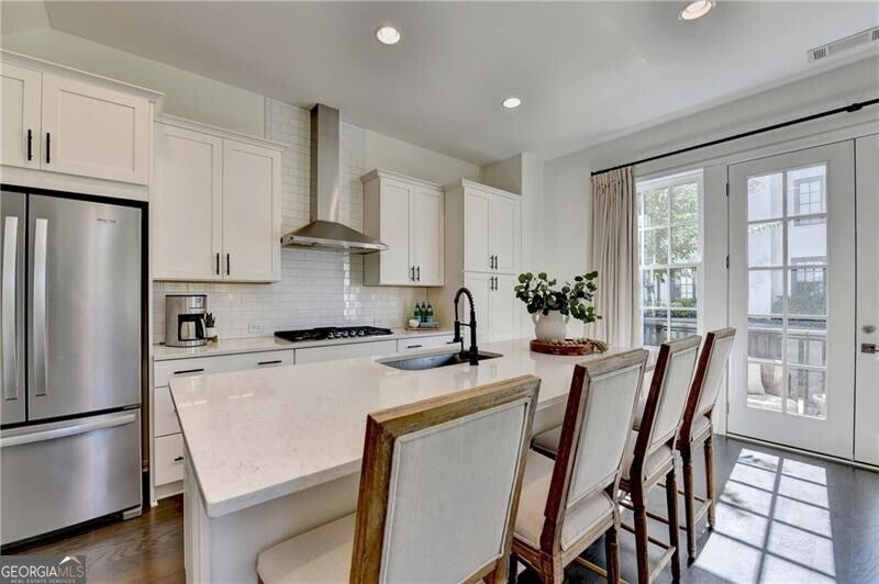 This beautiful condominium in Aria South features abundant natural light, 10-foot ceilings, and a spacious open-concept main living area. Upon entry, you're welcomed by an inviting family room with engineered wood flooring that extends throughout the entire home. The kitchen is an entertainer's dream, showcasing a large island with quartz countertops, white cabinetry, stainless steel appliances, a gas cooktop, and a walk-in pantry. The main level also includes a convenient half bath, a coat closet, and access to a private deck through double doors overlooking a lush green common area. Upstairs, you'll find a roomy laundry closet complete with a washer, dryer, and extra storage. The owner's suite is generously sized and filled with natural light, featuring a custom walk-in closet with ample shelving and storage. The ensuite bathroom includes double vanities with quartz countertops, a large tiled shower, and a private water closet. Additional highlights include a one-car garage with storage space and two extra parking passes. Residents of Aria South enjoy beautifully maintained green spaces and a prime location near GA-400, I-285, top-rated restaurants, shopping, and local parks.