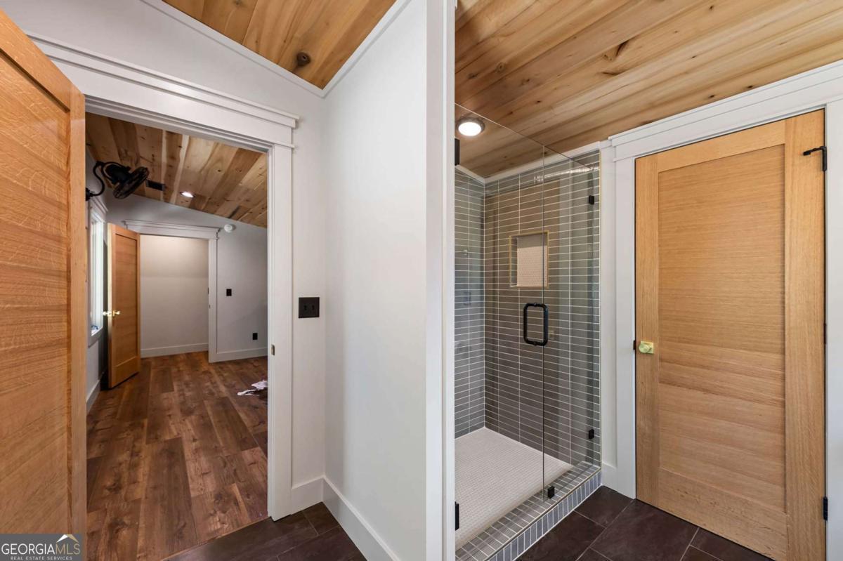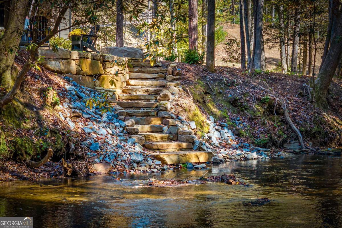 The Onyx Lodge at Fightingtown sets the tone for North Georgia's newest luxury creekfront community-bold architecture, exceptional craftsmanship, and an irreplaceable setting. Positioned on 3.4 private acres with 420+ feet of premier Fightingtown Creek frontage, this modern lodge offers 5,400 sqft of refined mountain living with 4 bedrooms + a 12-person bunk suite, 5 full bathrooms, and a half bath. Walls of glass capture the surrounding beauty-from the rushing creek below to the wooded backdrop. High-end finishes are showcased throughout: dramatic porcelain tile bathrooms, a freestanding stainless soaking tub in the primary suite, secret doors, custom closets, warm wood details, and sophisticated lighting and moody paint selections that elevate each room's atmosphere. Designed for effortless hosting and unforgettable retreats, the home features four fireplaces, two full kitchens, an outdoor kitchen, and a game room/lounge. The lounge evokes a private club feel with a pool table, bar, multiple TVs and opens up directly to a fire-pit, hot tub, stone steps leading you to the water's edge, and golf simulator in the garage. Expansive Trex decking and covered outdoor spaces maximize year-round enjoyment of the creek's sound and scenery. Luxury. Privacy. Creekfront living at its finest. The first-and a true flagship-of this exclusive new development.