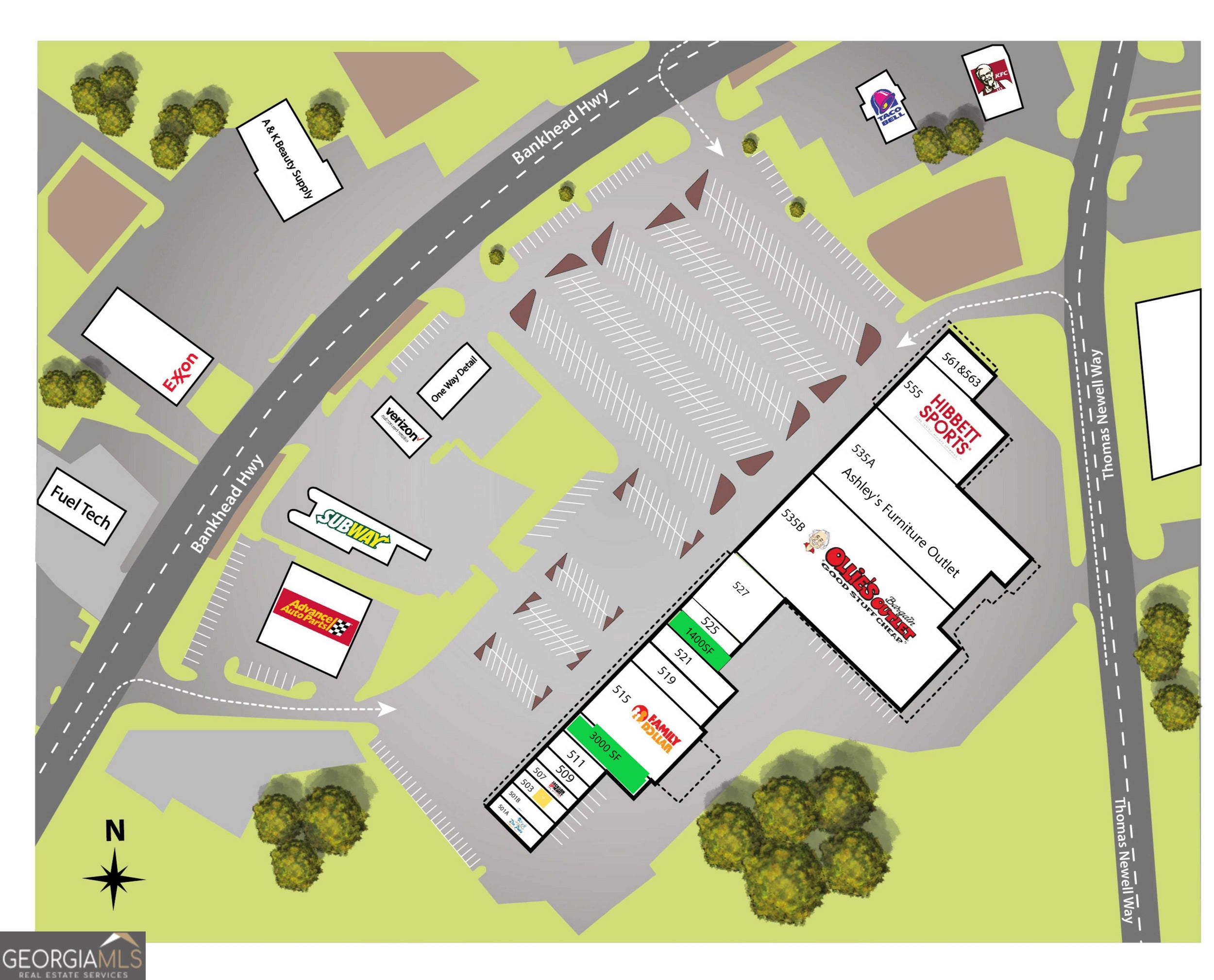 The unit offers open floor plan, storage room, and restroom. Anchors: * Ollie's Bargain Outlet * NEW Ashley Furniture Outlet * Family Dollar Outparcels / Pad Sites: Taco Bell / KFC Subway Advanced Auto Parts Strategic Location: On the primary east-west access route to Carrollton from I-20 and Atlanta, with excellent visibility and signage along Bankhead Highway Traffic / Exposure: 36,000 vehicles per day Customer Draw: Over 150,000 annual visitors Demographics: ~$82,000 average household income, ~6.9% population growth Accessibility: Multiple access points, including a signalized intersection Center Size: 158,795 SF retail center, Parking: 400 spaces