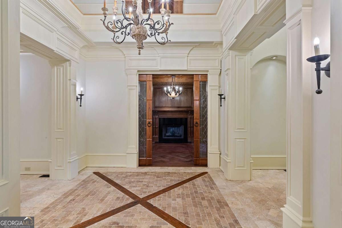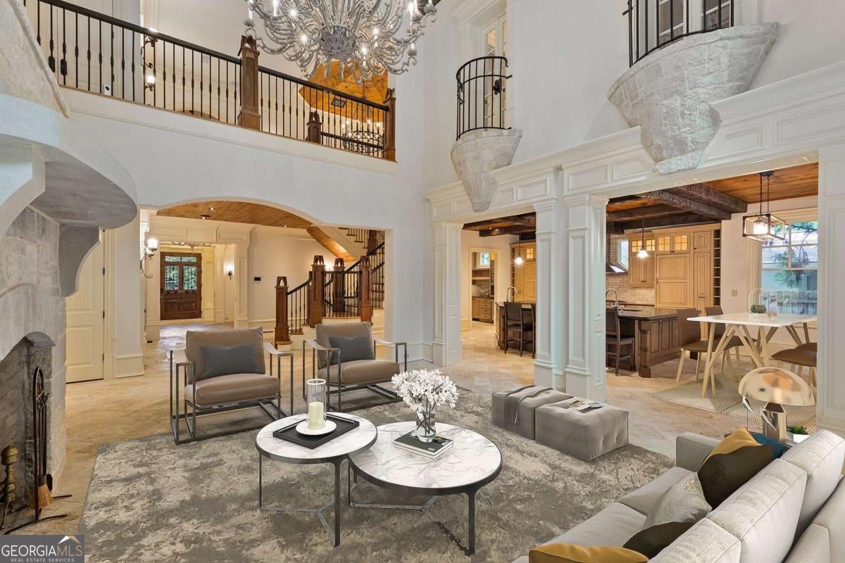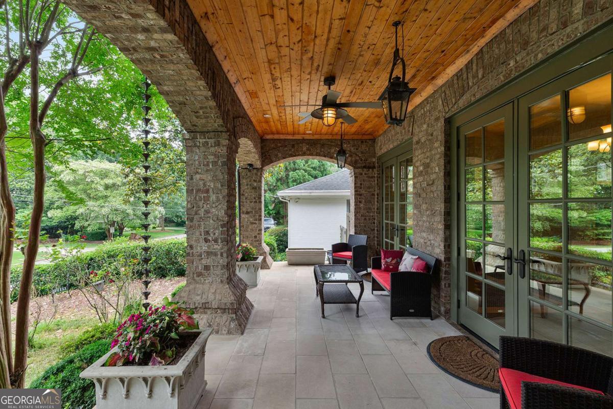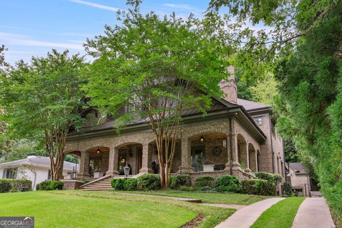 Tucked away in the heart of Atlanta's Sherwood Forest neighborhood, this custom-built estate is a masterclass in architectural detail and refined living. Thoughtfully designed with layered materials and timeless finishes, the home blends old-world craftsmanship with modern innovation. A wide, deep covered front porch with tongue-and-groove ceiling, gas lights, and ceiling fans spans the front of the home-creating a gracious welcome and an ideal space for year-round enjoyment. Inside, generous open rooms flow seamlessly, designed for both relaxed living and entertaining. Both the formal dining room and the fireside office/library open directly onto the covered front porch through sets of French doors, enhancing the home's indoor-outdoor connection and providing an exceptional entertaining flow. Custom leaded-glass doors close off the library for quieter moments by the cozy fireplace. A dramatic two-story foyer with an imported Italian tiled ceiling and Turkish terracotta flooring sets the tone for the home's timeless details. Seven fireplaces-each capped with custom stone and brickwork that mirrors the banister finials-anchor the home with warmth and artistry. Beamed ceilings, hardwood floors, and finely crafted millwork add depth throughout. The main kitchen is outfitted for serious culinary work, featuring dual refrigerators, dual dishwashers, a butler's pantry, three sinks, and bespoke cabinetry. A second full kitchen on the terrace level adds versatility for hosting or multi-generational living. The main level also features a secondary primary bedroom suite-ideal for guests or those seeking one-level living. On the lower level, a 1,000+ bottle wine cellar with tasting room, a fireside entertaining lounge featuring a generous fireplace and a stunning original bar-meticulously reassembled on-site after being imported from Europe-anchor the space. This level also includes a dedicated wellness suite complete with sauna, workout area, separate shower, and its own laundry, along with an additional office and flexible space for media or games. The fully updated Control4 system provides intercom, security, and whole-home sound through an integrated speaker system. An elevator serves all levels. Outdoors, a brick loggia with a built-in pizza oven and gas grill overlooks the private, gated backyard and pool-creating an ideal setting for both entertaining and unwinding in total privacy. A whole-house generator provides comfort and peace of mind throughout the seasons.