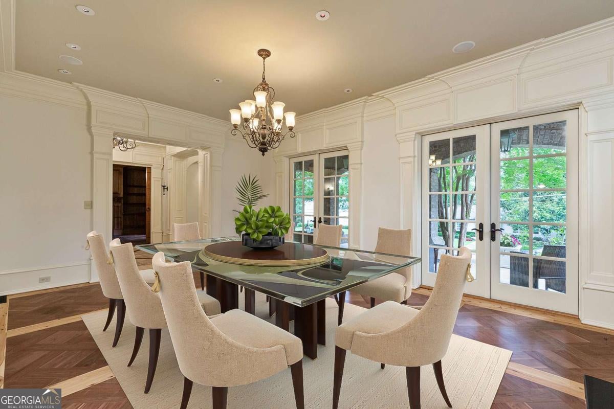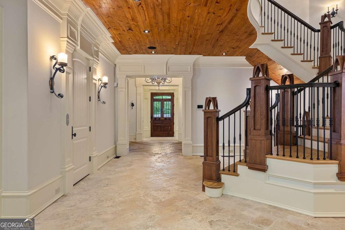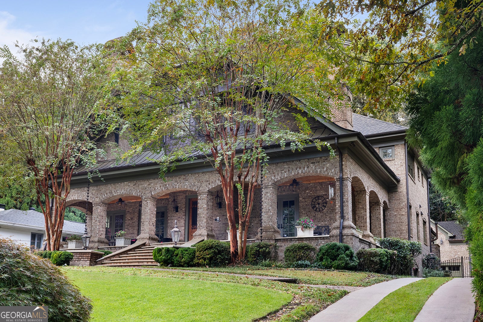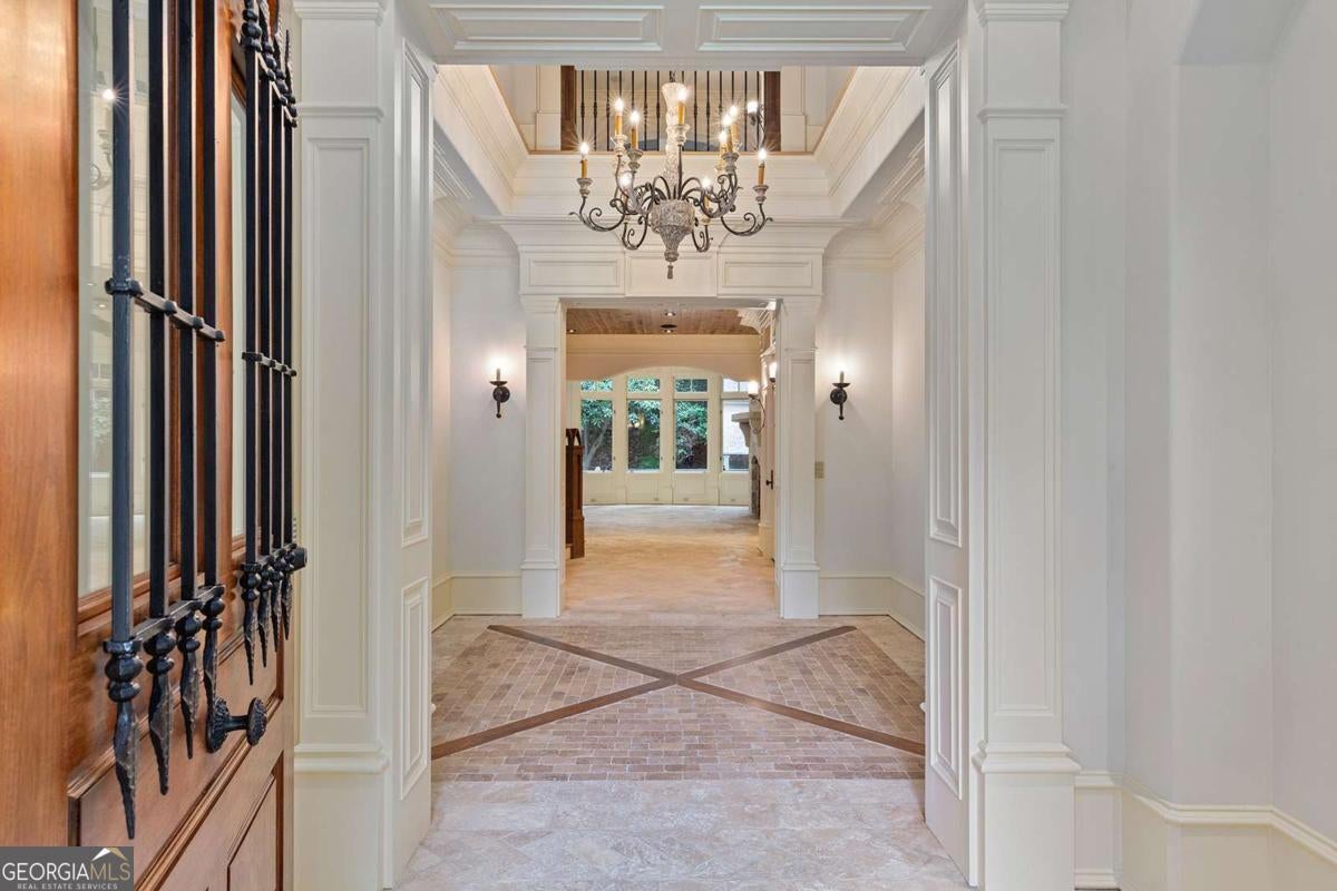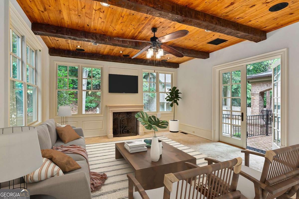 Tucked away in the heart of Atlanta's Sherwood Forest neighborhood, this custom-built estate is a masterclass in architectural detail and refined living. Thoughtfully designed with layered materials and timeless finishes, the home blends old-world craftsmanship with modern innovation. A wide, deep covered front porch with tongue-and-groove ceiling, gas lights, and ceiling fans spans the front of the home-creating a gracious welcome and an ideal space for year-round enjoyment. Inside, generous open rooms flow seamlessly, designed for both relaxed living and entertaining. Both the formal dining room and the fireside office/library open directly onto the covered front porch through sets of French doors, enhancing the home's indoor-outdoor connection and providing an exceptional entertaining flow. Custom leaded-glass doors close off the library for quieter moments by the cozy fireplace. A dramatic two-story foyer with an imported Italian tiled ceiling and Turkish terracotta flooring sets the tone for the home's timeless details. Seven fireplaces-each capped with custom stone and brickwork that mirrors the banister finials-anchor the home with warmth and artistry. Beamed ceilings, hardwood floors, and finely crafted millwork add depth throughout. The main kitchen is outfitted for serious culinary work, featuring dual refrigerators, dual dishwashers, a butler's pantry, three sinks, and bespoke cabinetry. A second full kitchen on the terrace level adds versatility for hosting or multi-generational living. The main level also features a secondary primary bedroom suite-ideal for guests or those seeking one-level living. On the lower level, a 1,000+ bottle wine cellar with tasting room, a fireside entertaining lounge featuring a generous fireplace and a stunning original bar-meticulously reassembled on-site after being imported from Europe-anchor the space. This level also includes a dedicated wellness suite complete with sauna, workout area, separate shower, and its own laundry, along with an additional office and flexible space for media or games. The fully updated Control4 system provides intercom, security, and whole-home sound through an integrated speaker system. An elevator serves all levels. Outdoors, a brick loggia with a built-in pizza oven and gas grill overlooks the private, gated backyard and pool-creating an ideal setting for both entertaining and unwinding in total privacy. A whole-house generator provides comfort and peace of mind throughout the seasons.