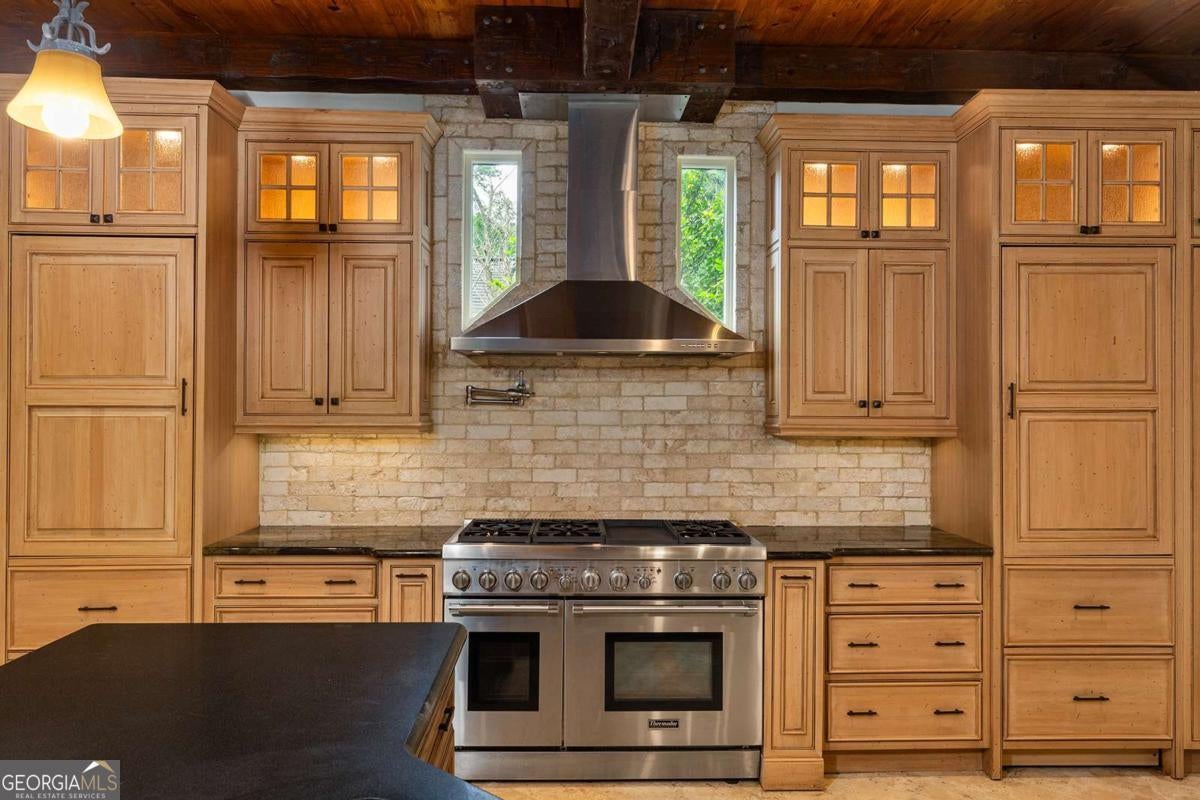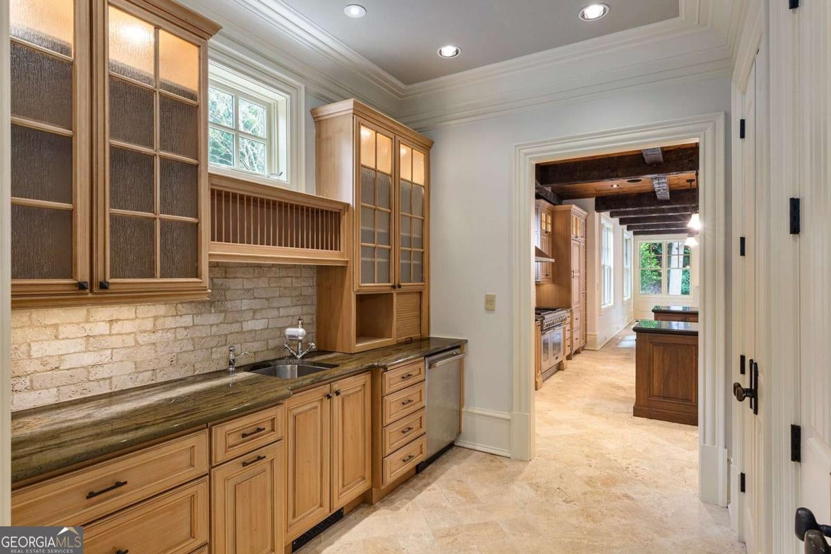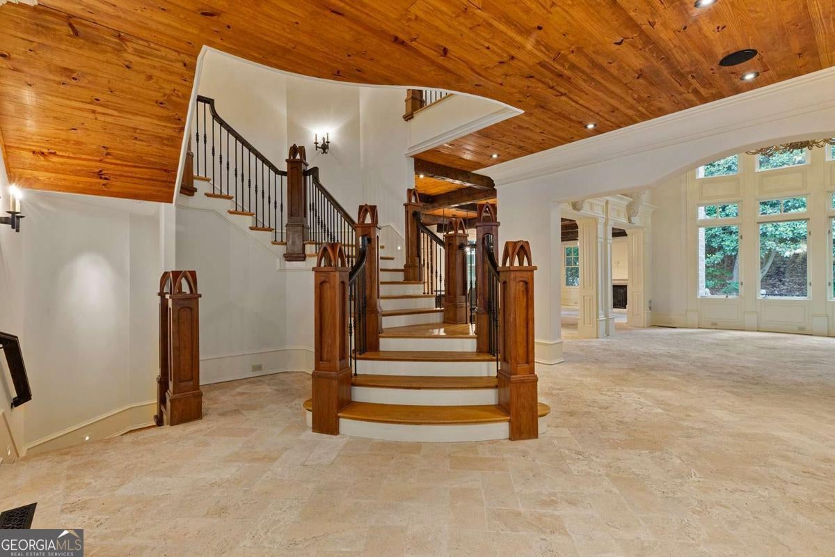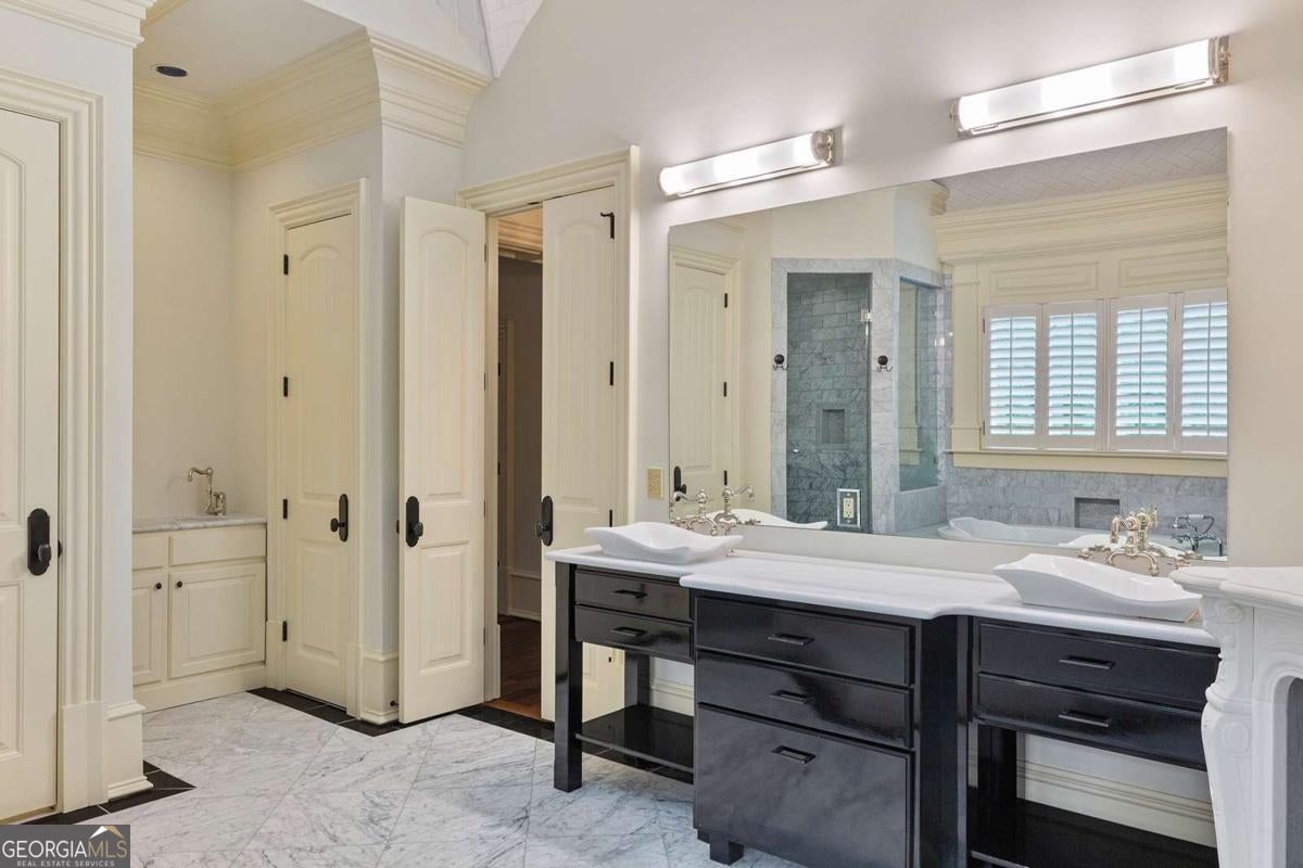 Tucked away in the heart of Atlanta's Sherwood Forest neighborhood, this custom-built estate is a masterclass in architectural detail and refined living. Thoughtfully designed with layered materials and timeless finishes, the home blends old-world craftsmanship with modern innovation. A wide, deep covered front porch with tongue-and-groove ceiling, gas lights, and ceiling fans spans the front of the home-creating a gracious welcome and an ideal space for year-round enjoyment. Inside, generous open rooms flow seamlessly, designed for both relaxed living and entertaining. Both the formal dining room and the fireside office/library open directly onto the covered front porch through sets of French doors, enhancing the home's indoor-outdoor connection and providing an exceptional entertaining flow. Custom leaded-glass doors close off the library for quieter moments by the cozy fireplace. A dramatic two-story foyer with an imported Italian tiled ceiling and Turkish terracotta flooring sets the tone for the home's timeless details. Seven fireplaces-each capped with custom stone and brickwork that mirrors the banister finials-anchor the home with warmth and artistry. Beamed ceilings, hardwood floors, and finely crafted millwork add depth throughout. The main kitchen is outfitted for serious culinary work, featuring dual refrigerators, dual dishwashers, a butler's pantry, three sinks, and bespoke cabinetry. A second full kitchen on the terrace level adds versatility for hosting or multi-generational living. The main level also features a secondary primary bedroom suite-ideal for guests or those seeking one-level living. On the lower level, a 1,000+ bottle wine cellar with tasting room, a fireside entertaining lounge featuring a generous fireplace and a stunning original bar-meticulously reassembled on-site after being imported from Europe-anchor the space. This level also includes a dedicated wellness suite complete with sauna, workout area, separate shower, and its own laundry, along with an additional office and flexible space for media or games. The fully updated Control4 system provides intercom, security, and whole-home sound through an integrated speaker system. An elevator serves all levels. Outdoors, a brick loggia with a built-in pizza oven and gas grill overlooks the private, gated backyard and pool-creating an ideal setting for both entertaining and unwinding in total privacy. A whole-house generator provides comfort and peace of mind throughout the seasons.