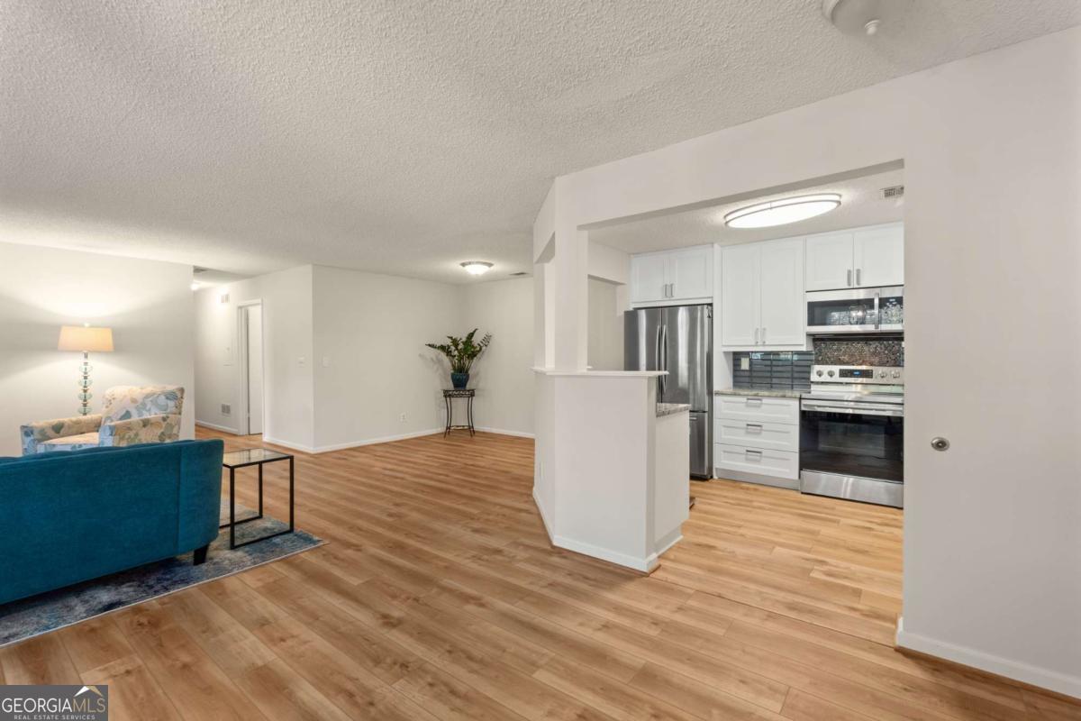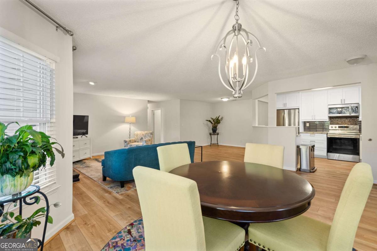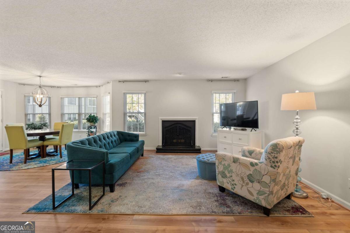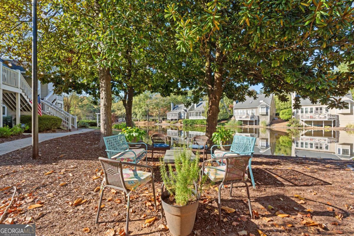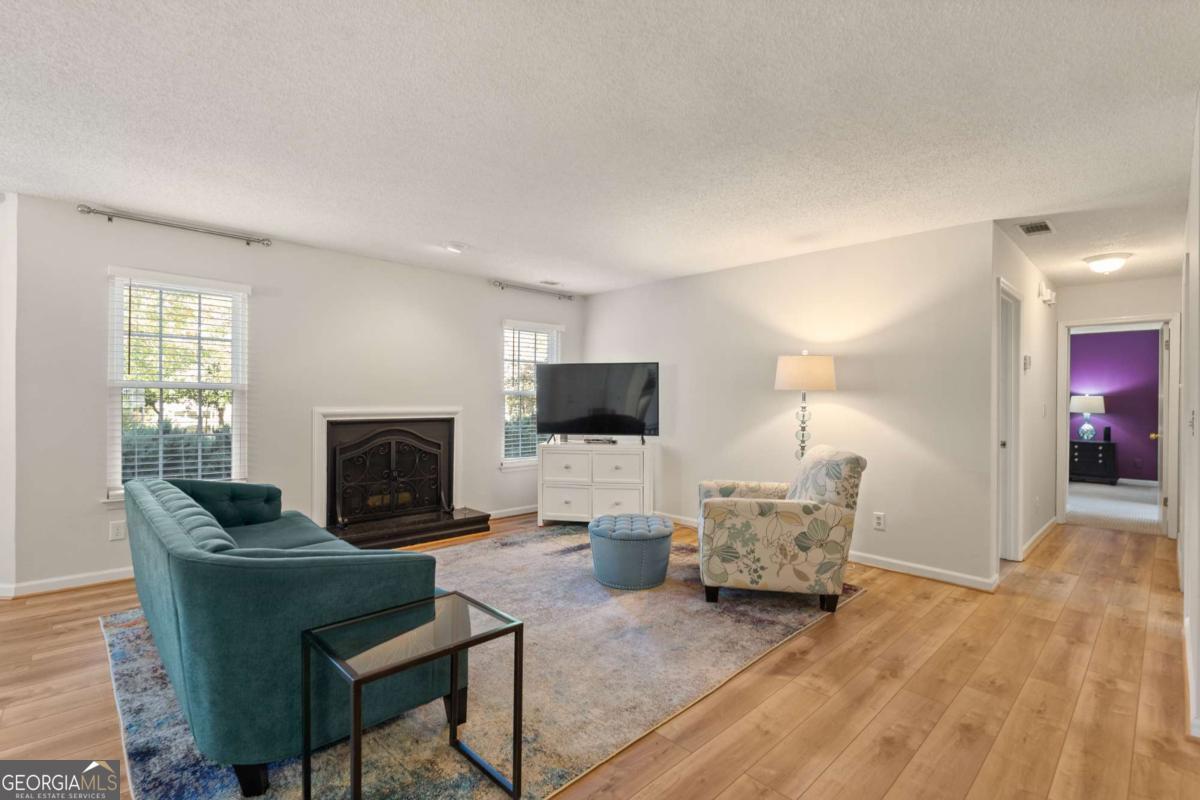 Welcome to Hidden Lake at Roswell, where modern comfort meets serene living. Located just minutes from DT Roswell's Canton St corridor with easy access to Ga-400, this community offers the perfect blend of quiet, low-traffic living and access to vibrant shopping, dining and entertainment. This beautifully updated 2-bedroom, 2-bath condo offers style, space, and convenience in one of Roswell's most sought-after communities. Step inside to find an inviting open floor plan with prefinished hardwood flooring mostly throughout, a cozy fireplace that anchors the open family room, and large windows that fill the home with natural light. The updated kitchen features crisp NEW white cabinetry, NEW stone countertops, tile backsplash, stainless-steel appliances, and a convenient breakfast bar - perfect for everyday living or entertaining. Linger in both the formal dining and casual eating space or use one as the flex space curated to your lifestyle. The primary suite provides a spacious retreat with a custom walk-in closet and updated private bath. Easily convert the owner's bath vanity back to dual sinks if needed. The split-bedroom layout ensures privacy for guests or a home office (if needed). Enjoy peaceful mornings or relaxing evenings on the patio with tranquil pond views- just close enough to enjoy ambient views of the neighborhood string lite lakeside seating. Move in ready with refrigerator, washer & dryer included! Residents of Hidden Lake also enjoy access to a pool, tennis courts, and walking areas surrounded by mature trees and well-kept grounds. Ample parking abounds for residents and their guest so you can simply enjoy entertaining. BEST OF ALL, this prime location is just minutes from downtown Roswell's shops, restaurants, and parks! Go a little farther north and you'll end up in DT Alpharetta. This is low maintenance living without compromise on location or lifestyle. Comee see the condo that checks all the boxes. You'll love calling 605 Mill Pond Rd HOME!