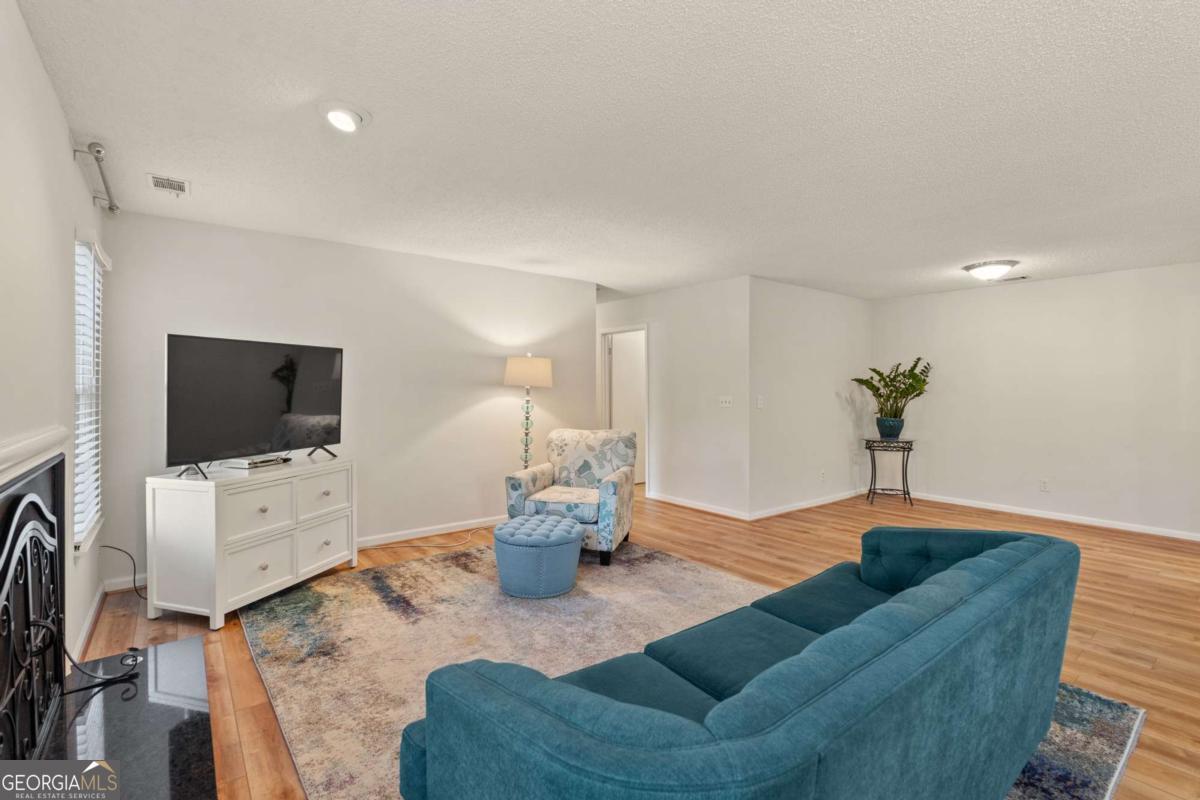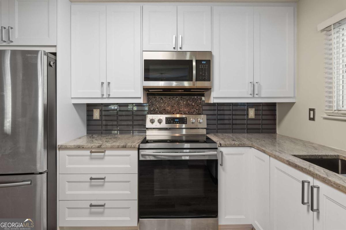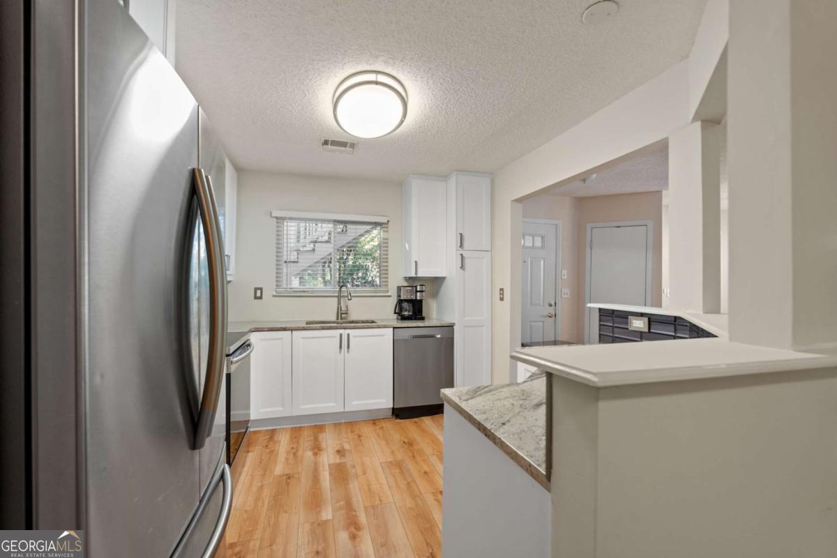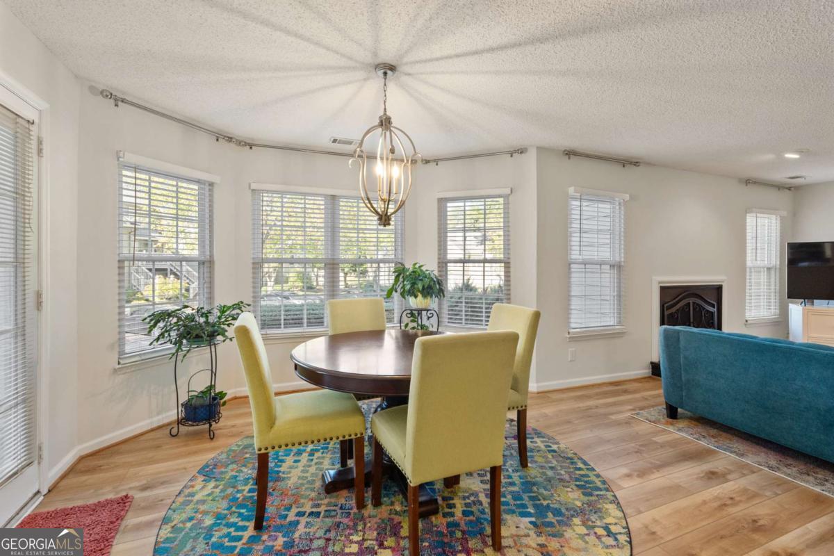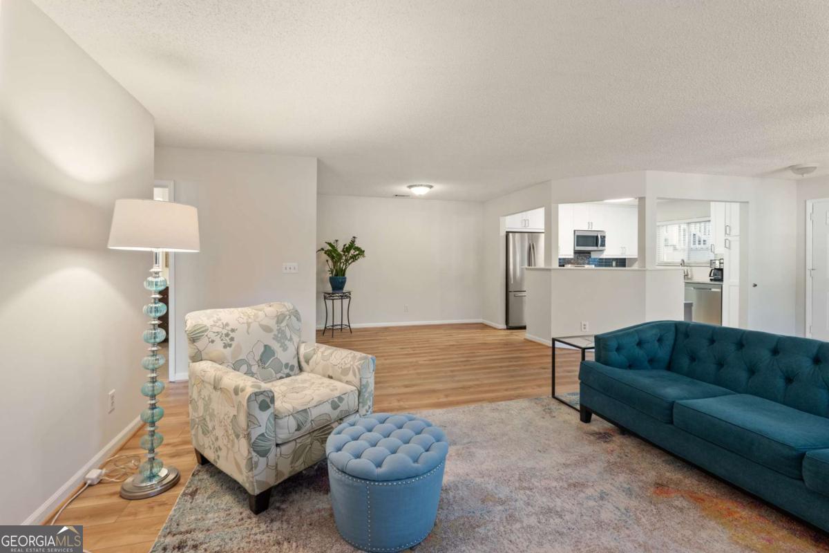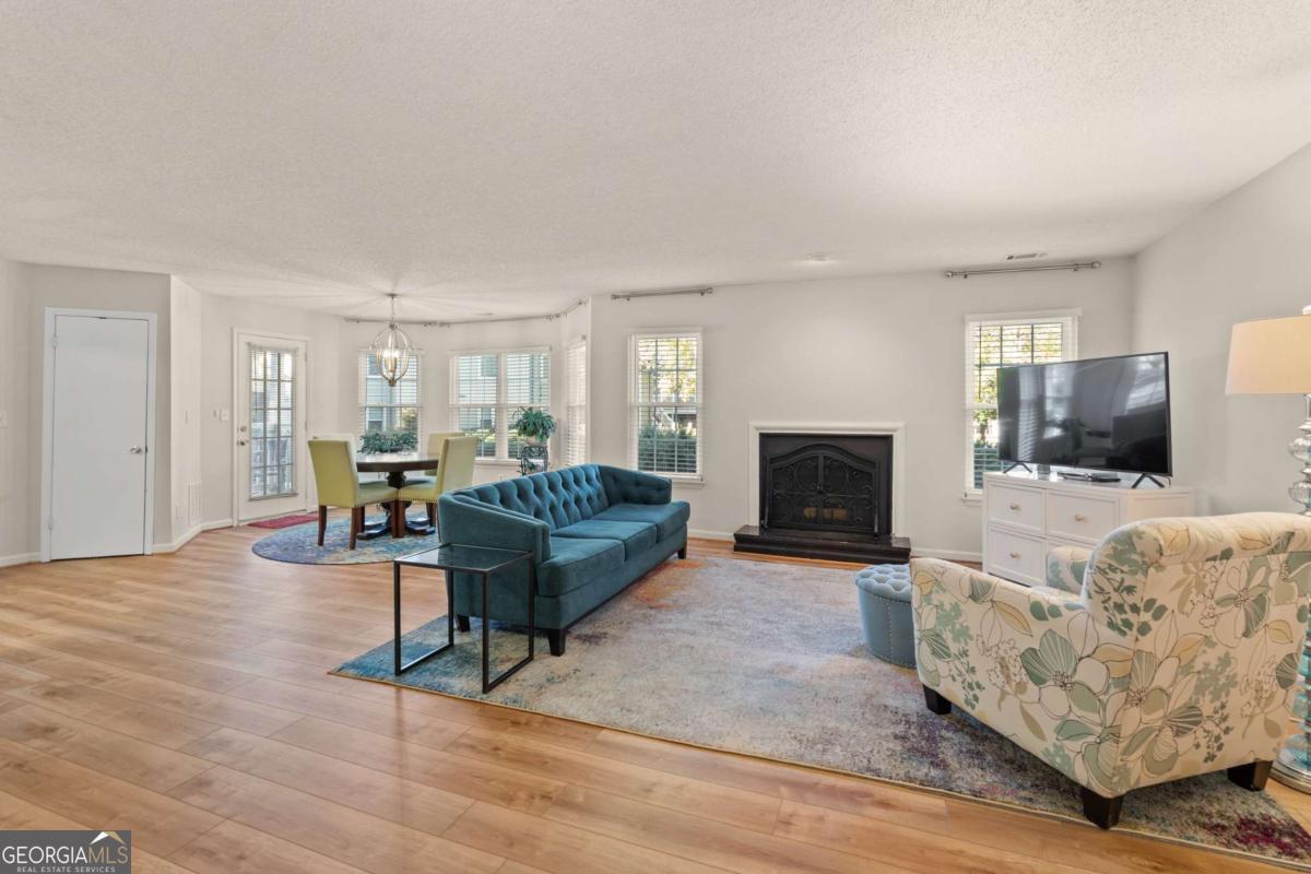 Welcome to Hidden Lake at Roswell, where modern comfort meets serene living. Located just minutes from DT Roswell's Canton St corridor with easy access to Ga-400, this community offers the perfect blend of quiet, low-traffic living and access to vibrant shopping, dining and entertainment. This beautifully updated 2-bedroom, 2-bath condo offers style, space, and convenience in one of Roswell's most sought-after communities. Step inside to find an inviting open floor plan with prefinished hardwood flooring mostly throughout, a cozy fireplace that anchors the open family room, and large windows that fill the home with natural light. The updated kitchen features crisp NEW white cabinetry, NEW stone countertops, tile backsplash, stainless-steel appliances, and a convenient breakfast bar - perfect for everyday living or entertaining. Linger in both the formal dining and casual eating space or use one as the flex space curated to your lifestyle. The primary suite provides a spacious retreat with a custom walk-in closet and updated private bath. Easily convert the owner's bath vanity back to dual sinks if needed. The split-bedroom layout ensures privacy for guests or a home office (if needed). Enjoy peaceful mornings or relaxing evenings on the patio with tranquil pond views- just close enough to enjoy ambient views of the neighborhood string lite lakeside seating. Move in ready with refrigerator, washer & dryer included! Residents of Hidden Lake also enjoy access to a pool, tennis courts, and walking areas surrounded by mature trees and well-kept grounds. Ample parking abounds for residents and their guest so you can simply enjoy entertaining. BEST OF ALL, this prime location is just minutes from downtown Roswell's shops, restaurants, and parks! Go a little farther north and you'll end up in DT Alpharetta. This is low maintenance living without compromise on location or lifestyle. Comee see the condo that checks all the boxes. You'll love calling 605 Mill Pond Rd HOME!