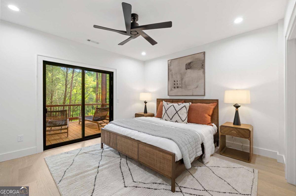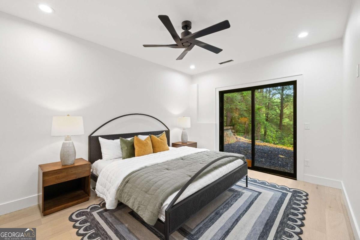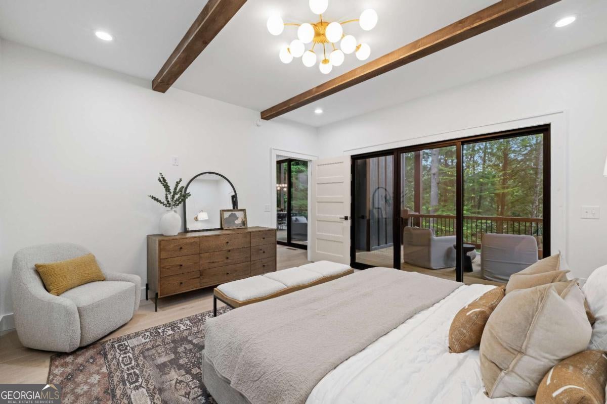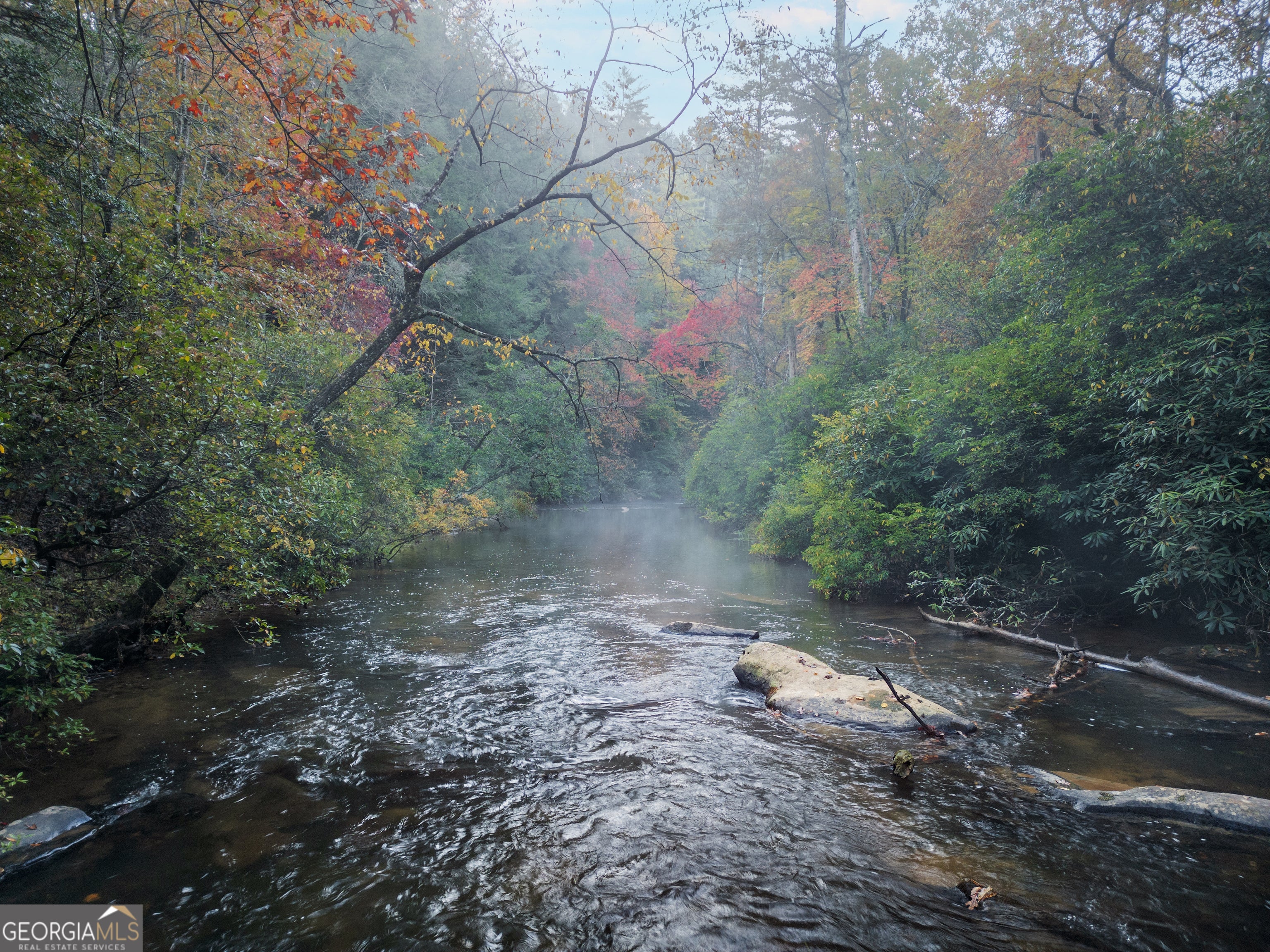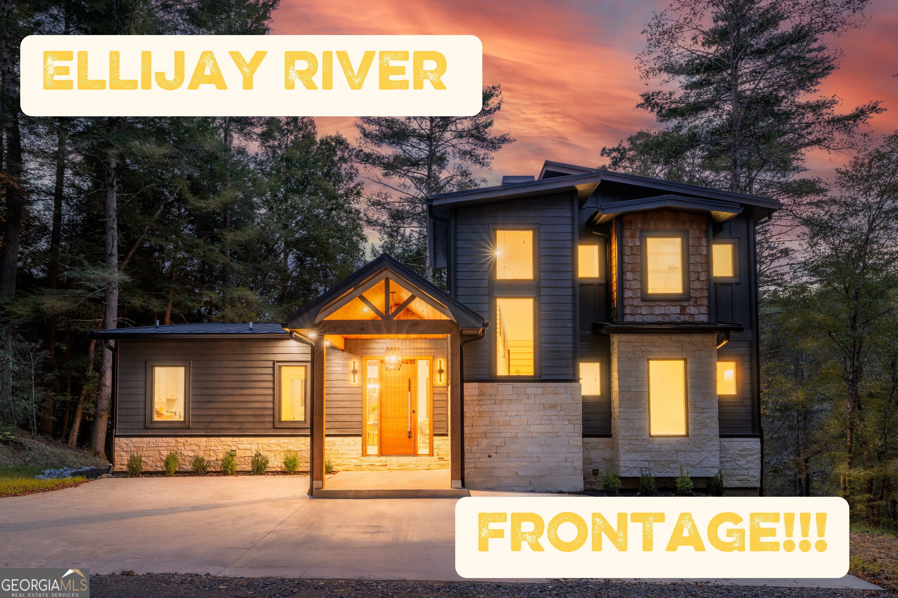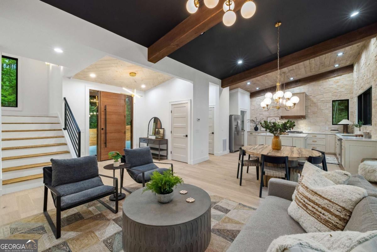 Mountain modern meets contemporary luxury on the banks of the Ellijay River. Set within Goose Island Hideaway, an intimate, gated community, this brand-new fully furnished residence is a masterpiece of luxury & modern design, set on a secluded .9-acre lot boasting over 150 ft of private river frontage. With trout fishing just steps off the back & the soothing sounds of the rushing river surrounding the home, you can't help but relax. As you step through the striking solid Mahogany front door, you'll immediately appreciate the meticulous attention to detail throughout the home. The main level features an open concept floor plan, highlighting stunning exposed wooden beams, Taj Mahal natural quartzite countertops & a genuine Texas Limestone fireplace & kitchen backsplash. Custom wood cabinetry and European White Oak flooring flow seamlessly throughout the residence, exuding sophistication & warmth. The main living area extends to expansive deck space, perfect for entertaining, with additional dining & lounge areas, as well as a cozy fireplace - all overlooking the picturesque river. The home offers two luxurious primary suites, one on the main level & another upstairs. Both suites feature opulent soaking tubs, double custom vanities & custom tile showers. The upstairs primary suite further indulges with a private balcony, perfect for enjoying the serene views & sounds. The terrace level presents two additional guest rooms, two well-appointed bathrooms & extra living space, promising comfort & privacy for visitors. The terrace deck provides even more entertaining space and includes a staircase for easy access to the river, making it an ideal spot for relaxation. Offered fully furnished with high-end, professionally designed interiors, this exquisite home is move-in ready - all you need to bring is your fishing pole. Experience the best of luxury mountain living in this remarkable home, where every detail has been curated for your comfort and enjoyment.