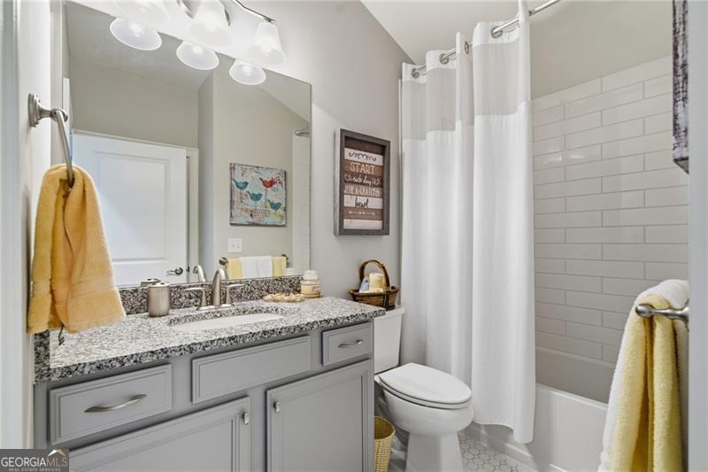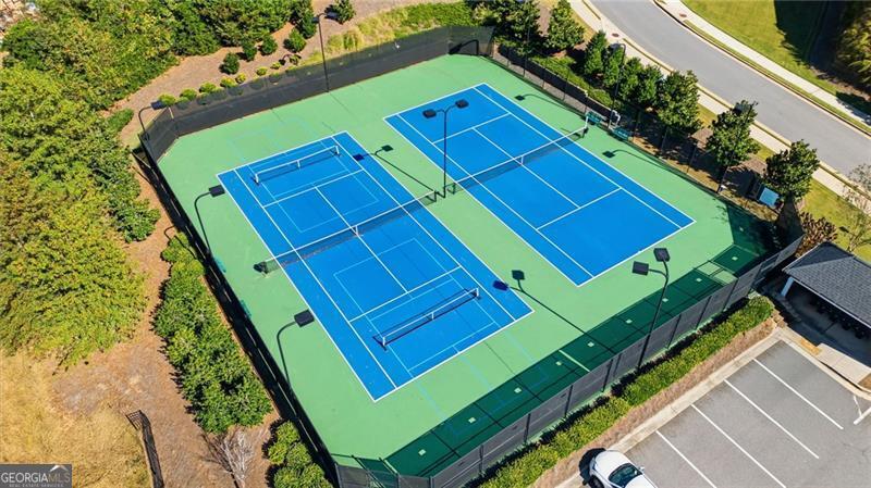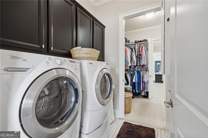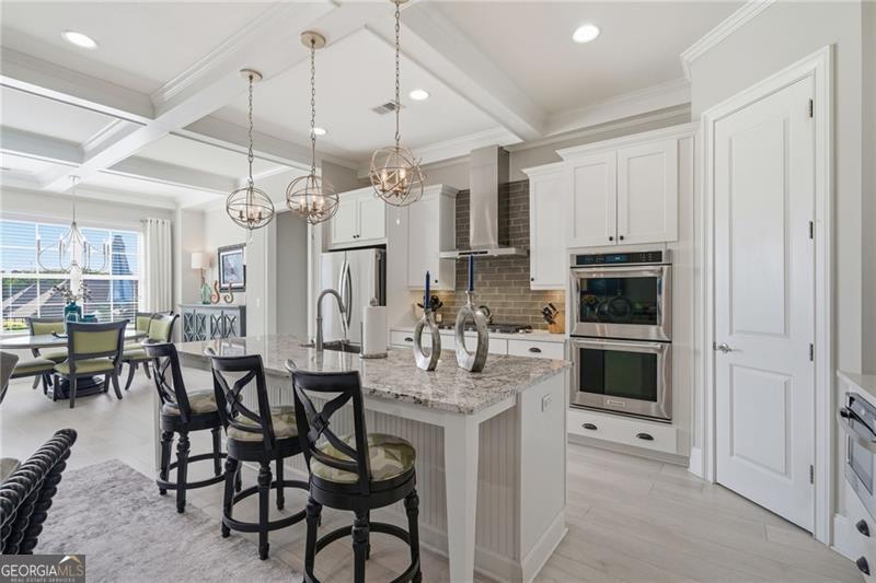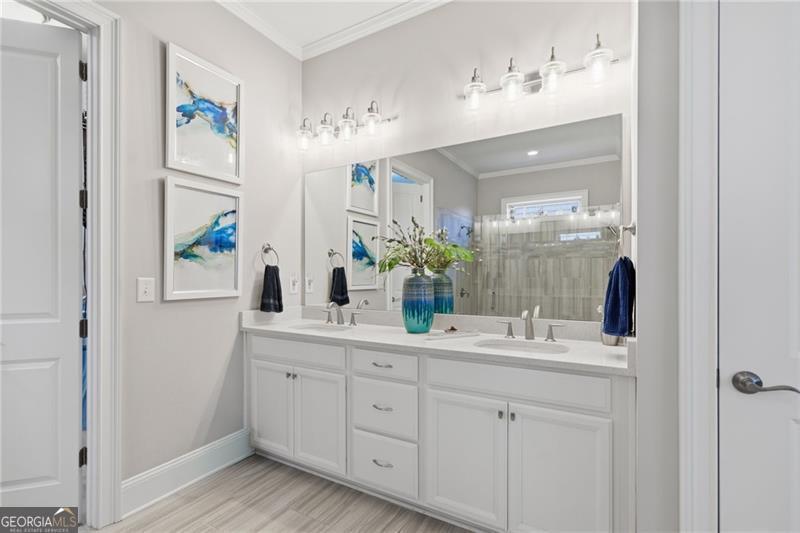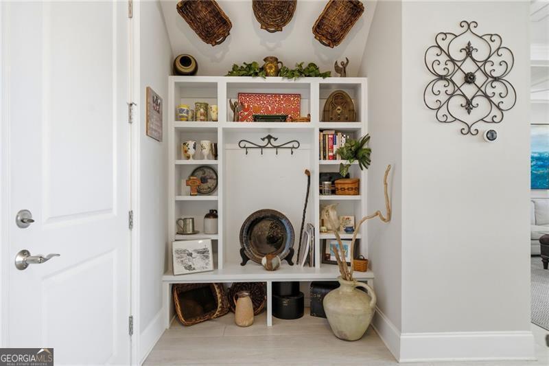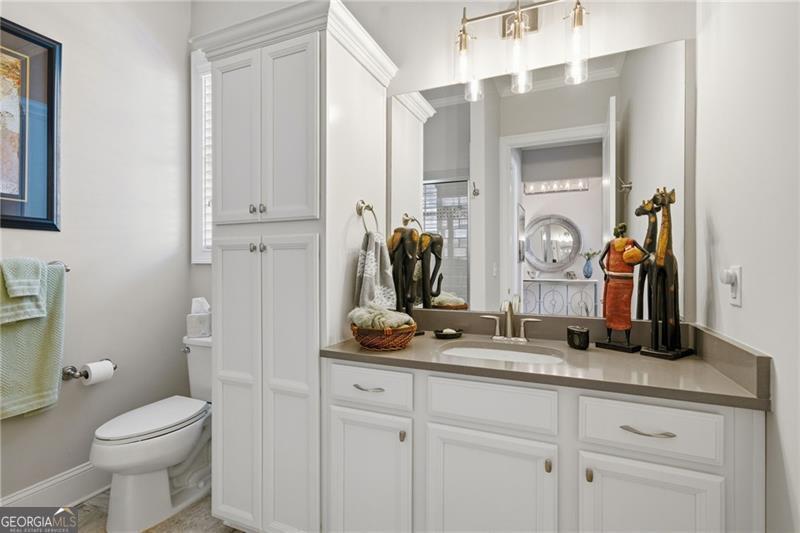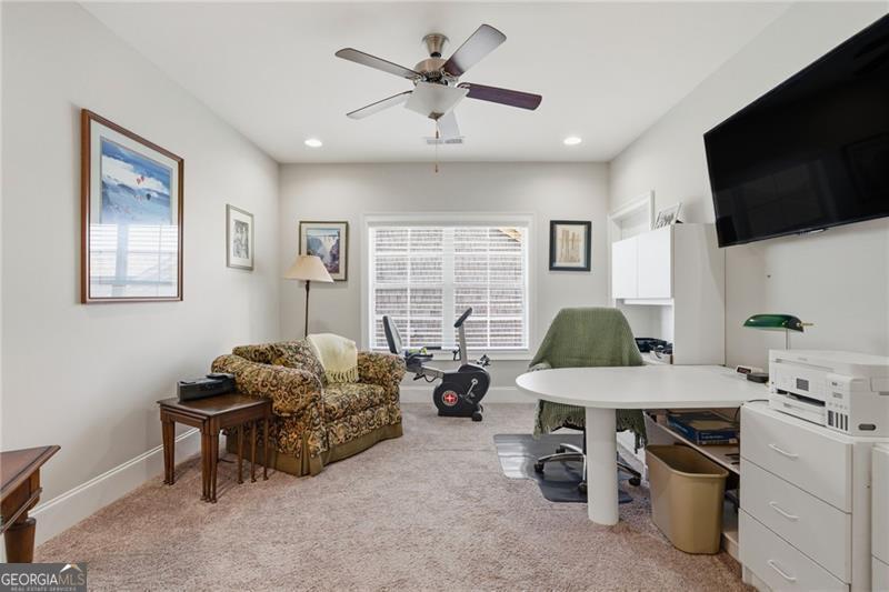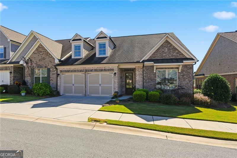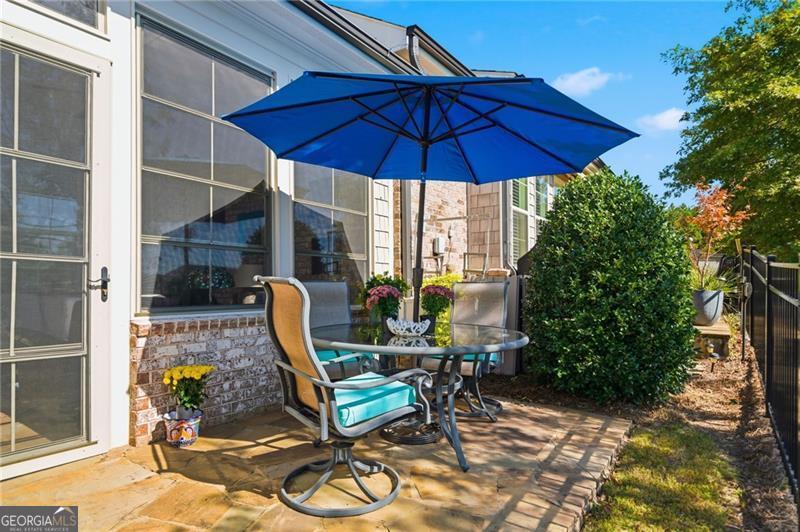 Impeccably Maintained Home with Premium Park View in Coveted Jim Chapman Gated Community This beautifully cared-for home sits on a prime lot in the highly desirable Jim Chapman Active Adult gated community, offering tranquil views overlooking Chattahoochee Pointe Park. A welcoming covered flagstone and brick front porch opens to a spacious foyer and an open-concept layout with 10-foot ceilings, gleaming hardwood floors, plantation shutters across the front, and abundant natural light streaming through three sides of this desirable end unit. The chef's kitchen is a dream featuring 42-inch high-end cabinetry, generous granite and quartz counter space, a wall double oven, five-burner gas cooktop, drawer microwave, and a large stainless farmhouse undermount sink. A large custom china and crystal closet provides elegant and practical storage, ideal for fine serveware, linens, silver, or even kitchen appliances. Enjoy bar seating at the island or gather in the bright dining area beneath the coffered ceiling that extends into the great room. The great room offers a warm, elegant atmosphere with a gas fireplace, built-in bookcase, and access to the sunroom, which features state-of-the-art windows providing beautiful, year-round views. Step outside to the extended flagstone patio one of the finest outdoor living spaces in the community perfectly positioned to overlook the park and enjoy peaceful mornings or relaxing evenings. The primary suite on the main level is spacious and inviting, with hardwood flooring extended from the living areas, a luxurious ensuite bath showcasing an oversized frameless glass shower with two shower heads and a bench, a linen closet, and a large walk-in closet with a custom organization system. Direct access to the laundry room from the primary closet adds everyday convenience. A guest bedroom and upgraded full bath on the main level provide comfort and privacy for visitors, while a drop zone with built-in bench at the garage entry adds both function and charm. Hardwood treads lead to the upper level, which offers 9-foot ceilings, two spacious bedrooms connected by a Jack-and-Jill bath, one featuring a huge walk-in closet, plus hallway attic access for additional storage. The main level is wheelchair accessible, ensuring comfort and ease of living for all.