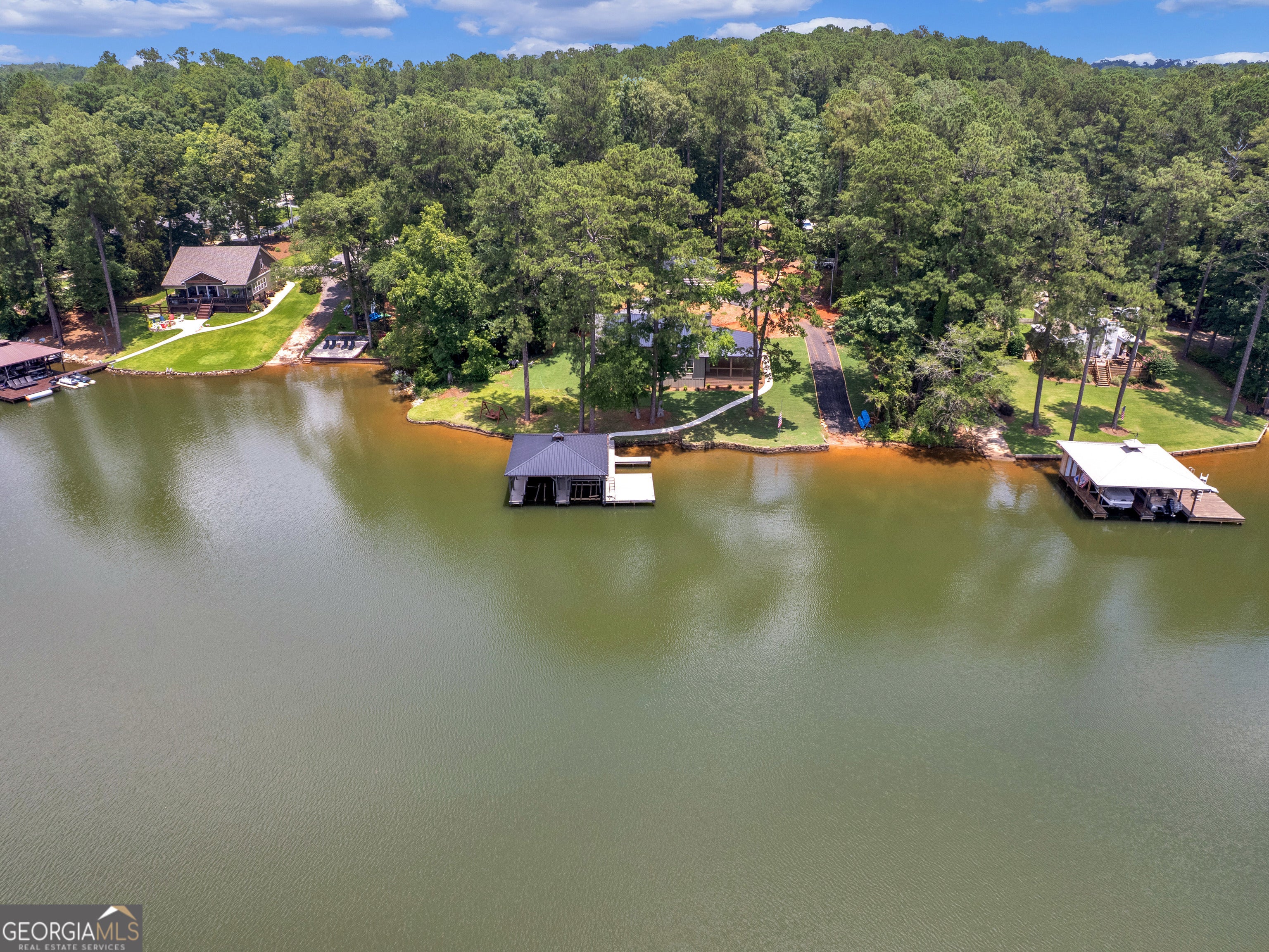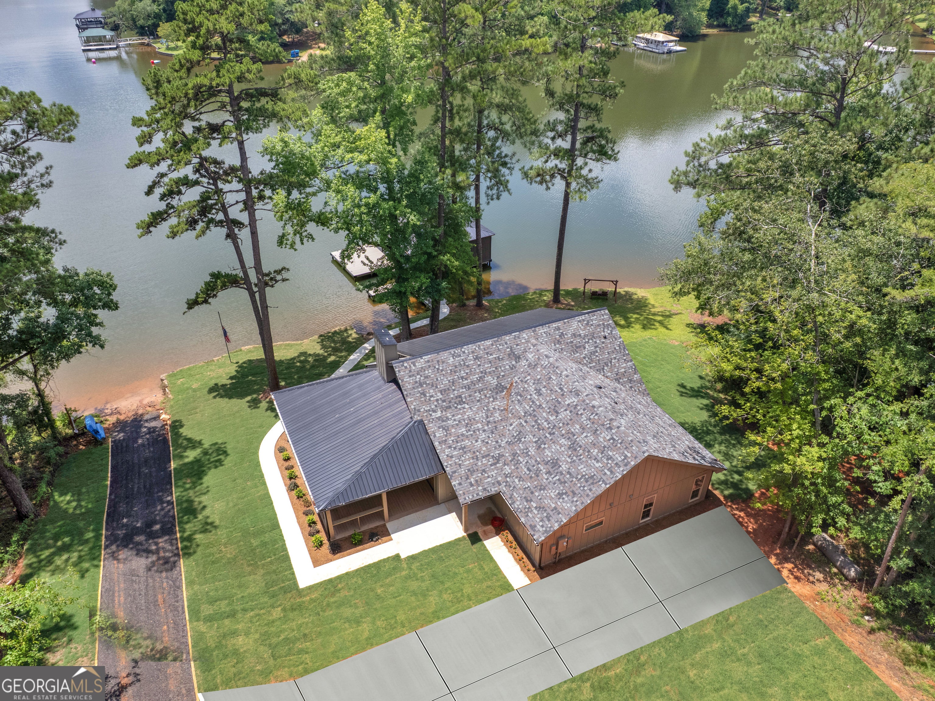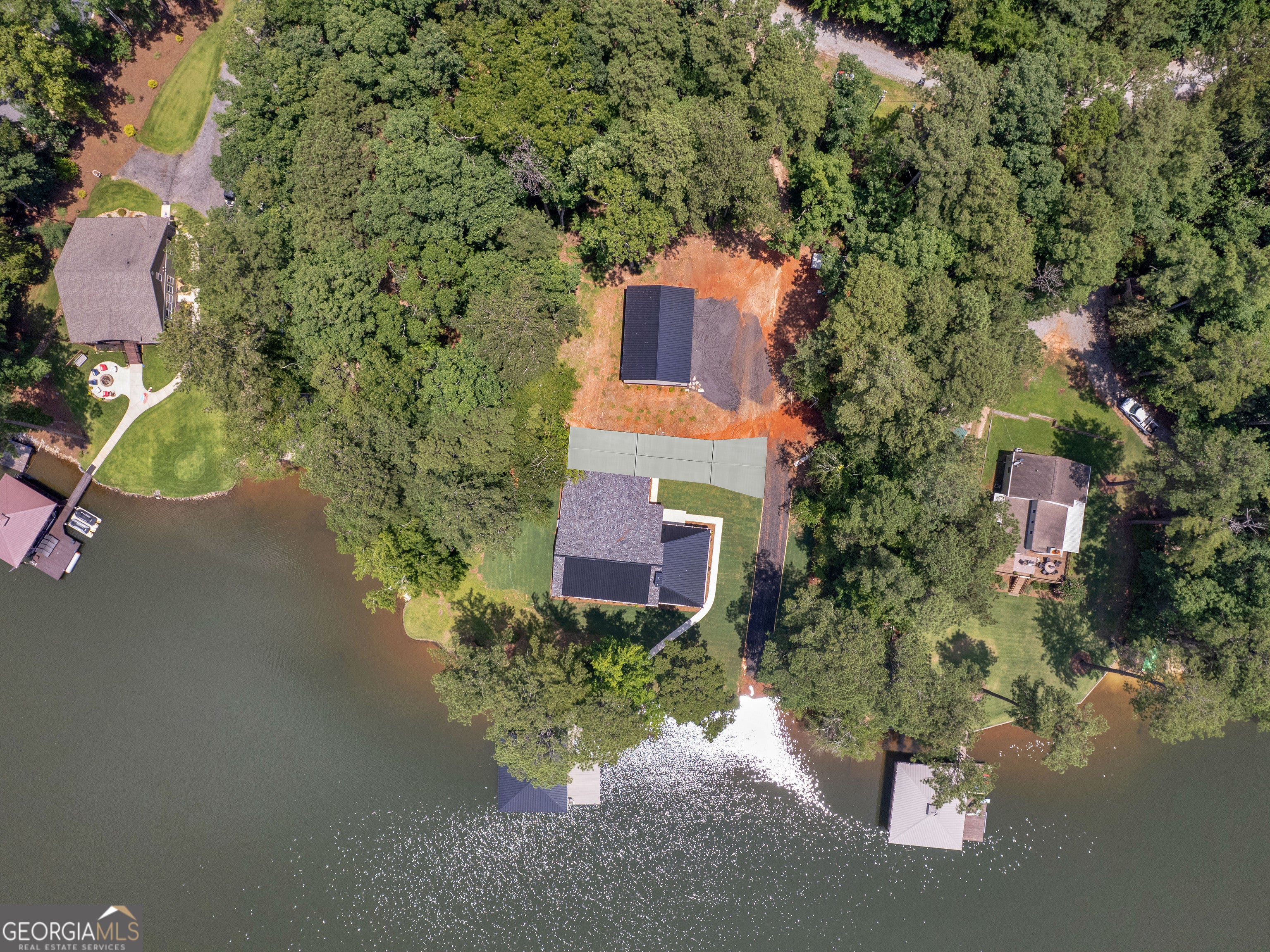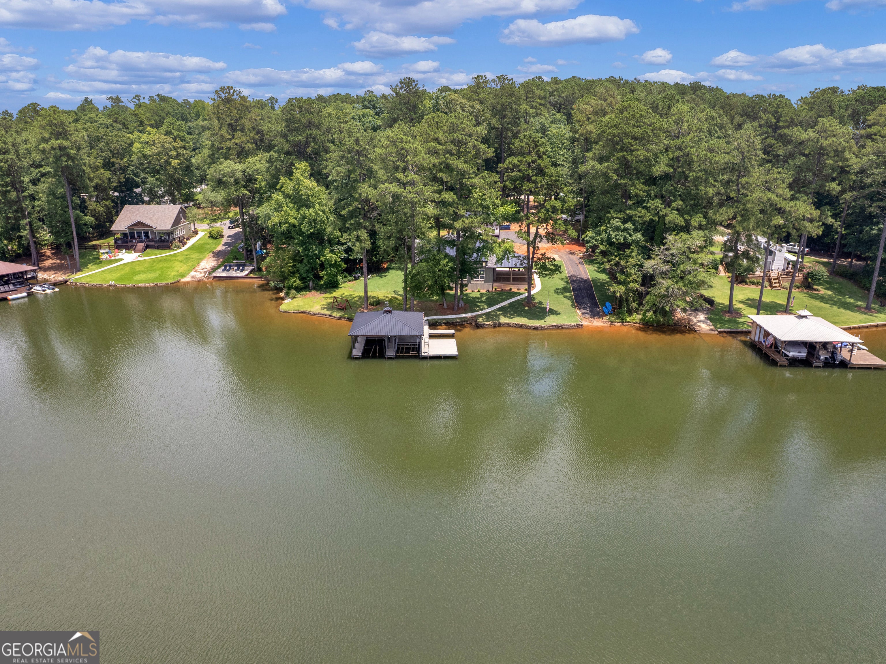 PRICED BELOW RECENT APPRAISAL IN HAND! EXORBITANT AMOUNT OF EQUITY FOR A BUYER! Brand new construction situated on deep water up in a cove on desired Jackson Lake. Situated on a GA Power Lease lot w/ amazing views from all rooms of the home including the secondary guest rooms. Inside features approx. 2,000+/- sq. ft, open concept floor plan w/large kitchen overlooking spacious living room & dining room, 3 bedrooms on the main & 1 bedroom upstairs. Windows all along the front of the home allow for ample lighting thru out the main living area & pristine views of the water. The kitchen features high end finishes such as professional SS 6 burner cooktop, vented exhaust hood, double wall oven, not 1 but 2 french door refrigerators w/freezers, walk in pantry w/cabinets & shelving, 10 ft island w/work station & quartz c'tops & backsplash. LVT flooring thru out entire home allows for easier maintenance. Fireside living room featuring wood beams on the ceiling. Spacious laundry room w/cabinets, folding/hanging area & cleaning supply closet. Relax in the primary suite offering an electric fireplace & more water views. Step into the en-suite bath boasting a double vanity w/quartz c'tops, tiled walk in shower & free standing soaking tub. As if this isn't enough, outside showcases an expansive covered deck perfect for relaxing and/or entertaining while o'looking the lake. Board & Batten exterior finish, double covered dock, approx. 300ft of water frontage, two bay metal shop on a slab & much more! This home is considered a Green Home w/features such as a 16 Plus Sear Heating & Air Unit, Spray foam insulation in walls & ceilings, energy efficient appliances, tankless hot water heater & lifetime shingles and metal roof. Come take a look at this custom build today! ****Please note original structure was torn down except two walls and new structure has been built. Tax records are not accurate.****