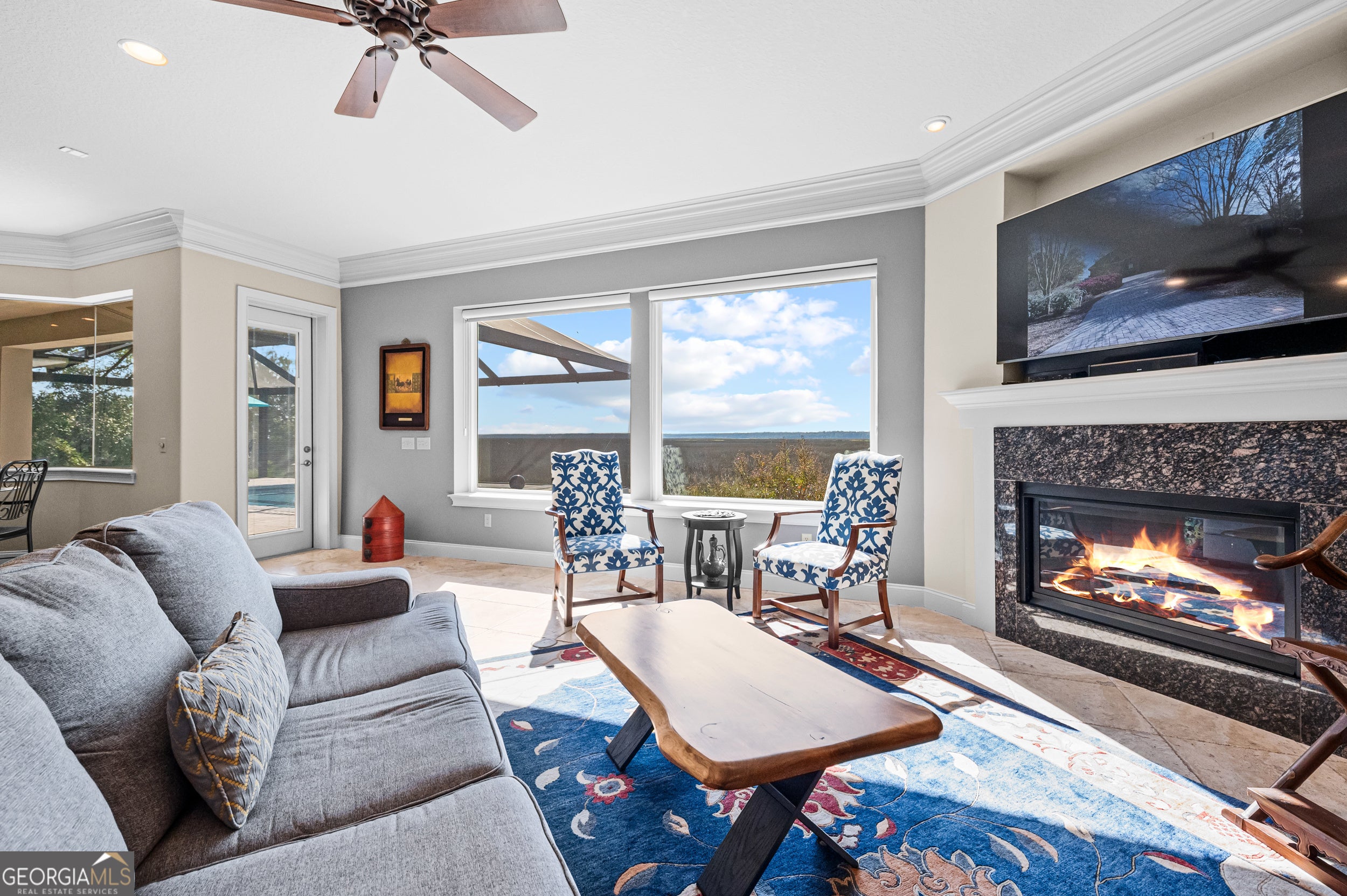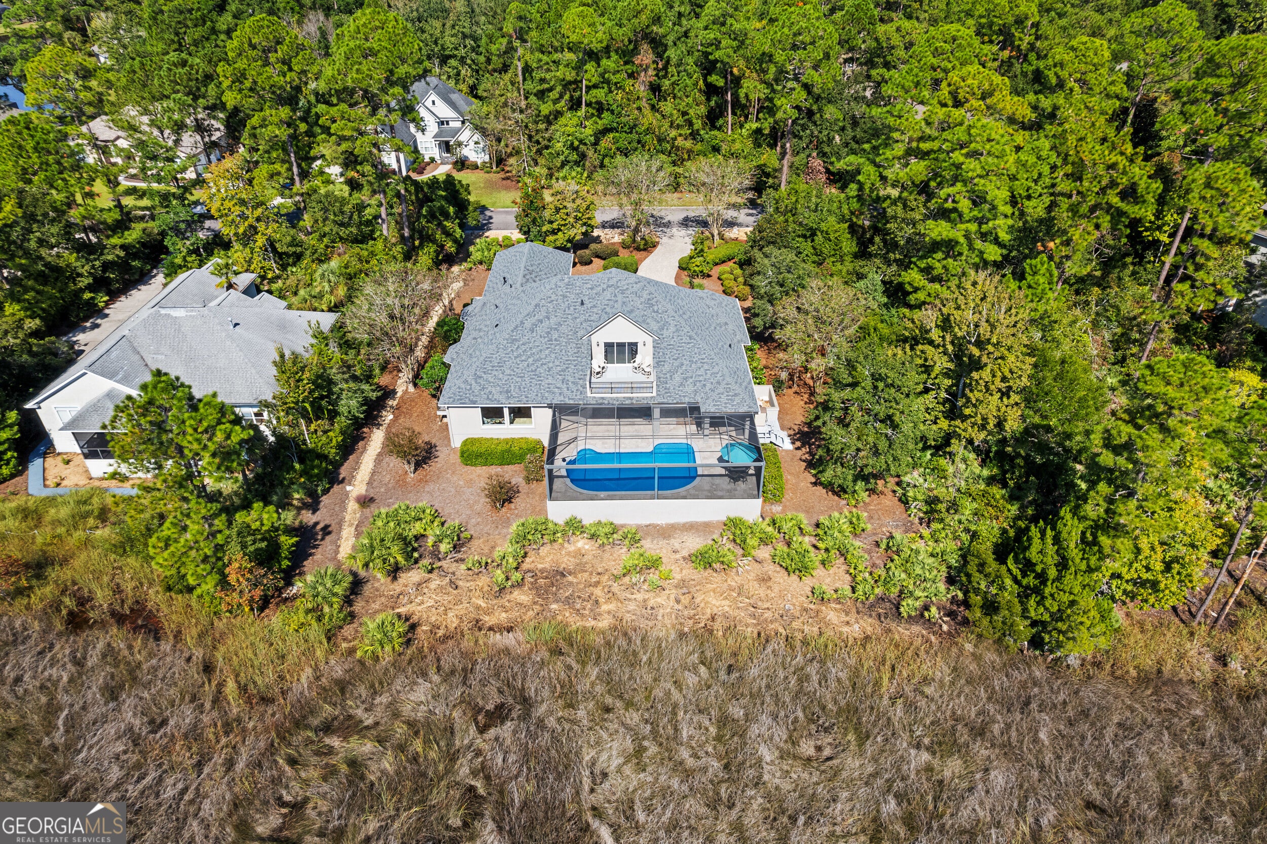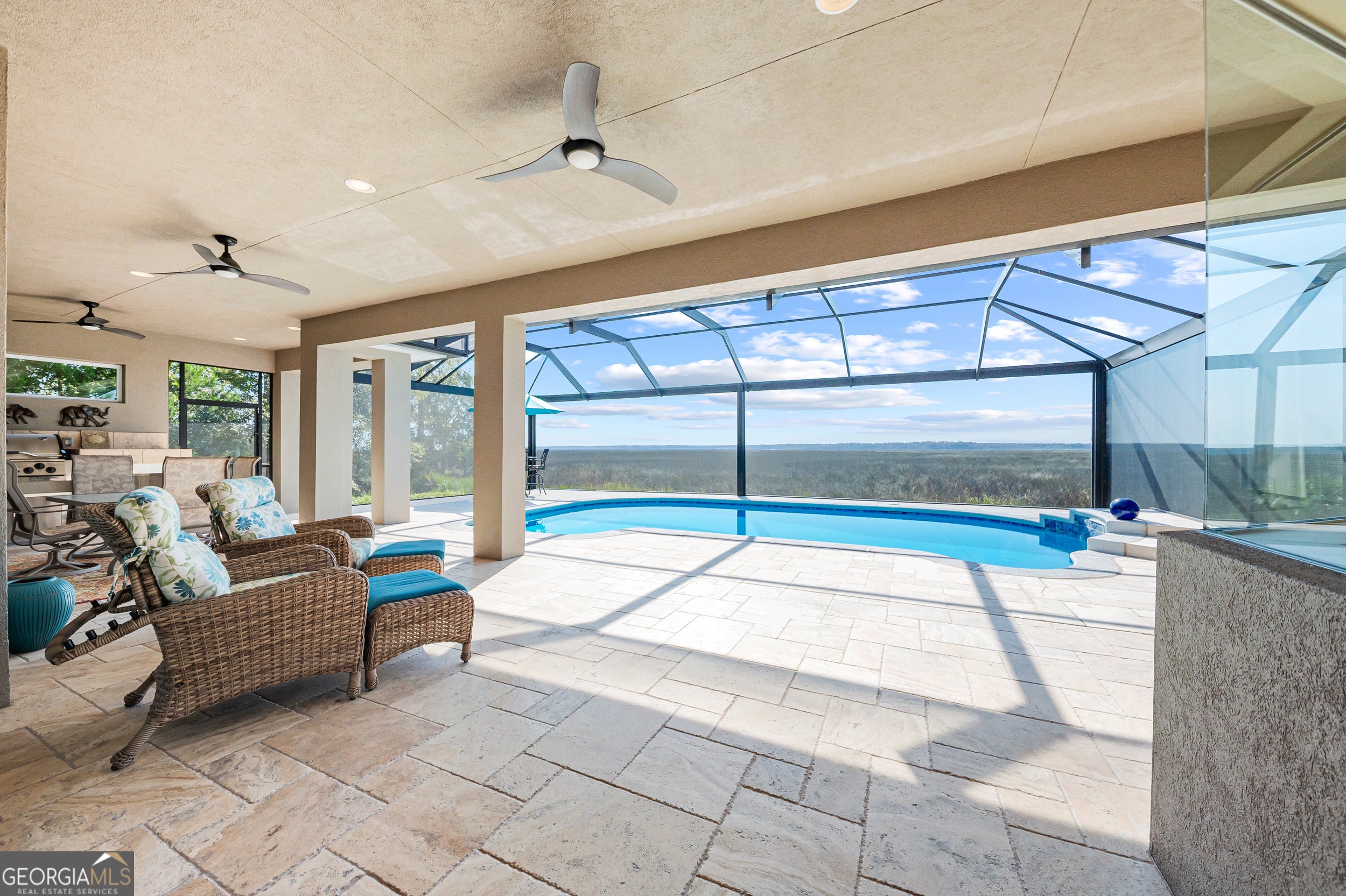 Experience serene marsh front living in this durable, energy-efficient custom home built by Jacksonville-based builder James (Jim) L. Pelkey. Thoughtfully designed and constructed to maximize energy efficiency and long-term durability, this 4-bedroom, 4-bath residence (plus office) showcases quality craftsmanship and attention to detail throughout. Step inside to discover spacious, light-filled living areas accented by tray ceilings and elegant finishes. The chef's kitchen features a gas range with hood, center island, wine fridge, and a breakfast nook framed by panoramic windows overlooking the marsh. The primary suite offers a peaceful retreat with two French doors leading in, dual walk-in closets with built-ins, a luxurious jacuzzi tub, double vanity, and sliding glass doors opening directly to the screened pool area. Outdoors, enjoy resort-style living with a heated saltwater pool, resurfaced in 2025, surrounded by cool decking and a new panoramic screened enclosure. The outdoor kitchen-complete with a natural gas grill and fireplace-makes entertaining effortless against the backdrop of stunning marsh views. Upstairs, energy-efficient details continue with insulated flooring for sound absorption, energy film on sliding doors leading to a balcony overlooking the marsh, and double-paned windows throughout. Additional highlights include a 3-car garage with and an attic with built-in shelving, double-paned windows throughout the home, and Logix ICF construction. A rare opportunity to own a strongly built, energy-smart coastal home that perfectly blends functionality, efficiency, and marshfront beauty.