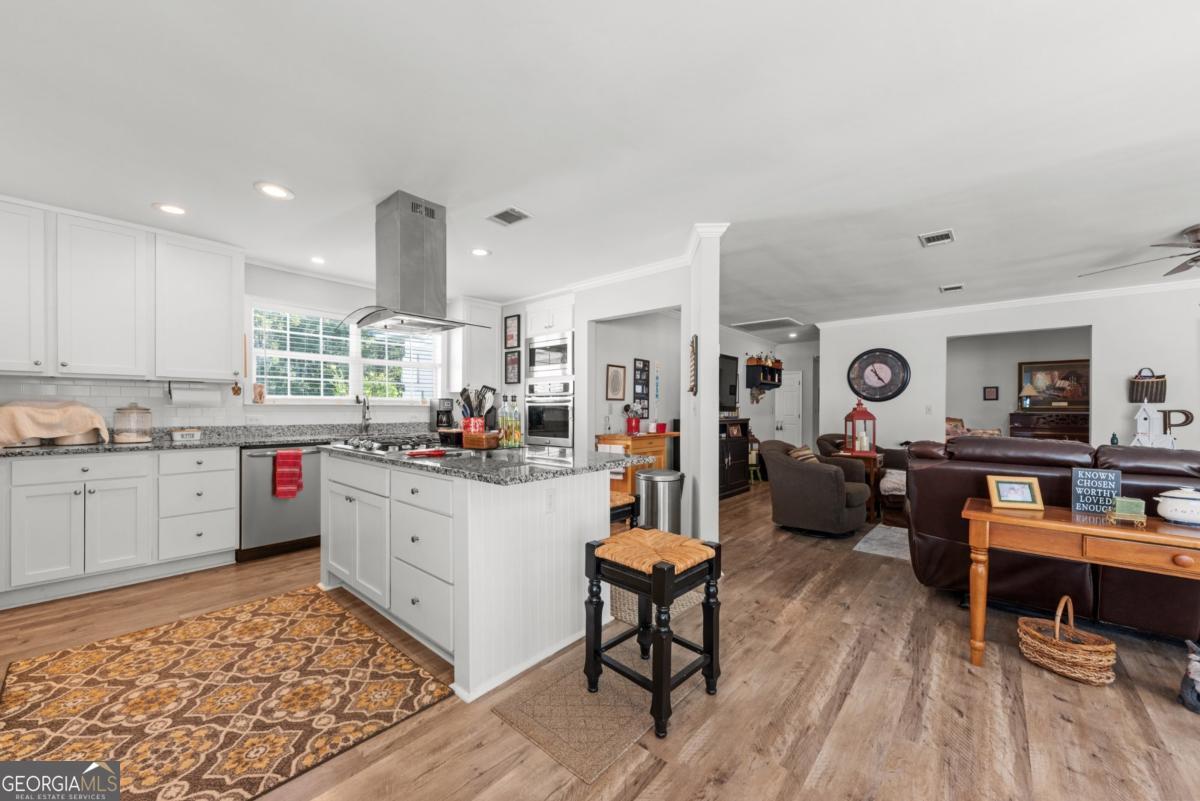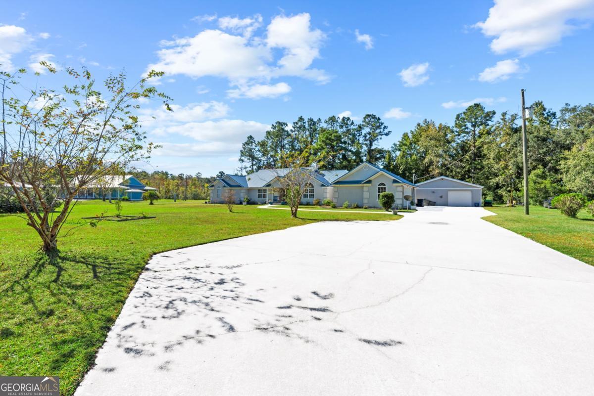 Spacious North Camden County Home on Over an Acre! Nestled on over an acre in the highly desirable North End of Camden County, this beautiful property offers 3,729 square feet of living space with an attached two-car garage plus a detached workshop/garage - perfect for projects, storage, or hobbies. The exterior features charming tabby siding and a blue metal roof, creating a timeless coastal look. Conveniently located near Exit 26, you'll enjoy easy access to I-95, just 16.4 miles from FLETC and only 5.8 miles from local grocery stores. From one of the drone views, you can even spot the Port of Brunswick and the iconic Sidney Lanier Bridge in the distance. Come inside to a spacious, open entertainment area featuring wood-look flooring, a stone-front fireplace, recessed lighting, and elegant crown molding. The open layout provides endless possibilities for living, dining, and hosting. The primary suite offers a luxurious retreat with a large tiled shower, a soaking tub. There is also an expansive laundry/pantry area conveniently located off the garage. Extra storage room in the attached garage. Enjoy outdoor living year-round on the screened-in back porch complete with roller shades, ideal for relaxing and entertaining. With space, style, and functionality, this home combines country charm with modern comfort - all just minutes from the conveniences of Kingsland, St. Marys, and Brunswick. Schedule today to see this home!