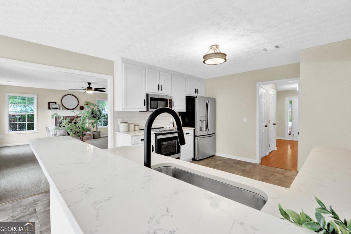 Newly renovated 4 bedroom 2.5 bathroom home in Grayson Manor. Covered front porch greets you as you enter into this thoughtfully updated home. You can have peace of mind knowing this home comes with a New Roof, 2 New HVAC units and a New Water Heater. Finishes include Hardwood Flooring, New Carpet in the bedrooms, New Quartz Countertops, New Tile Backsplash, New Appliances, and White Cabinets with New Pulls and Handles, New Lighting throughout, New Interior Paint throughout, New Plumbing Fixtures & More! This floor plan features a generous size living space on the main floor and 4 large bedrooms upstairs. From the foyer you have the spacious living room with a brick fireplace and oversized windows. The updated kitchen, breakfast & family rooms flow wonderfully across the rear of the home with plenty of windows overlooking the level fenced in back yard. Upstairs you find large secondary bedrooms and the oversized master bedroom with the master bathroom that features his and her vanities with New Faucets, a separate shower and garden tub with New Faucets/Handles and a walk in closet. Beyond the Updated Home & Community Amenities, this location is fantastic, just a couple miles from downtown Loganville and all it has to offer: the shops, restaurants, parks & desired schools.